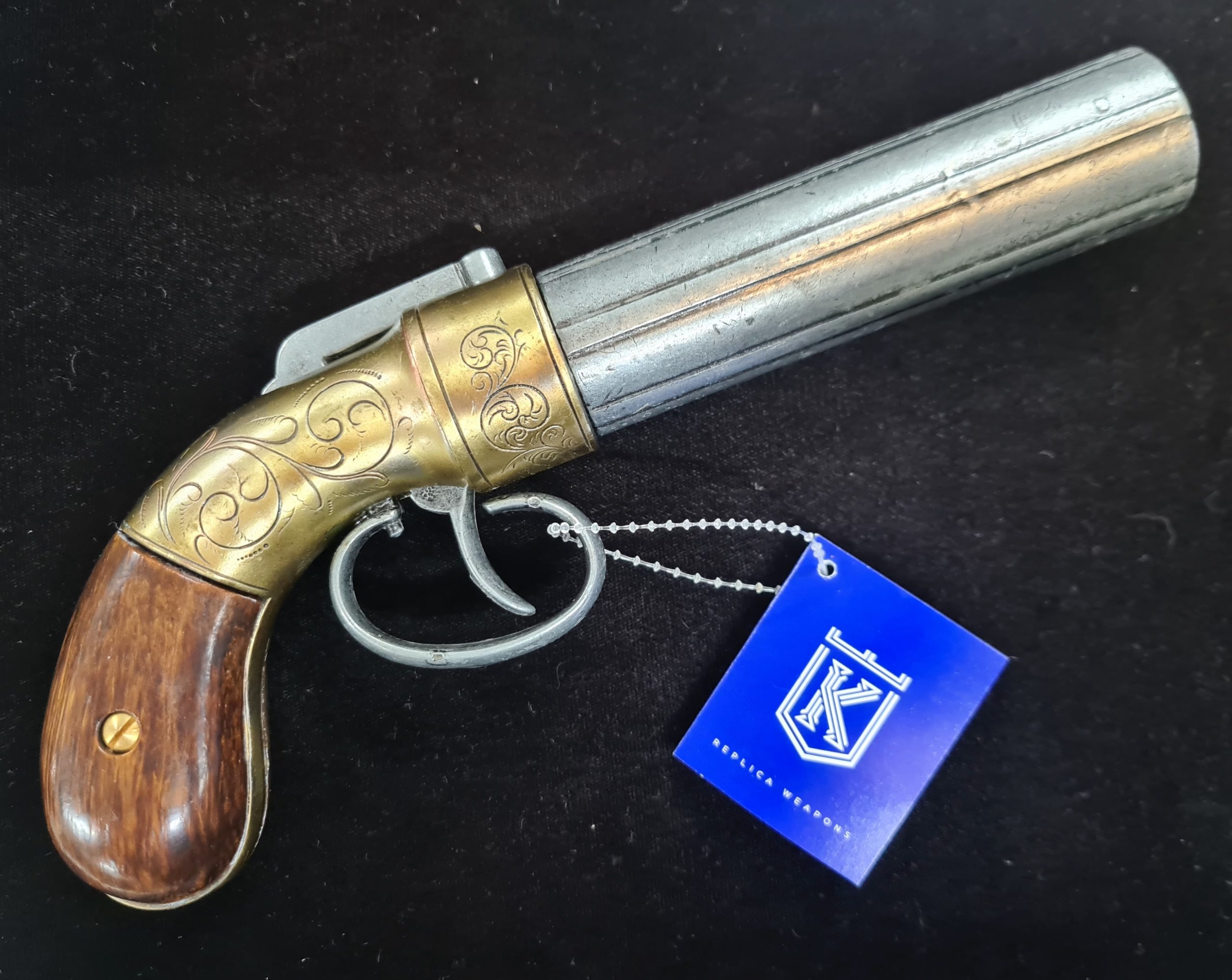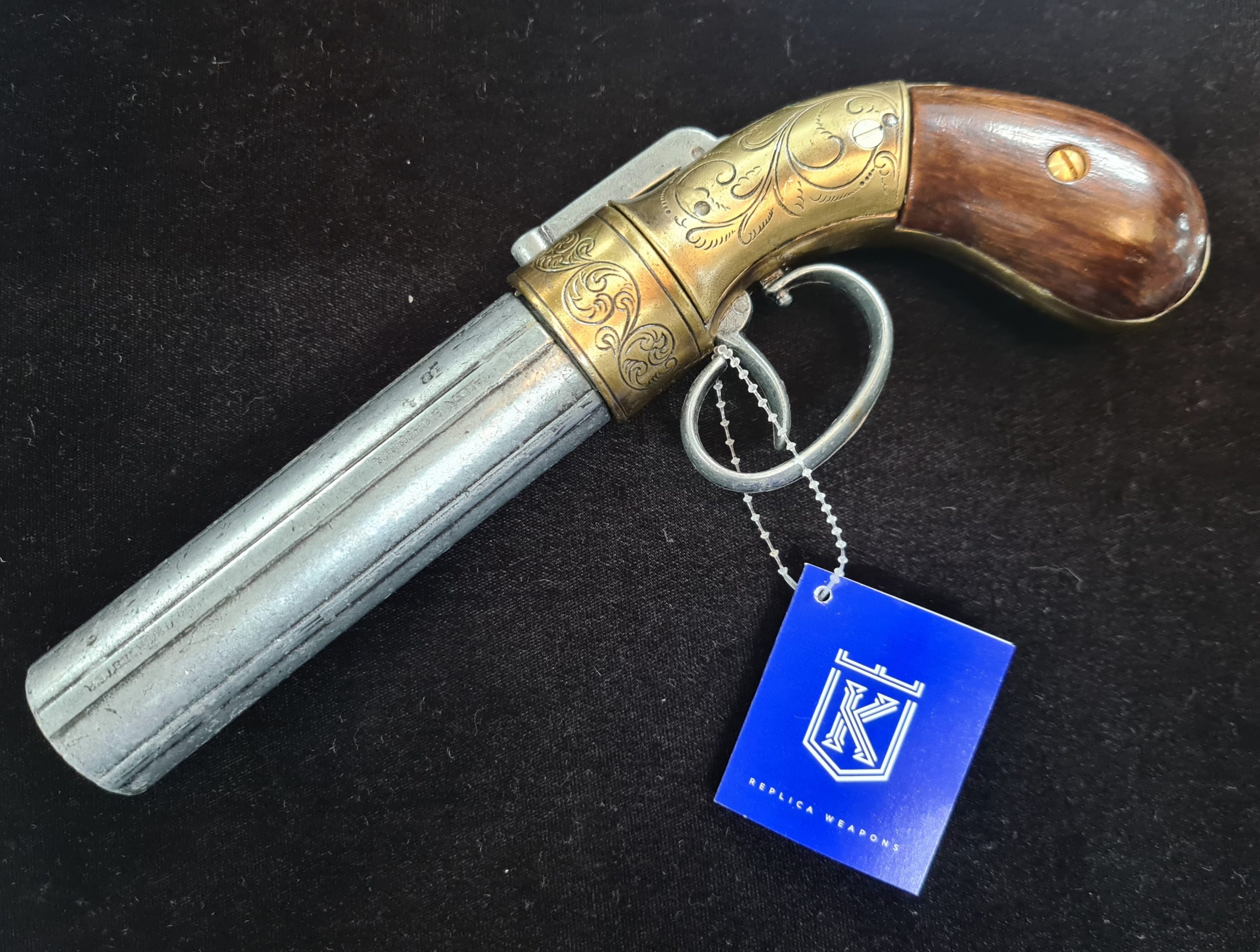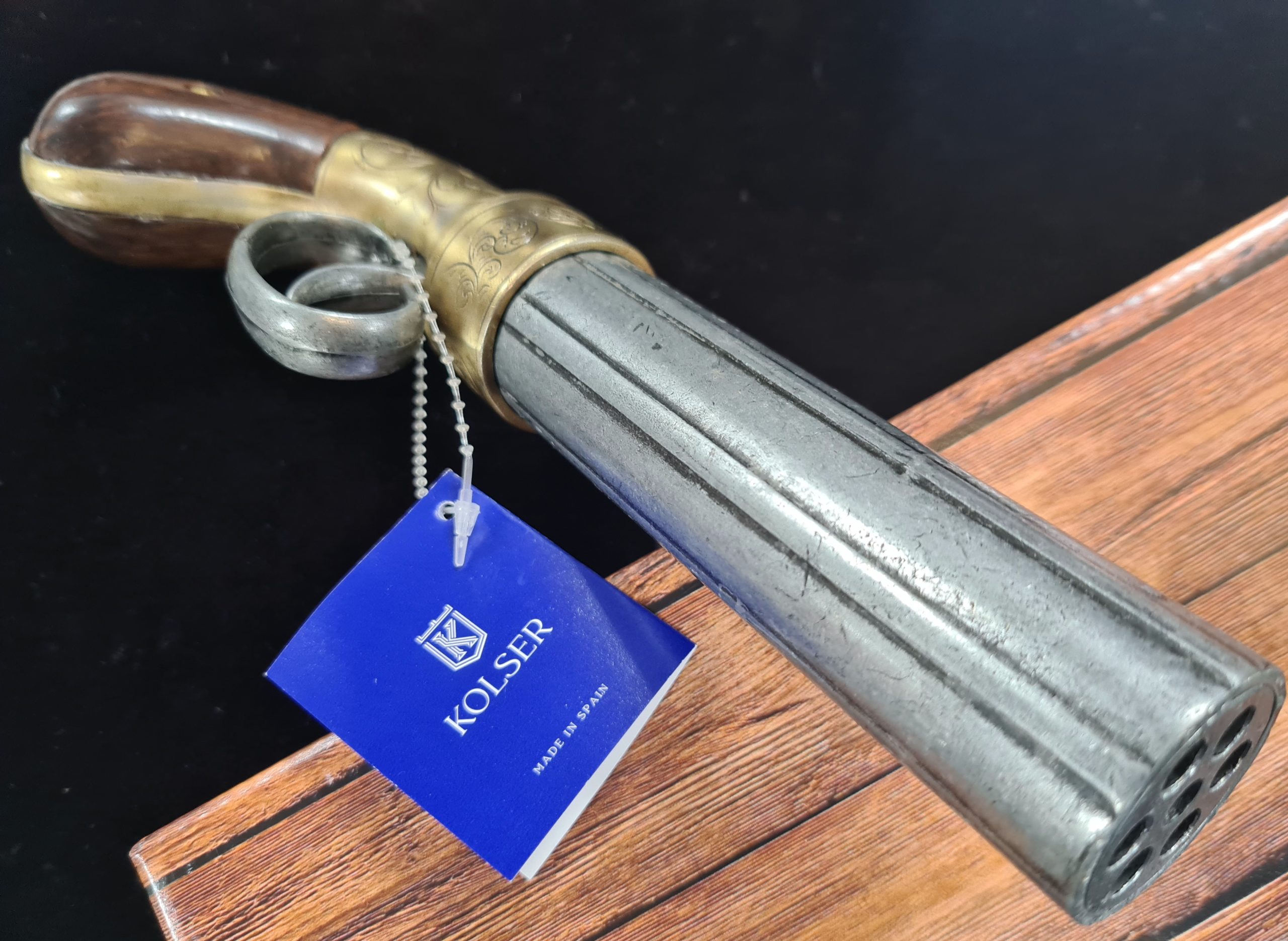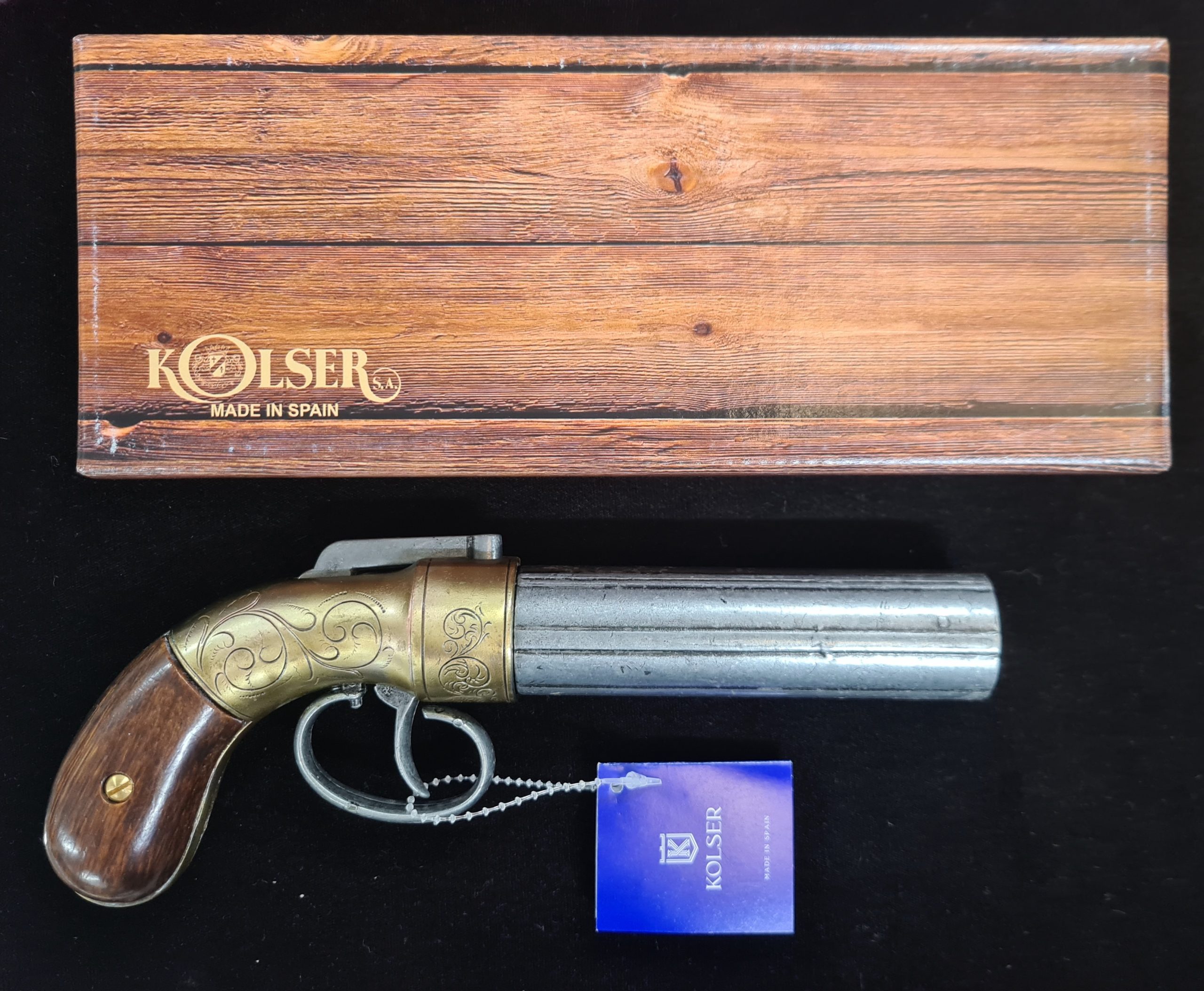 Replica pistol? of the 1837 Allen & Thurber Pepperbox 6 Shot defensive weapon with 6 barrels, also known as a ?Pepperbox? or 6-barrel pepper shaker. Kolser makes this pistols featuring details of the original, replicating the aesthetics of the original 1837 weapon. It has? manufacturers and floral details cast engraved into the metal and wood-style grip, made with resistant metal and resin that provides durability and conservation over time.? This fun display piece has a manual twist barrel and a dry fire trigger that moves the top percussion striker arm, pistol measures 23cm.
