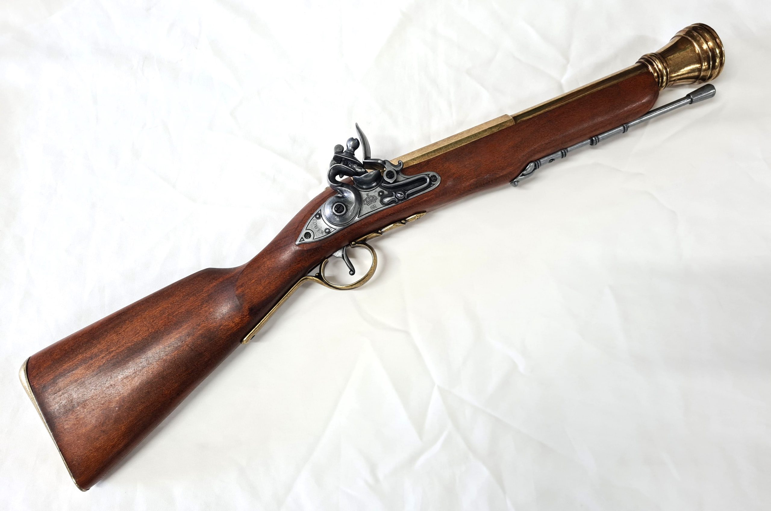 Blunderbusses were typically very short, with barrel less than 60 cm of length, at the same time, musket's barrel measured more than 90 cm. The firing mechanism was based on a flint or flint stone, which the hammer produced the spark that ignited the gunpowder.