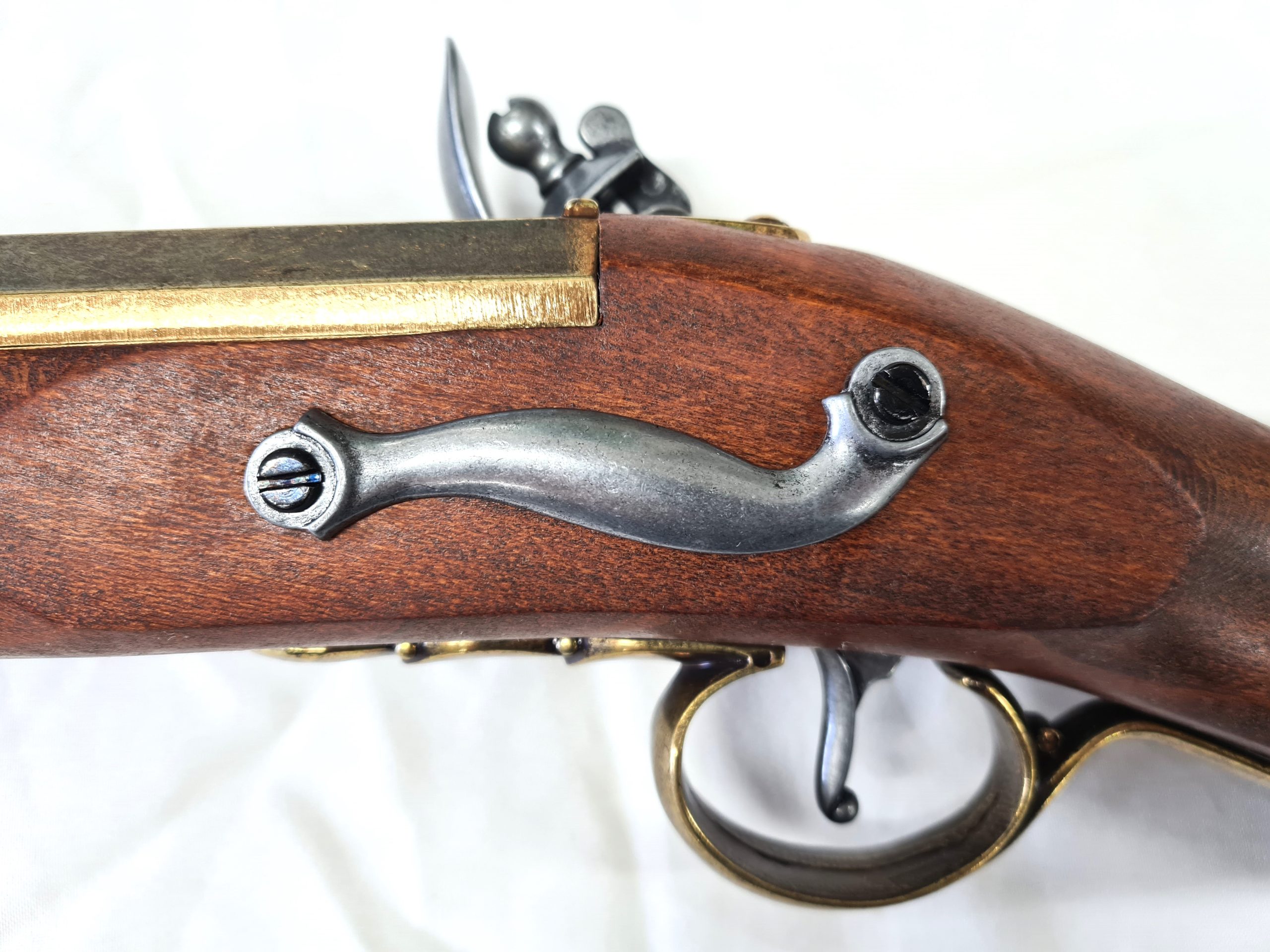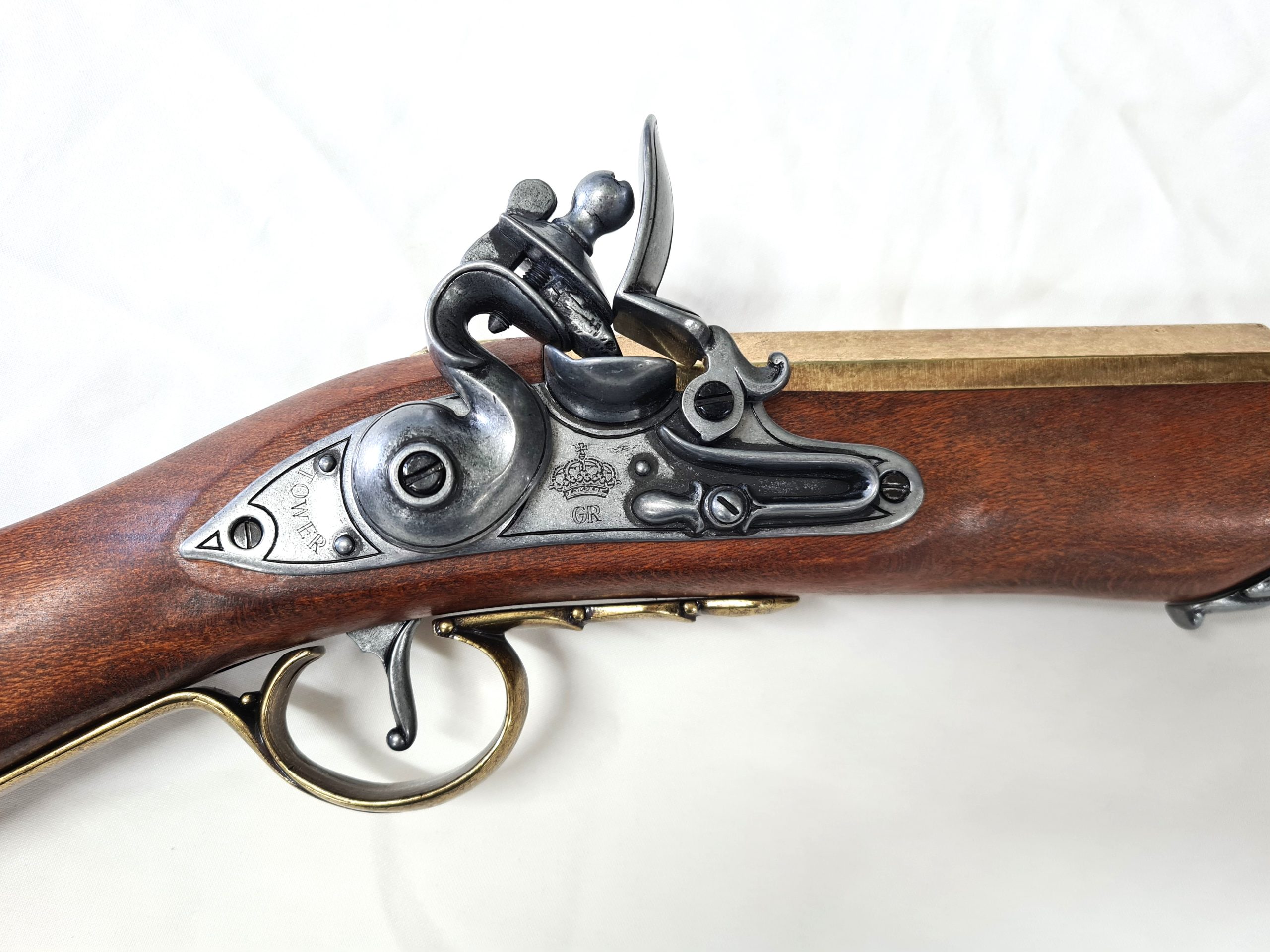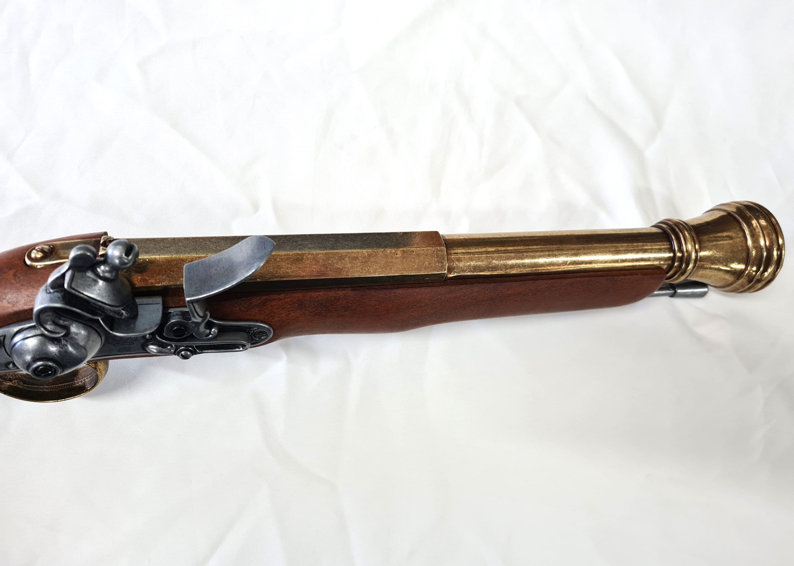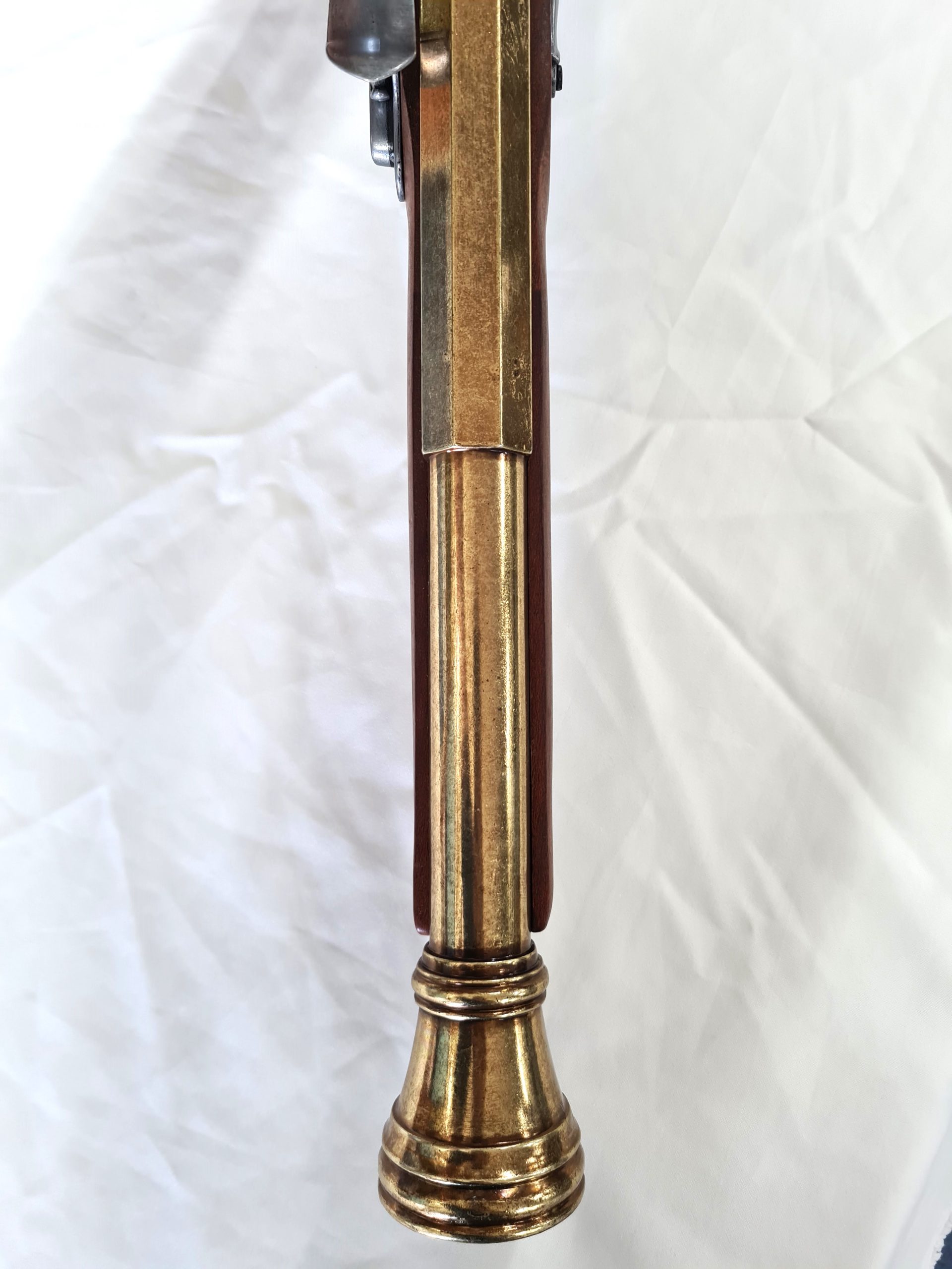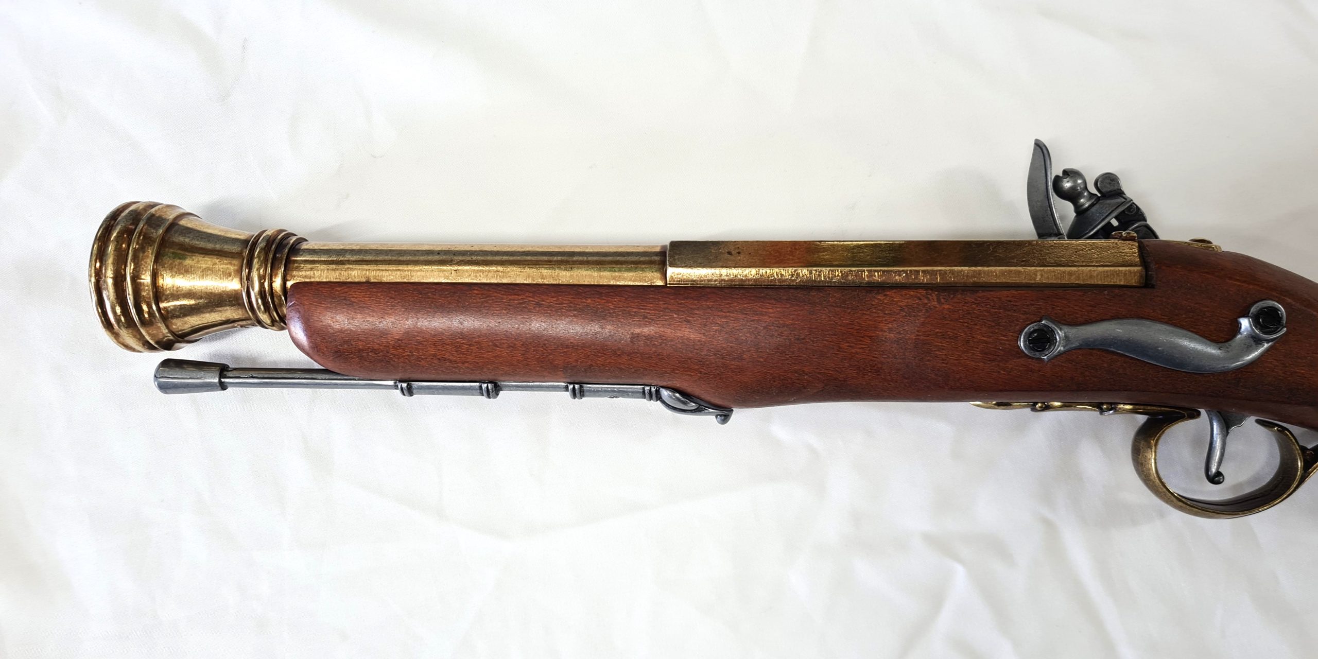 Real wood and metal , full sized replica 18th century blunderbuss with moving hammer , black powder cover and dry fire action to simulated mechanism of loading and firing. Quality piece? measuring 74cm long and weighing 2kg. This is the gold barrel type.