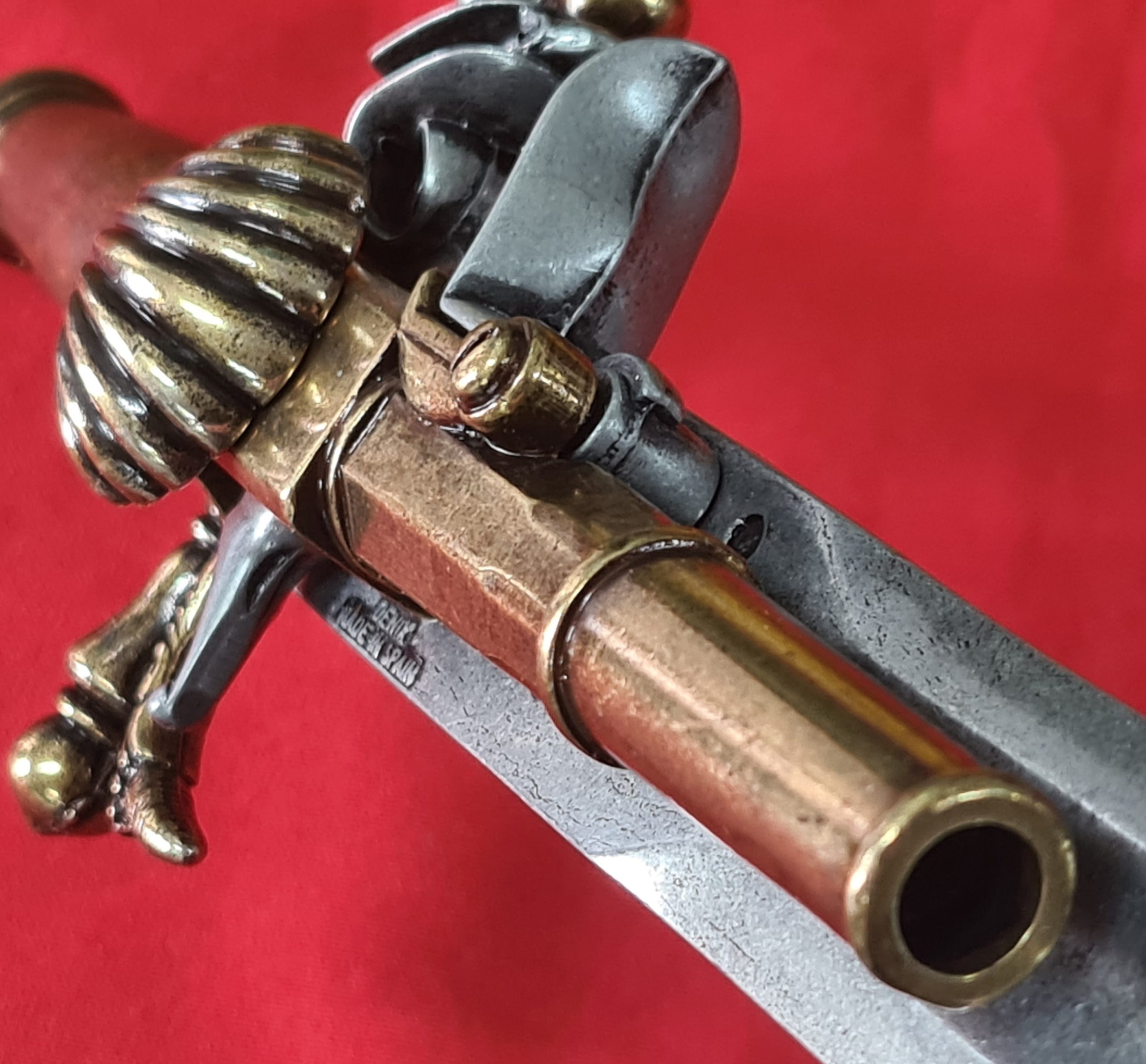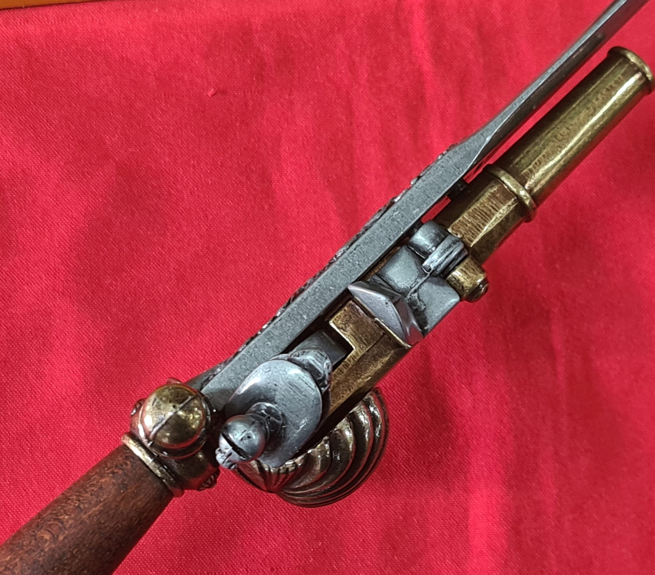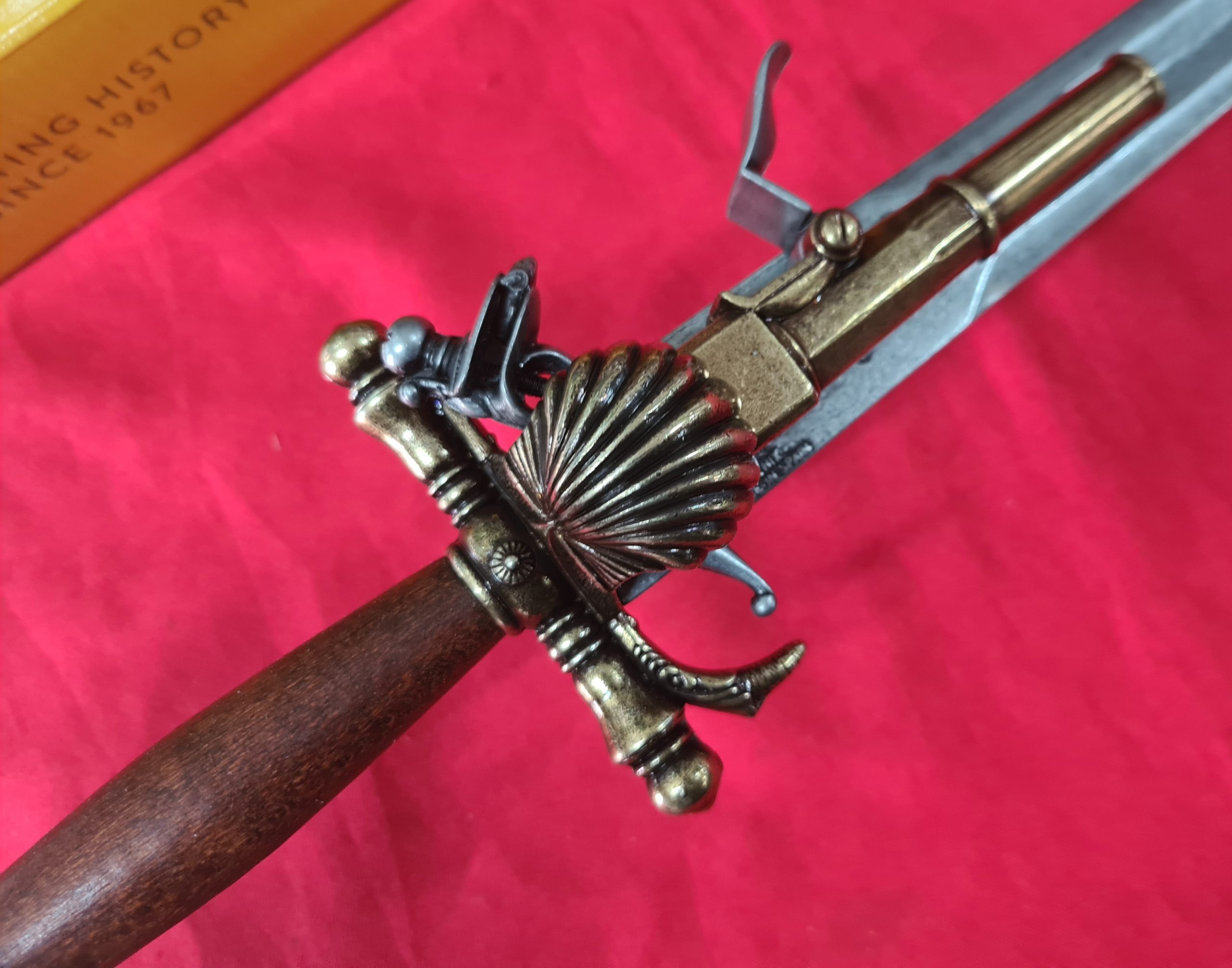 Reproduction of combination weapon being a single shot flintlock pistol with simulating mechanism of loading and firing plus dagger.