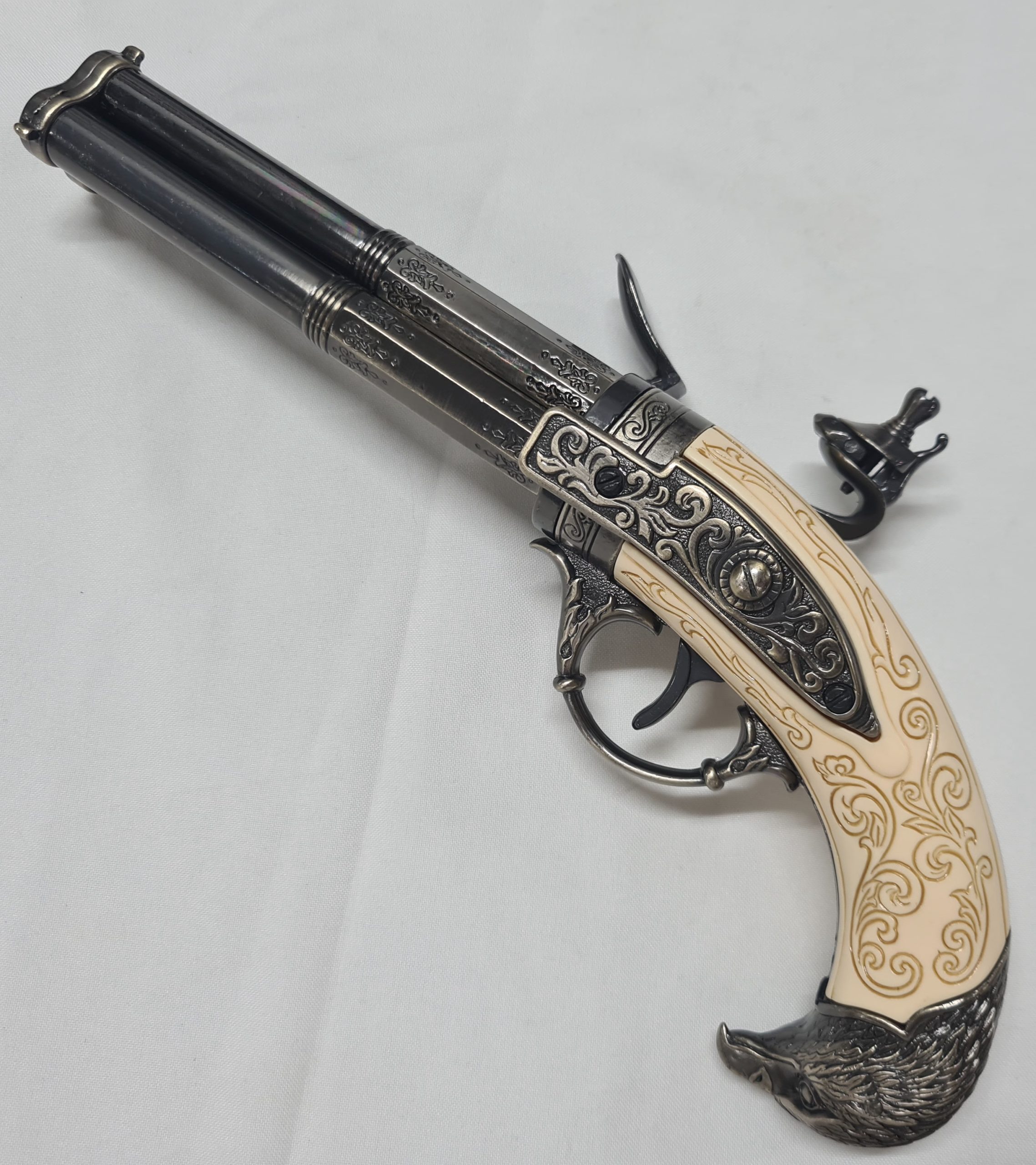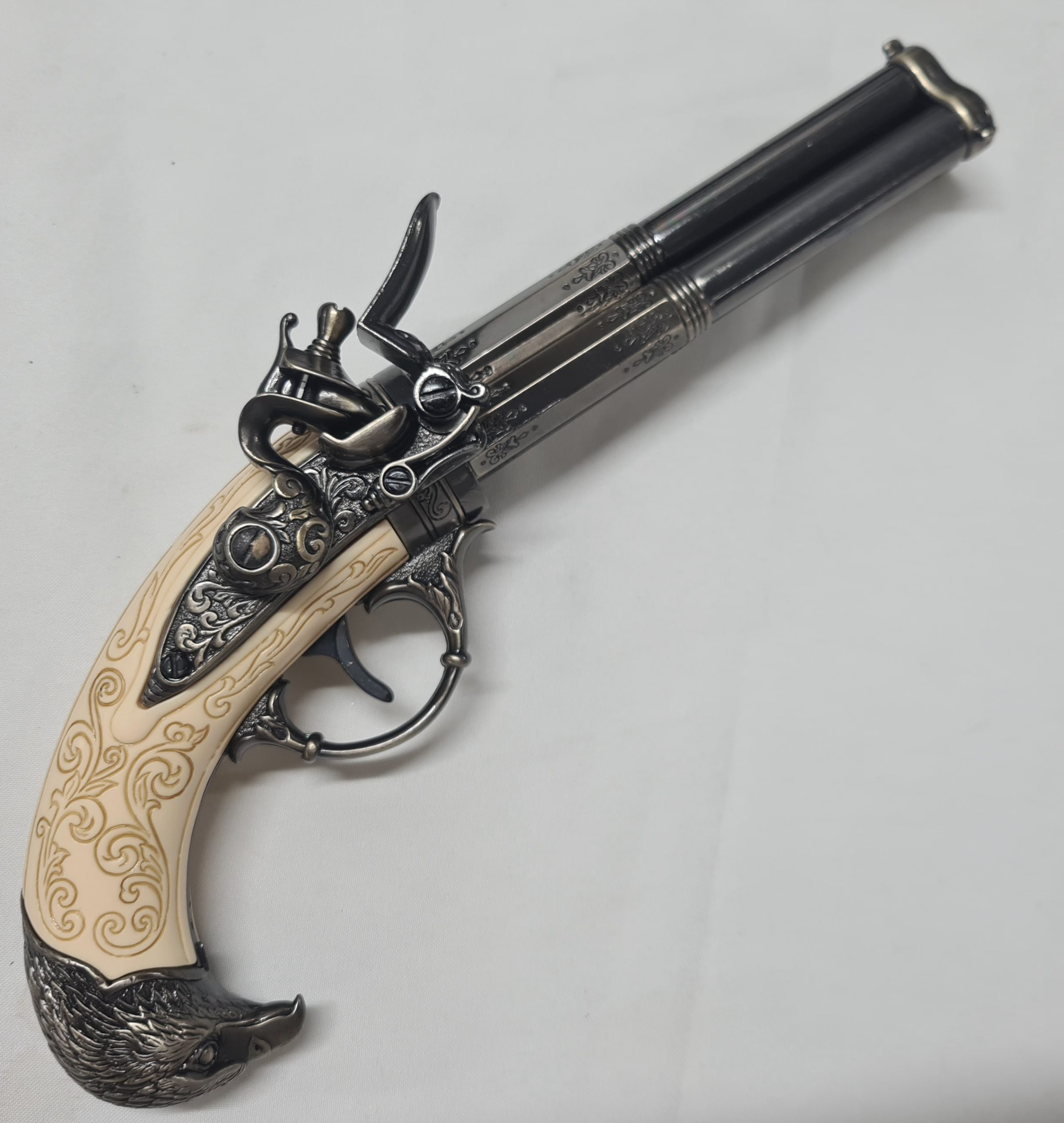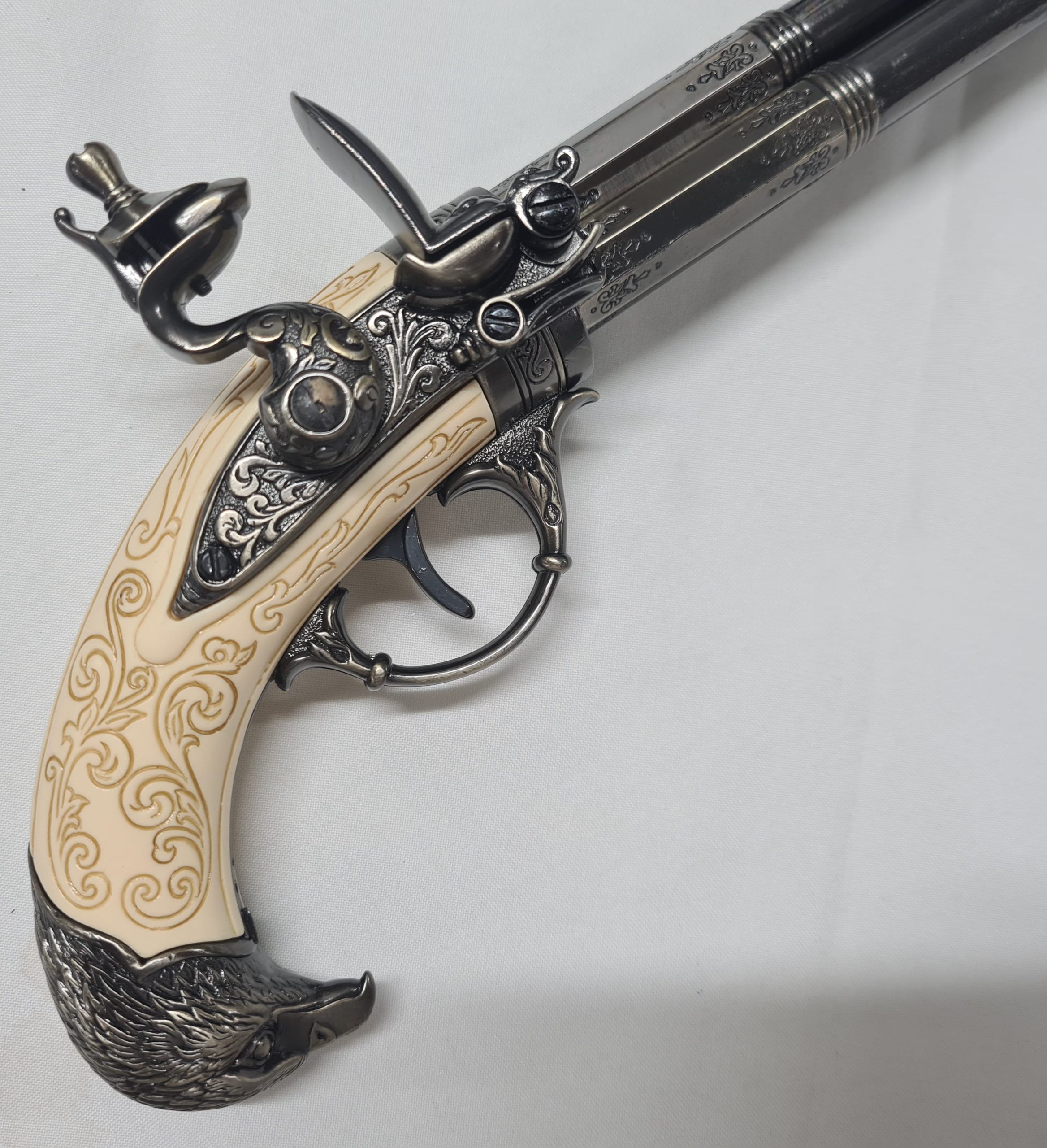 ?Reproduction of 3 barrel flintlock pistol with eagle head butt, made in metal and simulated engrave ivory grips with simulating mechanism of loading and firing. Flintlock pistols, one of the most commonly used firearms by the pirates in the eighteenth century, had a flint or flint stone, which when it was triggered by the hammer produced the spark that ignited the gunpowder. All these guns required to be ammo reload manually after each shot. The ammunition, which was introduced through the mouth of the barrel, consisted of gunpowder, projectile and a paper wad, which served as a cap to keep the two previous materials compressed inside the barrel. In combat, generally these weapons were used for a single shot, since the method of reloading was very slow and it was not usually time to recharge. Therefore the fighters after shooting were forced to draw their sabers or swords or to use the pistol as a club if they could not recharge it in time. Live the pirate adventures and misadventures in the Caribbean seas with this Denix historical reproduction gun!
