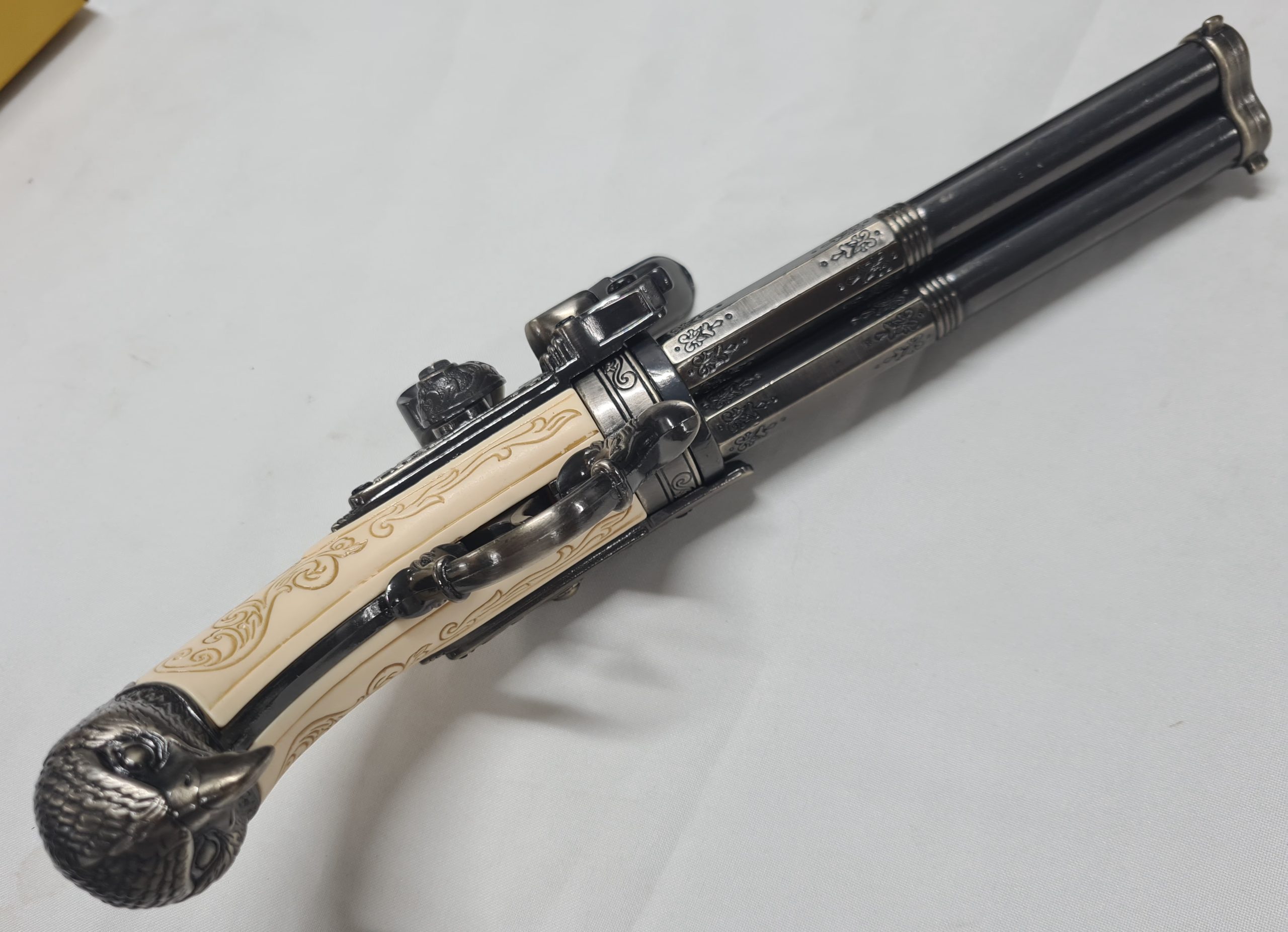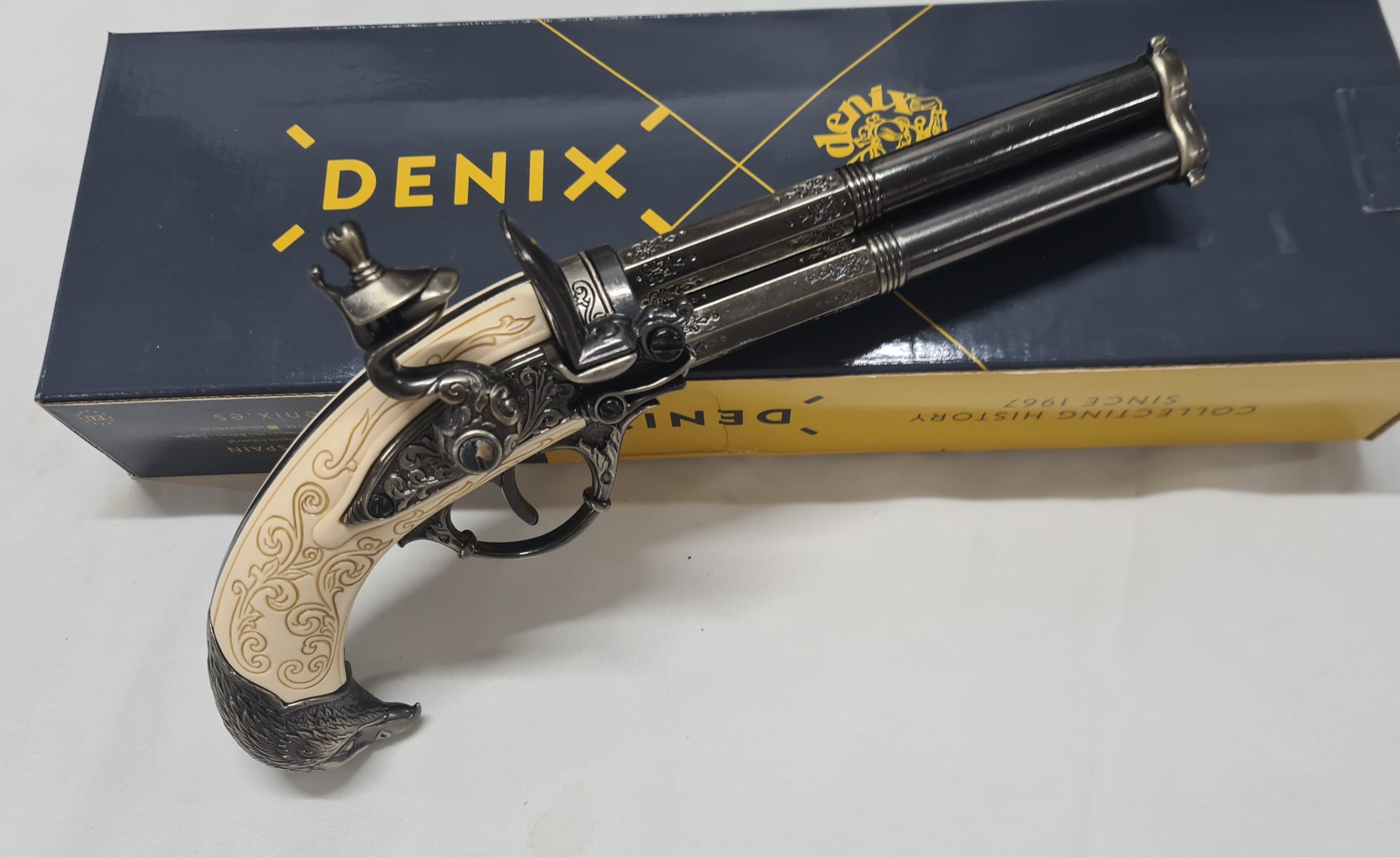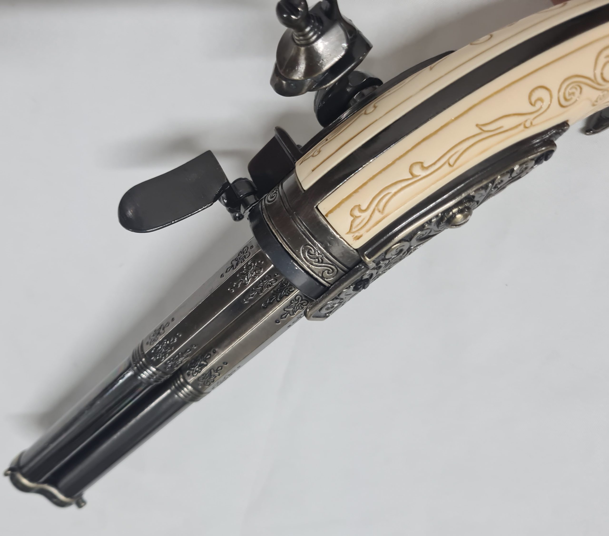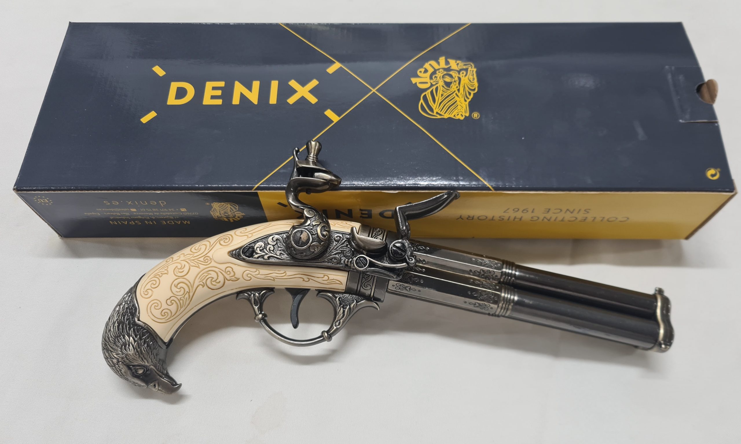 ?Reproduction of 3 barrel flintlock pistol with eagle head butt, made in metal and simulated engrave ivory grips with simulating mechanism of loading and firing. Flintlock pistols, one of the most commonly used firearms by the pirates in the eighteenth century, had a flint or flint stone, which when it was triggered by the hammer produced the spark that ignited the gunpowder. All these guns required to be ammo reload manually after each shot. The ammunition, which was introduced through the mouth of the barrel, consisted of gunpowder, projectile and a paper wad, which served as a cap to keep the two previous materials compressed inside the barrel. In combat, generally these weapons were used for a single shot, since the method of reloading was very slow and it was not usually time to recharge. Therefore the fighters after shooting were forced to draw their sabers or swords or to use the pistol as a club if they could not recharge it in time. Live the pirate adventures and misadventures in the Caribbean seas with this Denix historical reproduction gun!