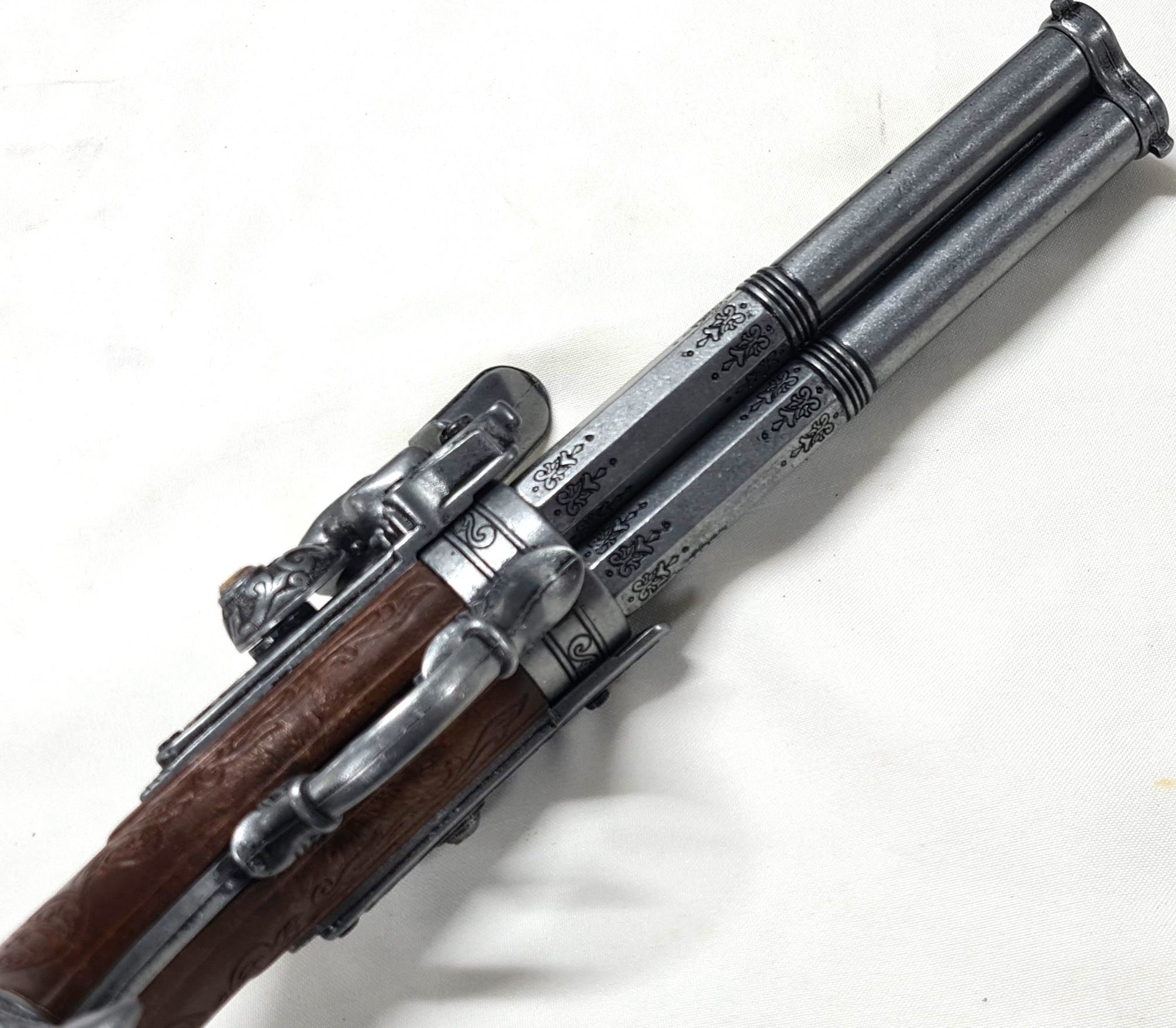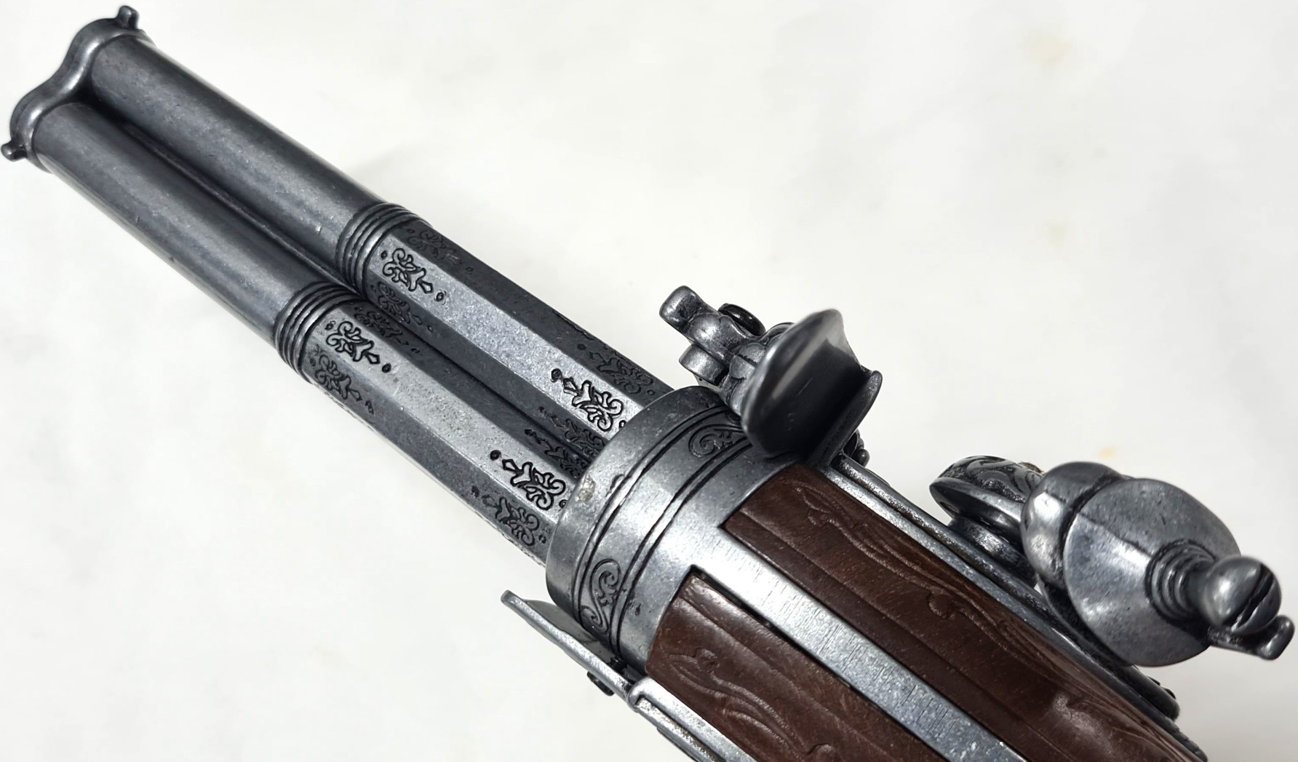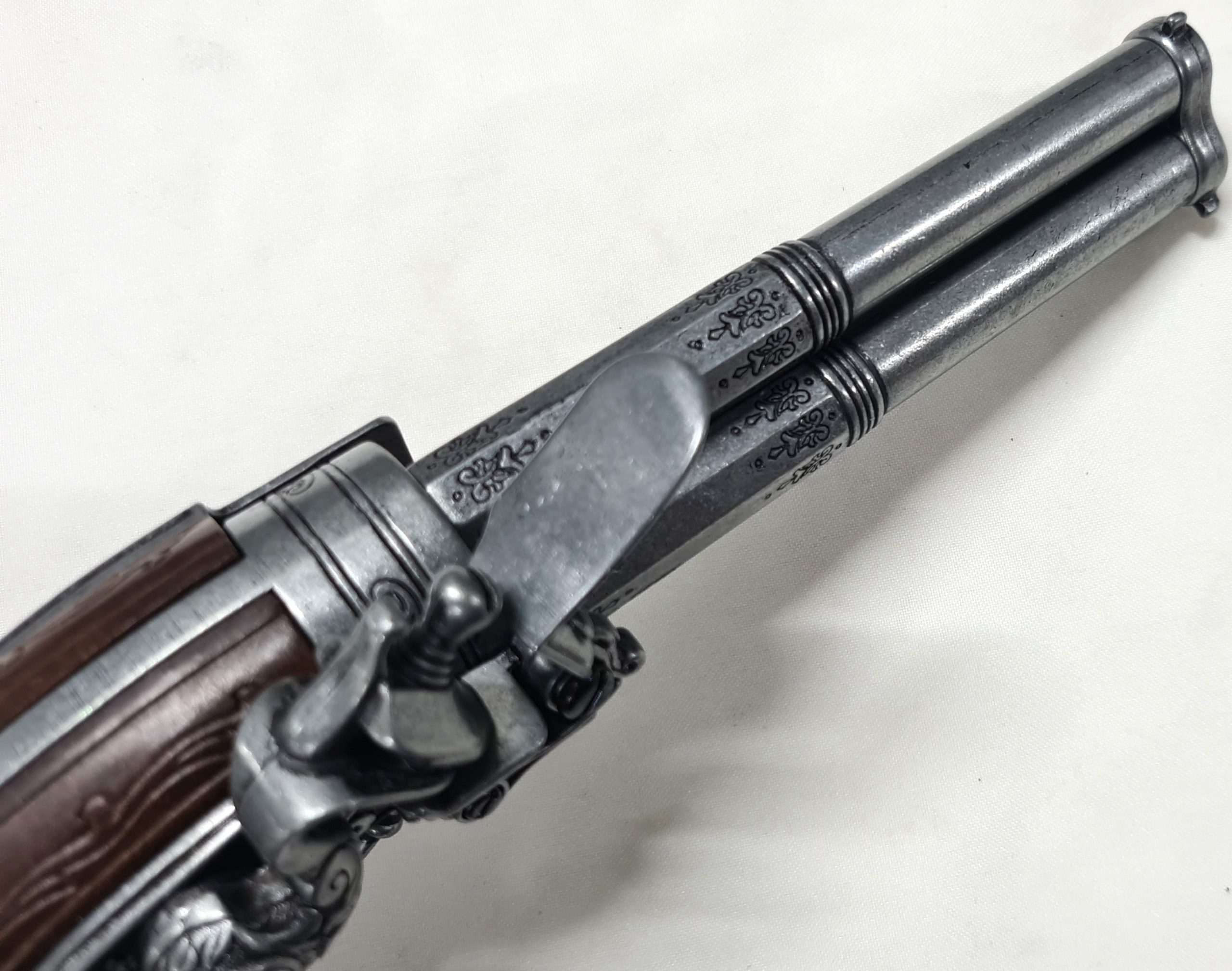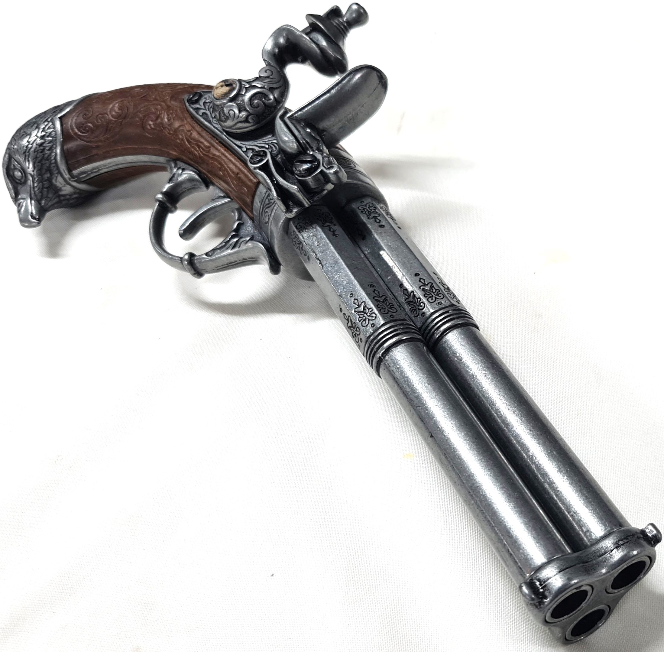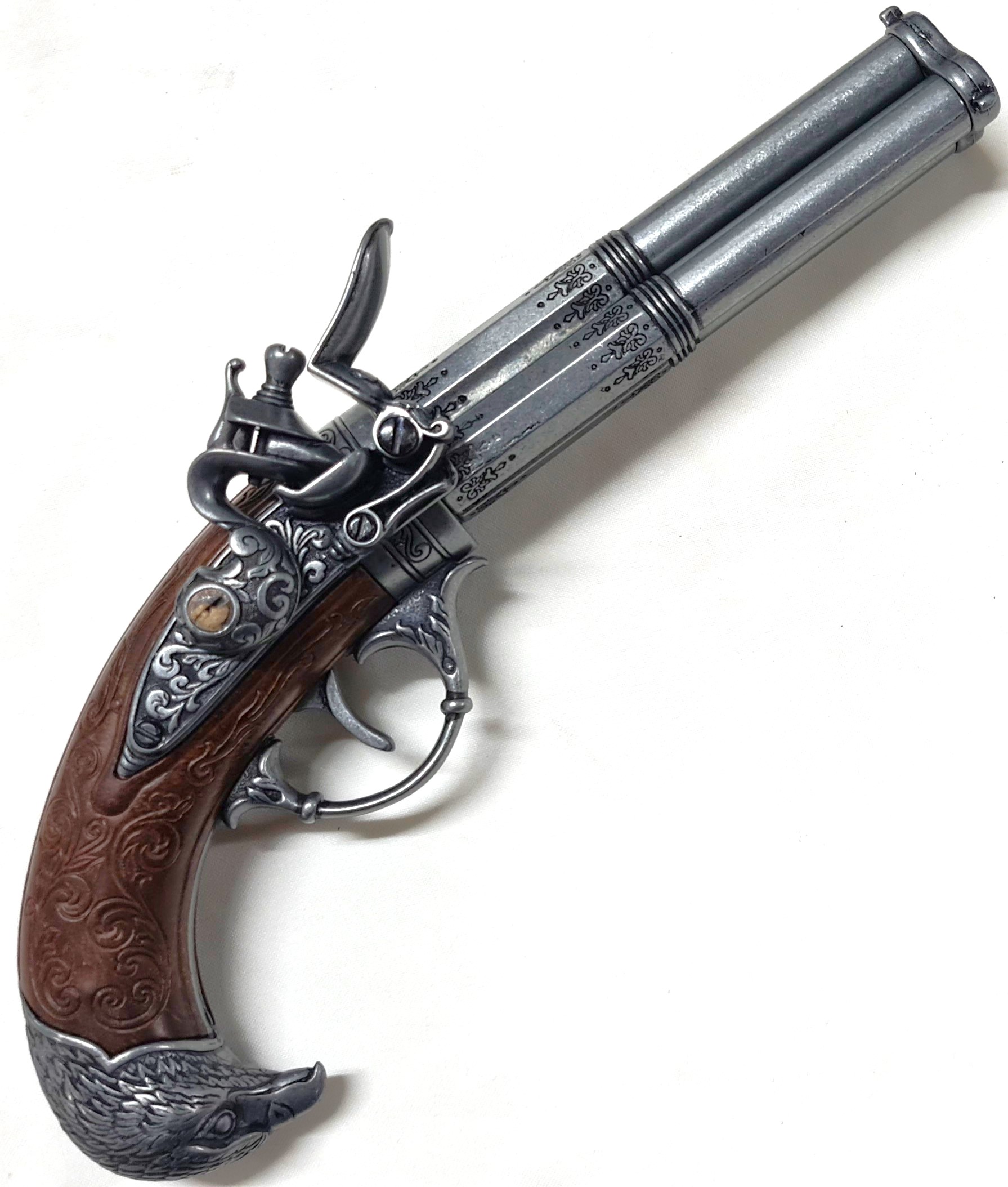 ?Reproduction of 3 barrel flintlock pistol with eagle head butt, made in metal and simulated engrave wooden grips with simulating mechanism of loading and firing. Flintlock pistols, one of the most commonly used firearms by the pirates in the eighteenth century, had a flint or flint stone, which when it was triggered by the hammer produced the spark that ignited the gunpowder. All these guns required to be ammo reload manually after each shot. The ammunition, which was introduced through the mouth of the barrel, consisted of gunpowder, projectile and a paper wad, which served as a cap to keep the two previous materials compressed inside the barrel. In combat, generally these weapons were used for a single shot, since the method of reloading was very slow and it was not usually time to recharge. Therefore the fighters after shooting were forced to draw their sabers or swords or to use the pistol as a club if they could not recharge it in time. Live the pirate adventures and misadventures in the Caribbean seas with this Denix historical reproduction gun!