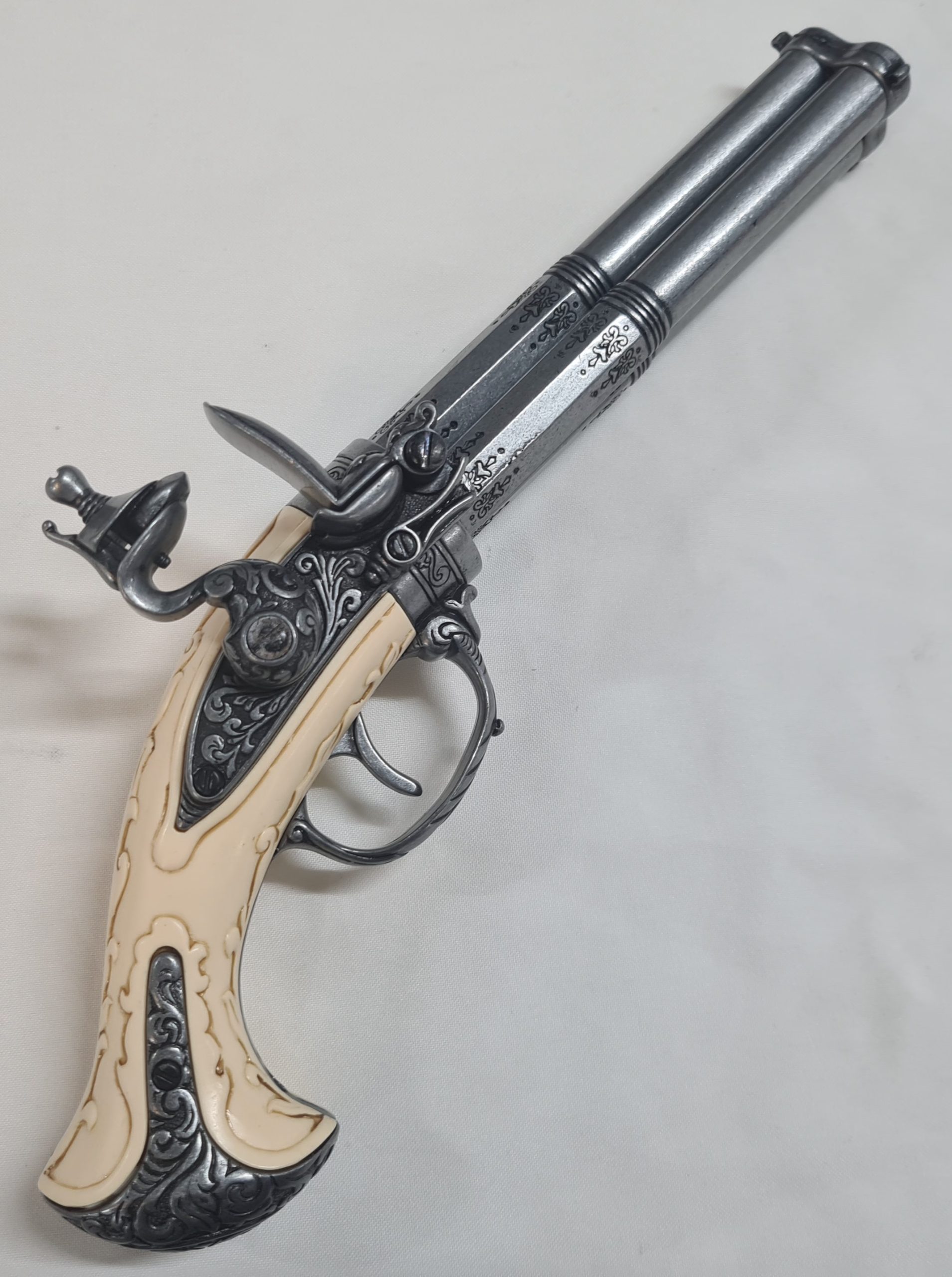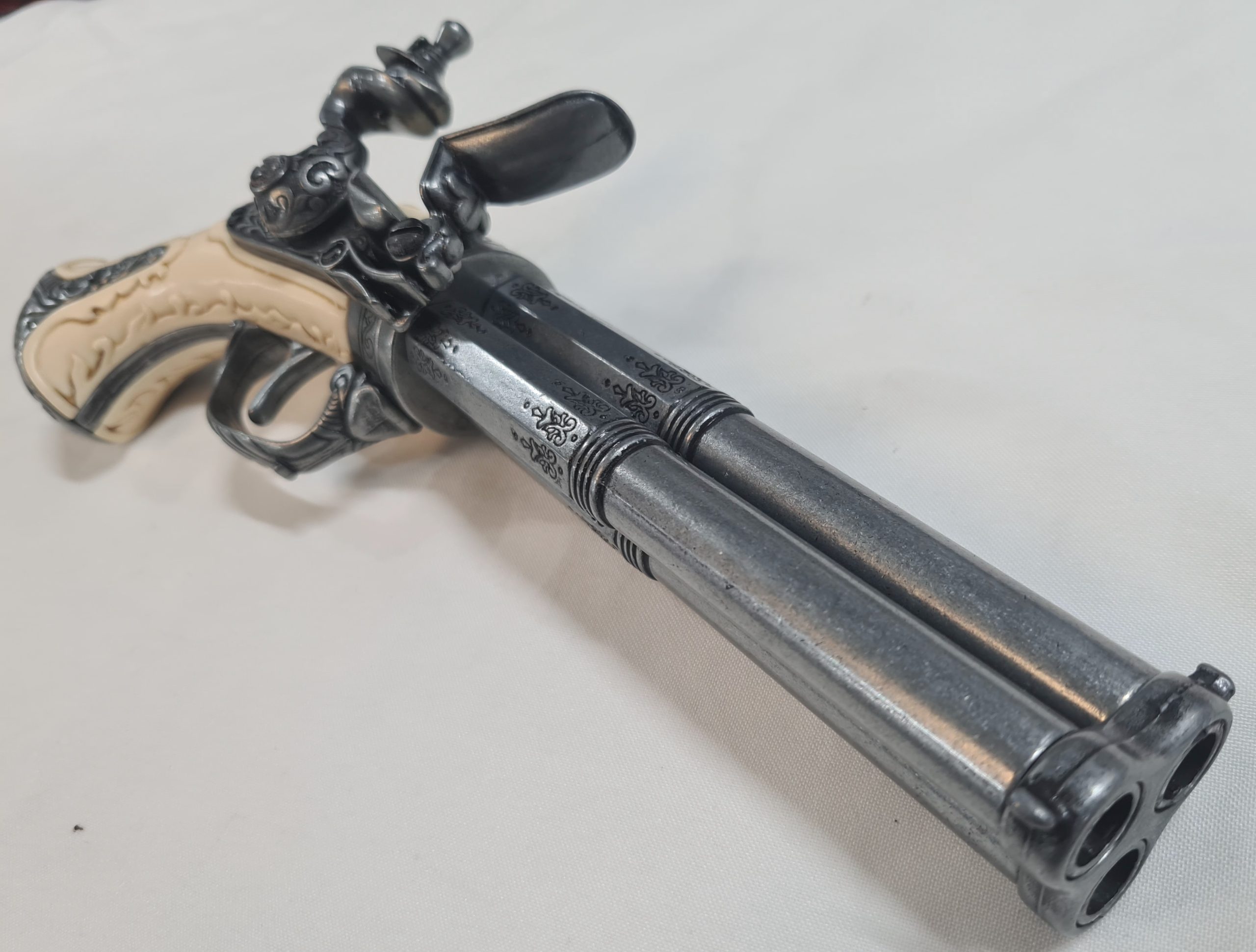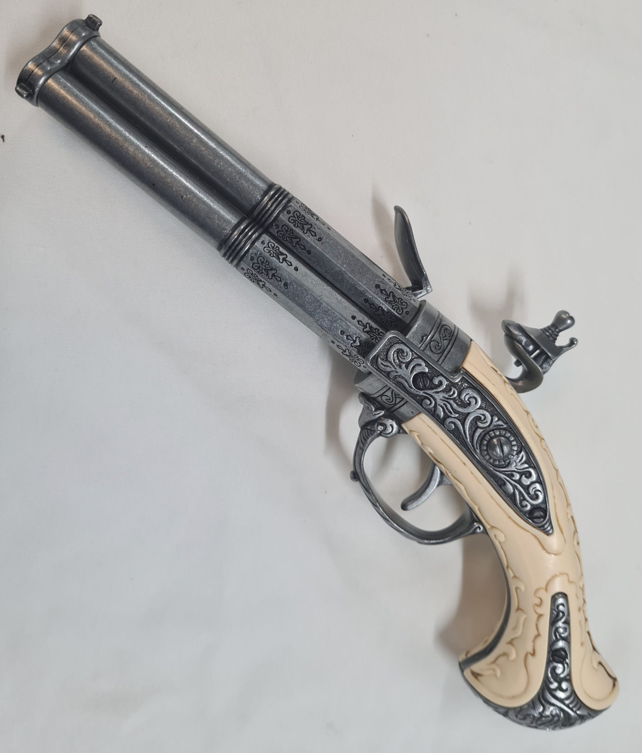 Reproduction of 3 barrel flintlock pistol with engraved pommel butt, made in metal and simulated engraved ivory grips with simulating mechanism of loading and firing. Flintlock pistols, one of the most commonly used firearms by the pirates in the eighteenth century, had a flint or flint stone, which when it was triggered by the hammer produced the spark that ignited the gunpowder. All these guns required to be ammo reload manually after each shot. The ammunition, which was introduced through the mouth of the barrel, consisted of gunpowder, projectile and a paper wad, which served as a cap to keep the two previous materials compressed inside the barrel. In combat, generally these weapons were used for a single shot, since the method of reloading was very slow and it was not usually time to recharge. Therefore the fighters after shooting were forced to draw their sabers or swords or to use the pistol as a club if they could not recharge it in time. Live the pirate adventures and misadventures in the Caribbean seas with this Denix historical reproduction gun!