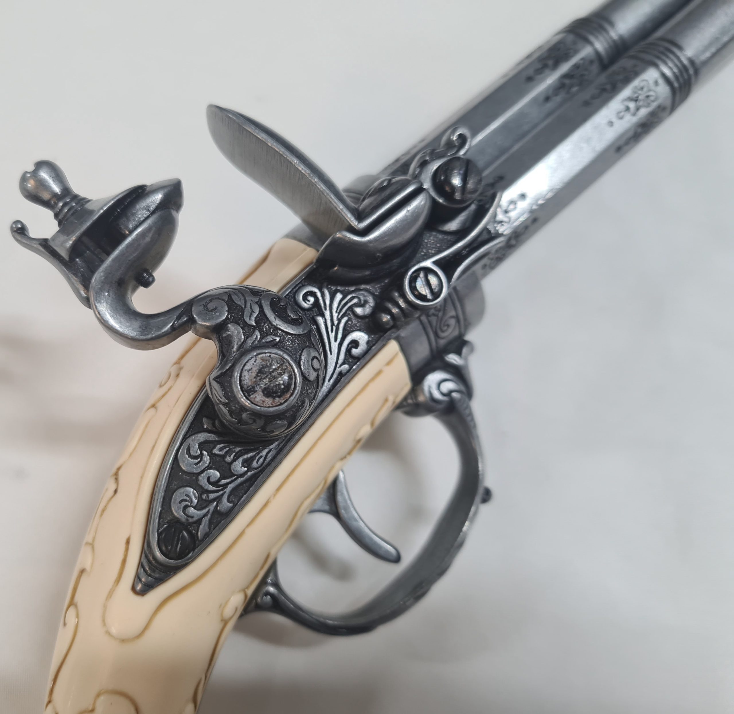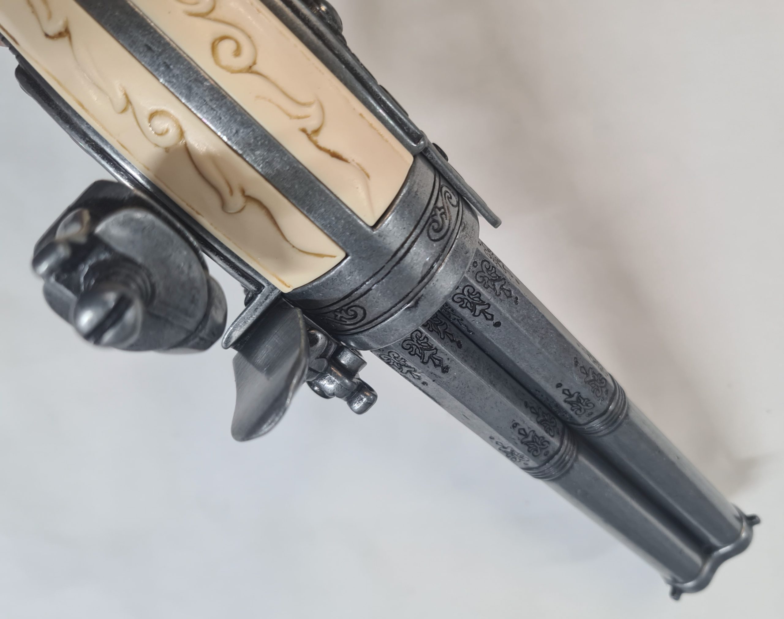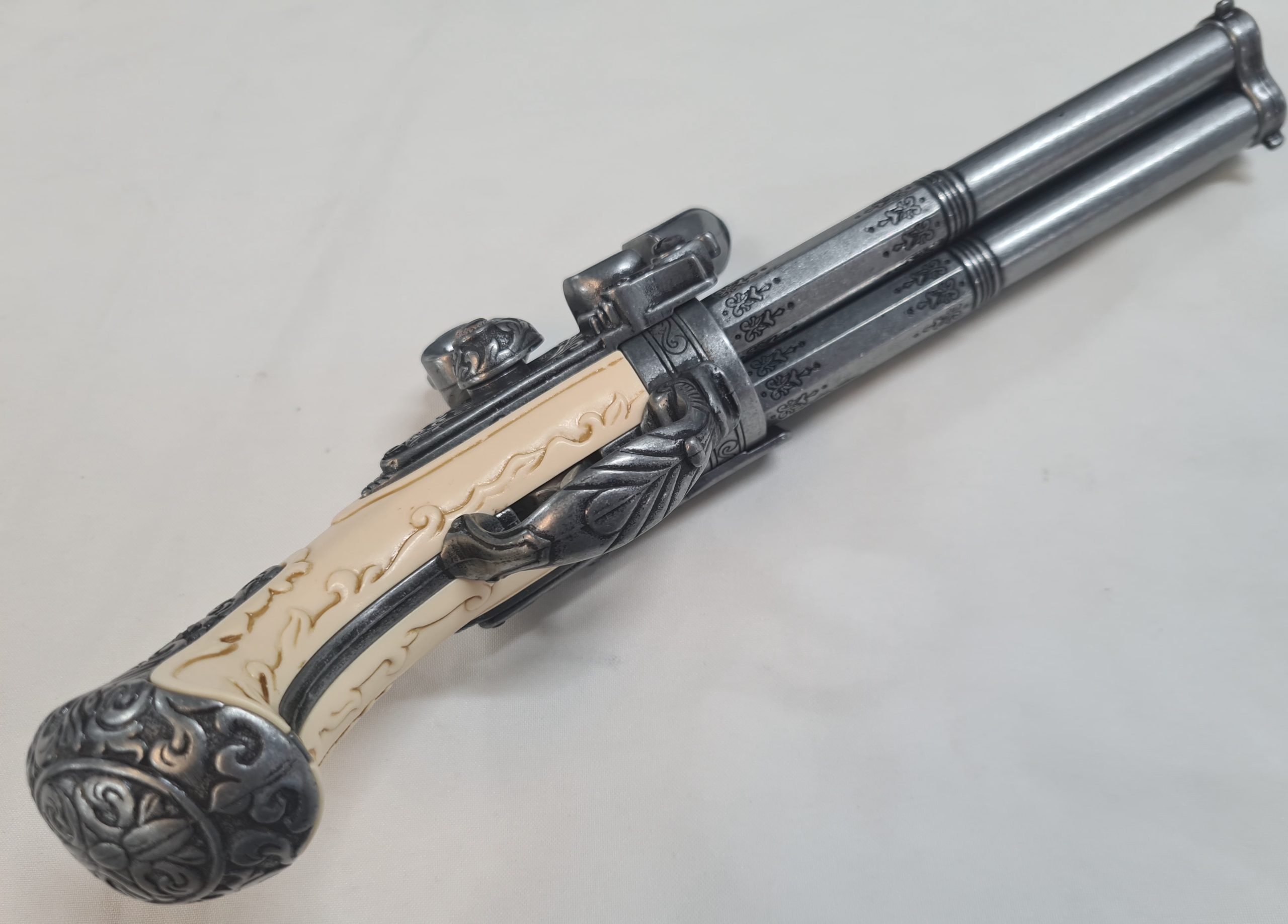 Reproduction of 3 barrel flintlock pistol with engraved pommel butt, made in metal and simulated engraved ivory grips with simulating mechanism of loading and firing. Flintlock pistols, one of the most commonly used firearms by the pirates in the eighteenth century, had a flint or flint stone, which when it was triggered by the hammer produced the spark that ignited the gunpowder. All these guns required to be ammo reload manually after each shot. The ammunition, which was introduced through the mouth of the barrel, consisted of gunpowder, projectile and a paper wad, which served as a cap to keep the two previous materials compressed inside the barrel. In combat, generally these weapons were used for a single shot, since the method of reloading was very slow and it was not usually time to recharge. Therefore the fighters after shooting were forced to draw their sabers or swords or to use the pistol as a club if they could not recharge it in time. Live the pirate adventures and misadventures in the Caribbean seas with this Denix historical reproduction gun!