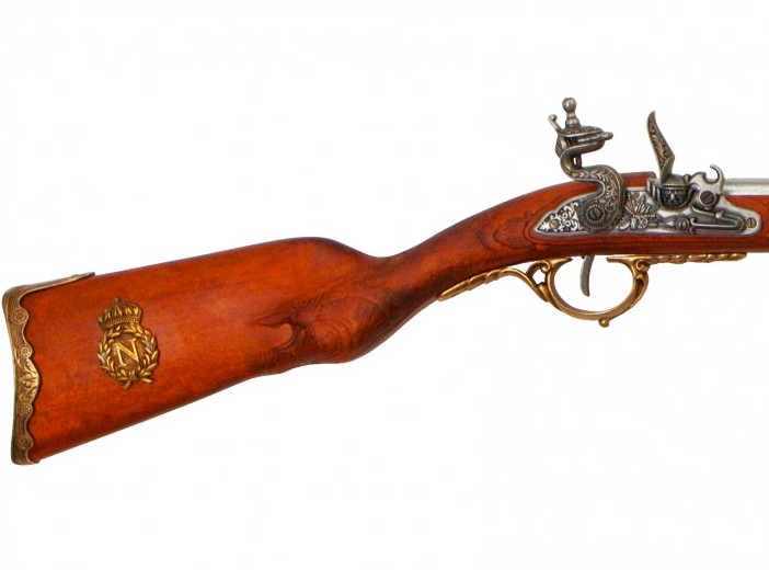 Reproduction of flintlock rifle with Napoleon's badge on the handle, made of metal and wood with simulated mechanism of loading and firing.