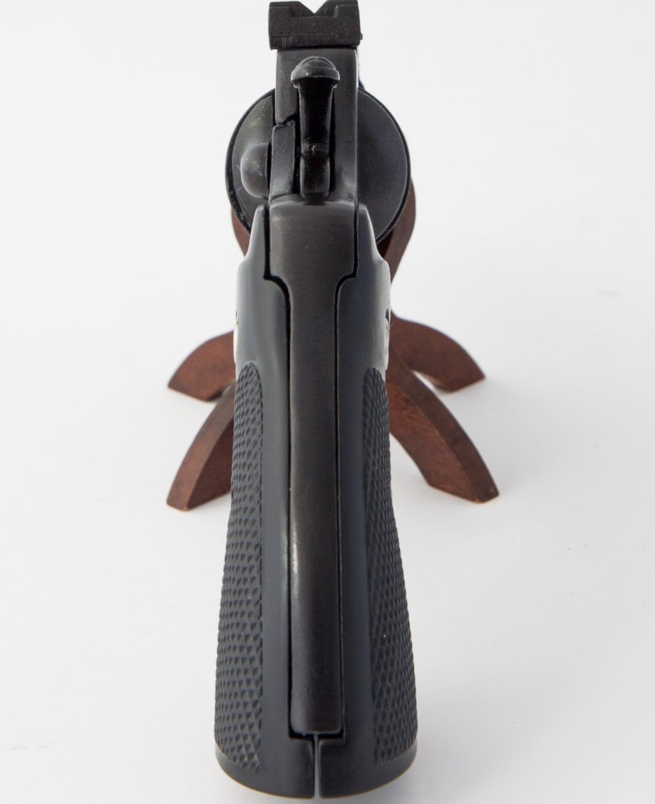 This classic police style high power magnum features include a 6-inch barrel, swing out six shot cylinder and working double action. The .357 Magnum is a revolver cartridge created by Elmer Keith, Phillip Sharpe, Winchester, and the firearms manufacturer Smith and Wesson, based upon Smith and Wesson’s earlier .38 Special cartridge. The .357 Magnum was developed over a period of time in the early to mid-1930s in a direct response to Colt’s .38 Super Automatic. At the time, the .38 Super was the only pistol cartridge capable of defeating automobile cover and the early body armour that was just beginning to emerge in the post-World War I "Gangster Era".