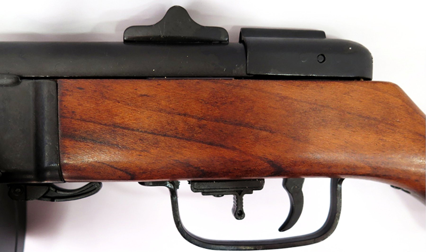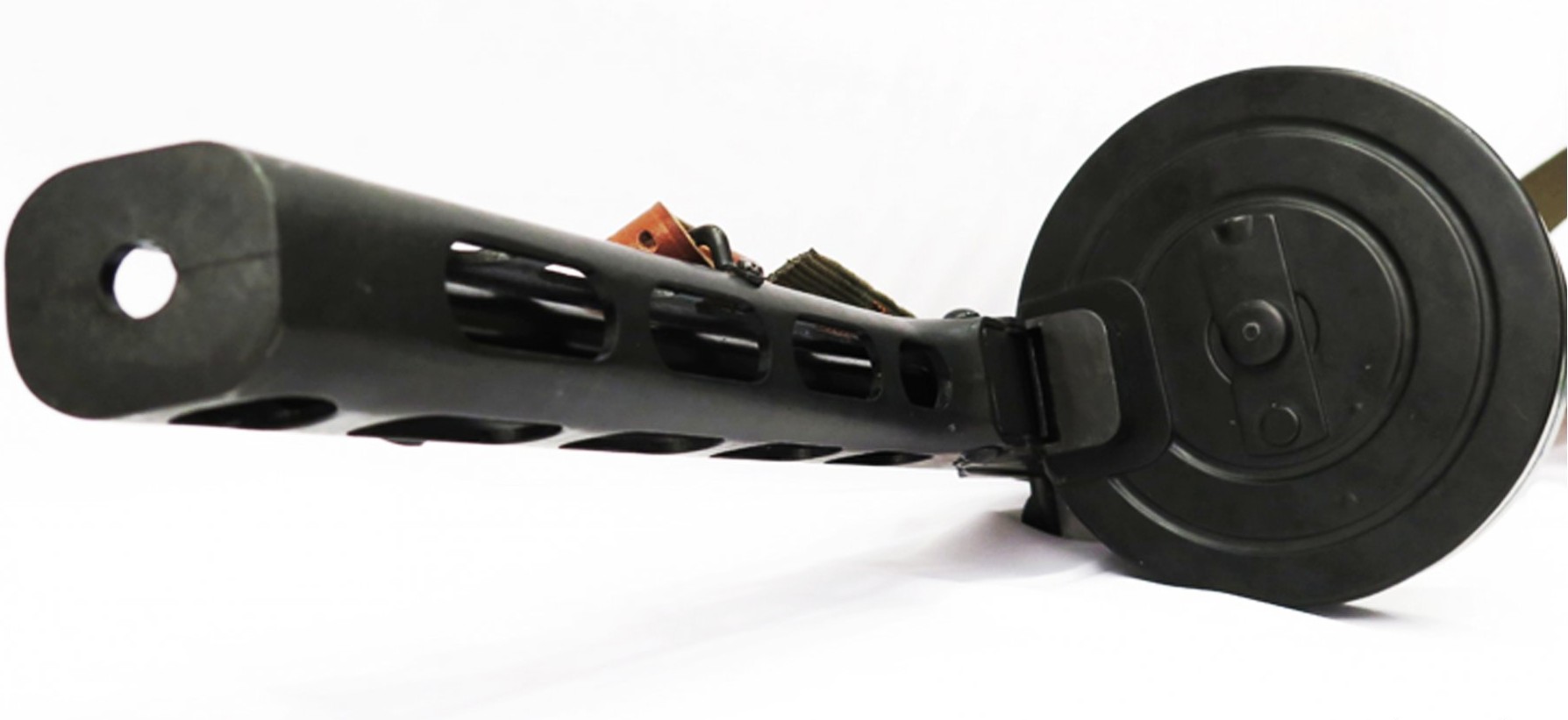 This classic PPSh-41 (Pistolet-Pulemyot Shpagina in Russian) was a submachine gun designed by Georgi Shpagin as a cheap alternative and simplified version of the PPD-40 submachine gun. The PPSh-41 submachine gun was fed by an automatic loader, blowback operated and fired from an open bolt. It was one of the main light arms of the Soviet armed forces during World War II. It could be charged by a curved magazine or a drum clipper, with the cartridge 7.62 x 25 Tokarev. The PPSh-41 was also widely used during the Korean War.
