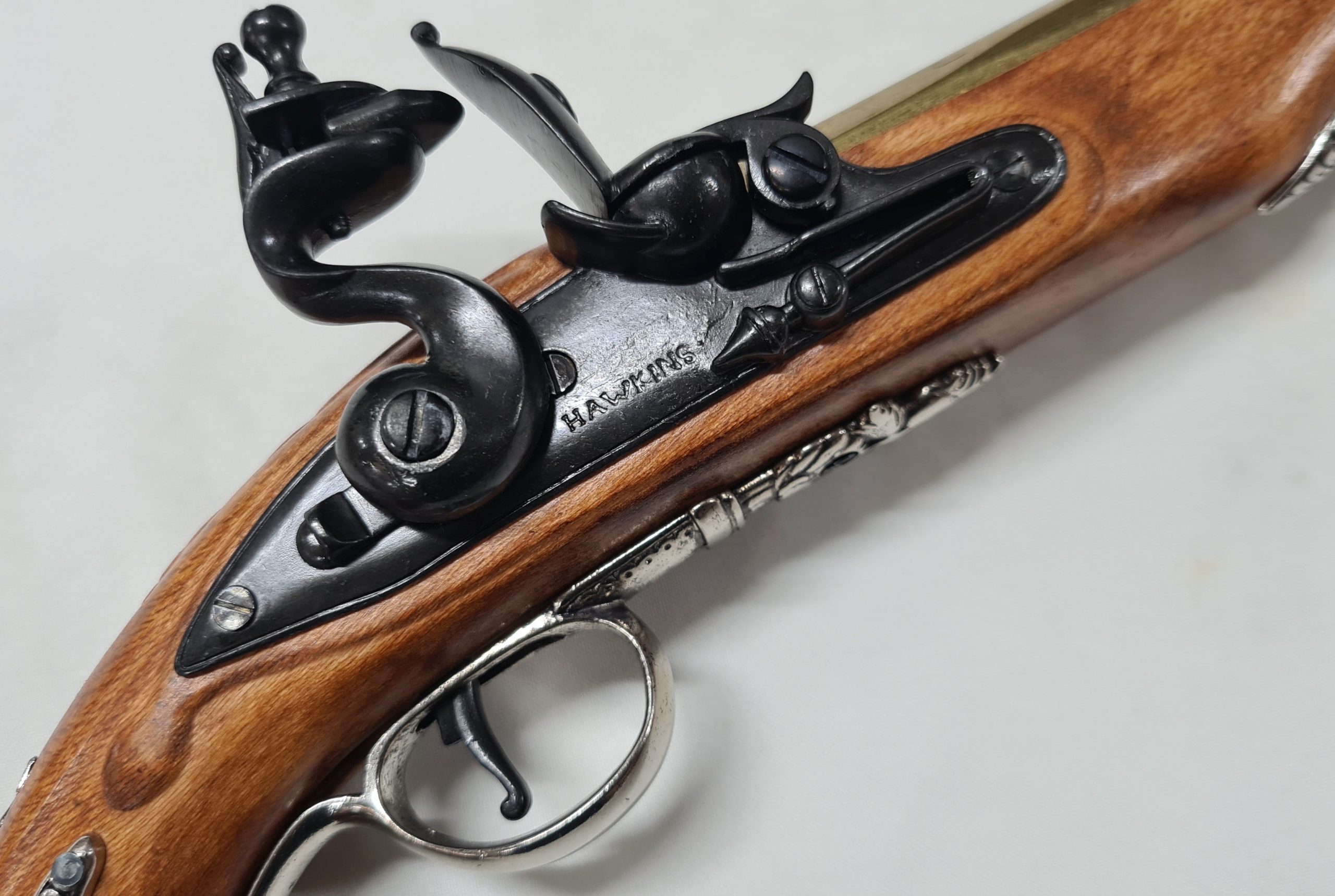 Reproduction of flintlock pistol with London HAWKINS marked lock and customised with General G Washington locket to grip, made in real wood and black/ chrome tone and brass tone metal with simulating mechanism of loading and firing. Quality piece with lots of detail.