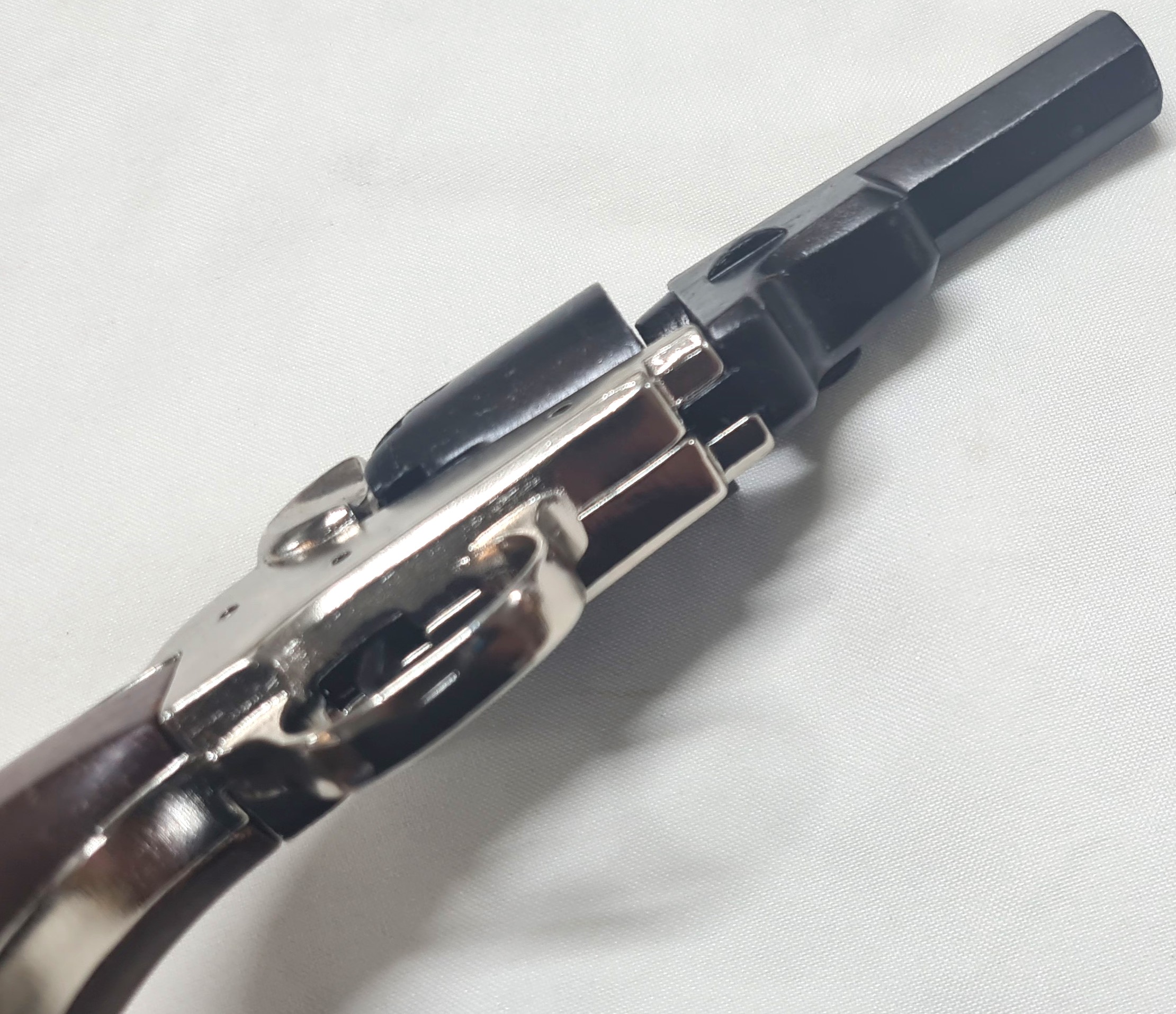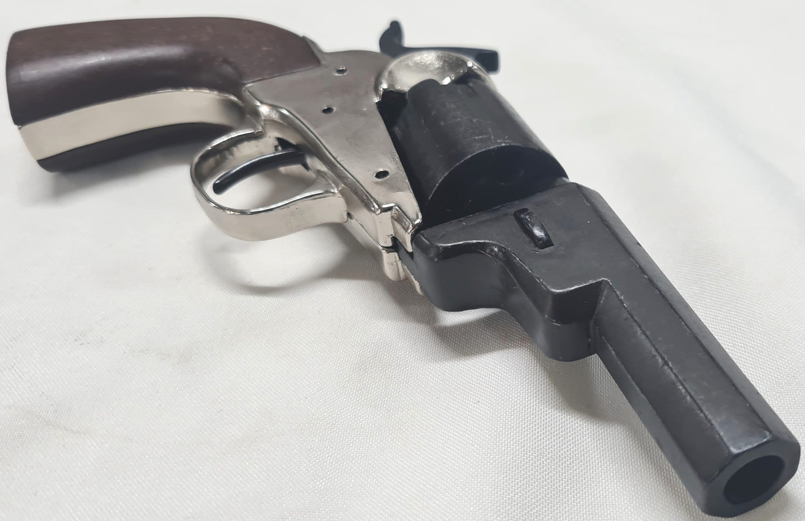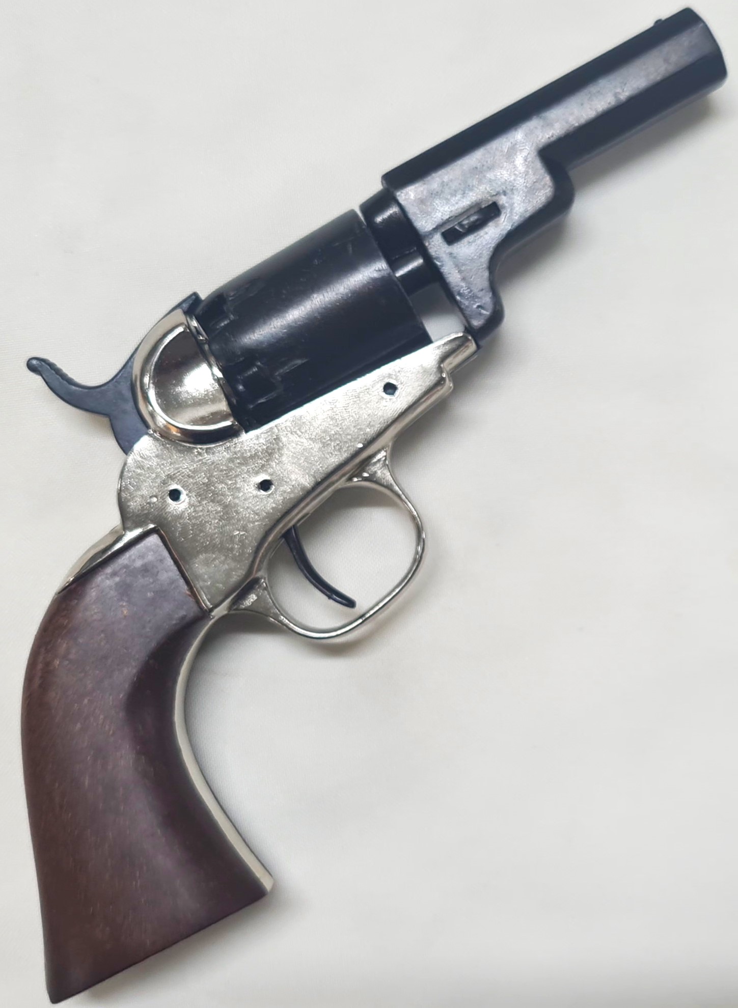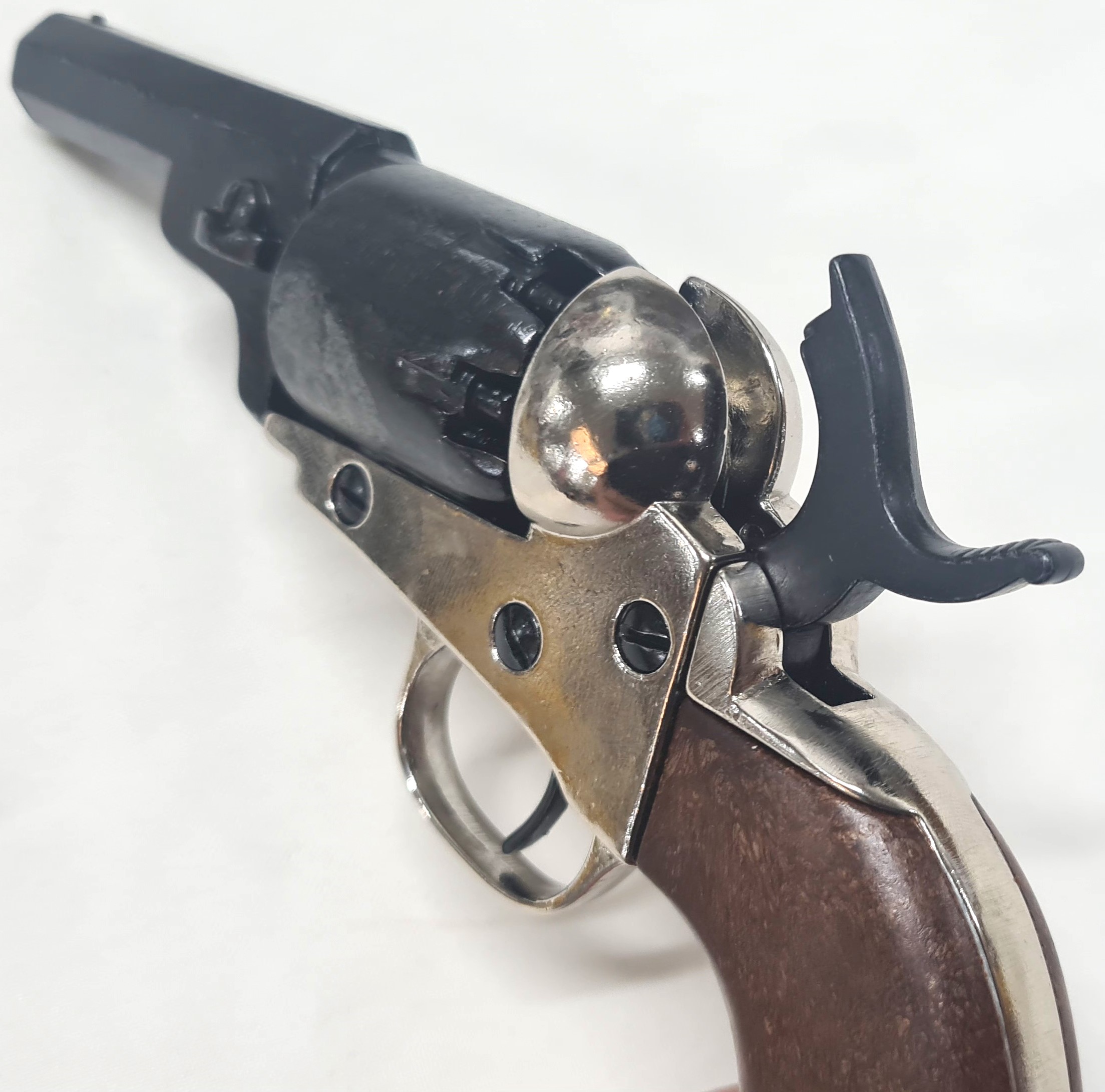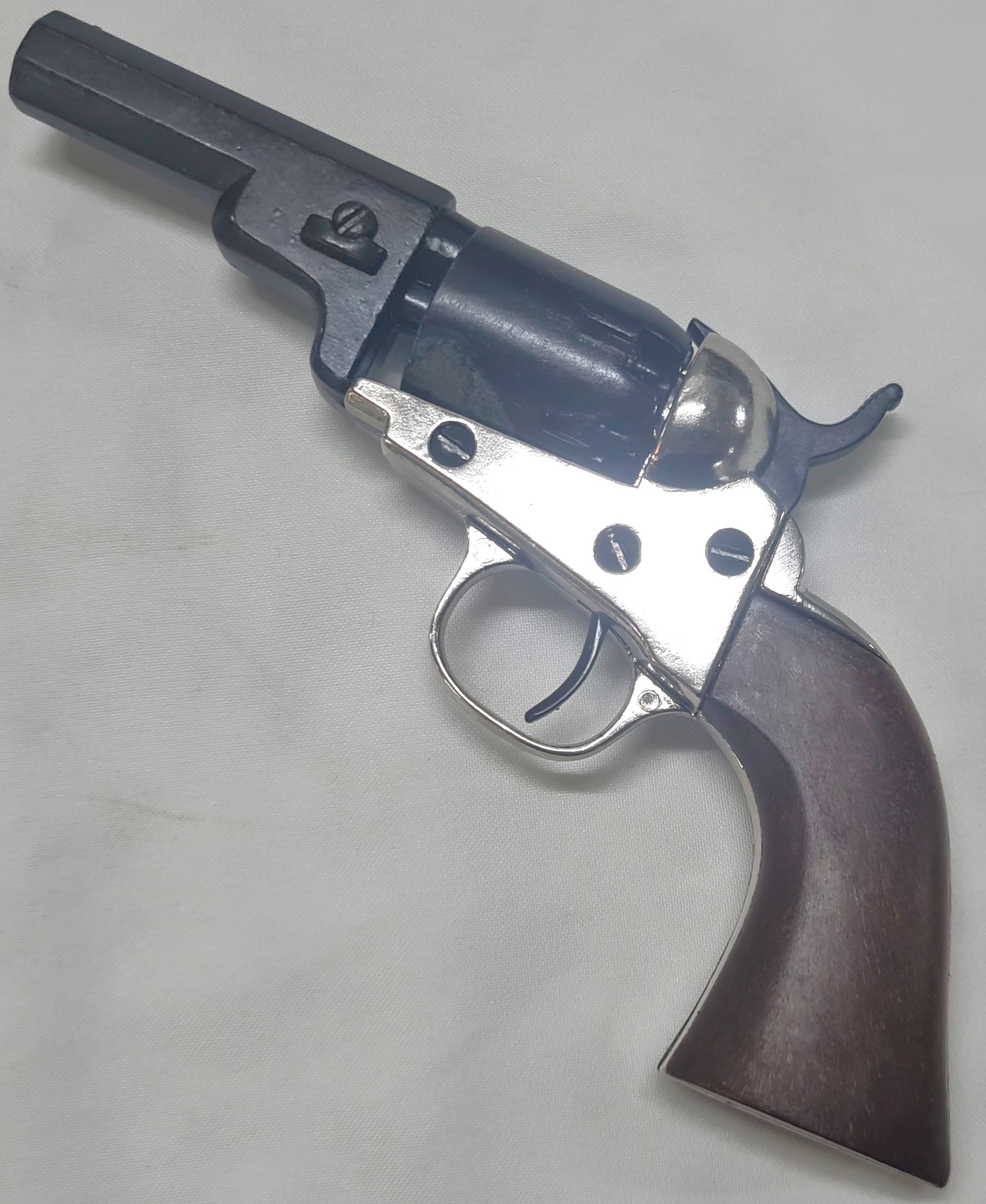 Colt 1849 pocket revolver, "Wells Fargo" model. Working single action. Hammer pulls back and cocks the revolver. Pull the trigger to release the hammer and fire the pistol. Black metal barrel. Chrome metal frame. Plastic grips are Imitation wood. This is a small and lightweight revolver, this revolver was easy to carry and was popular with Wells Fargo staff and Sheriffs as a back up gun. The pocket revolvers where designed by Colt for the civilian market and where designed to be small enough to be carried in belt holsters or in coats. They where often carried by Wells Fargo agents and as a back up gun (Ned Kelly carried one as part of his arsenal), they where made in a few different barrel lengths and they where made with and without an attached loading rod under the barrel, the ones without the loading rod are now called "Wells Fargo" models and would have to be loaded with a separate rod or dowel. In the film "The outlaw Josey Wales" Clint Eastwood carriers a few guns including a 1849 pocket colt revolver in a shoulder holster (in the film Josey Wales has an 1849 Colt with a loading rod).