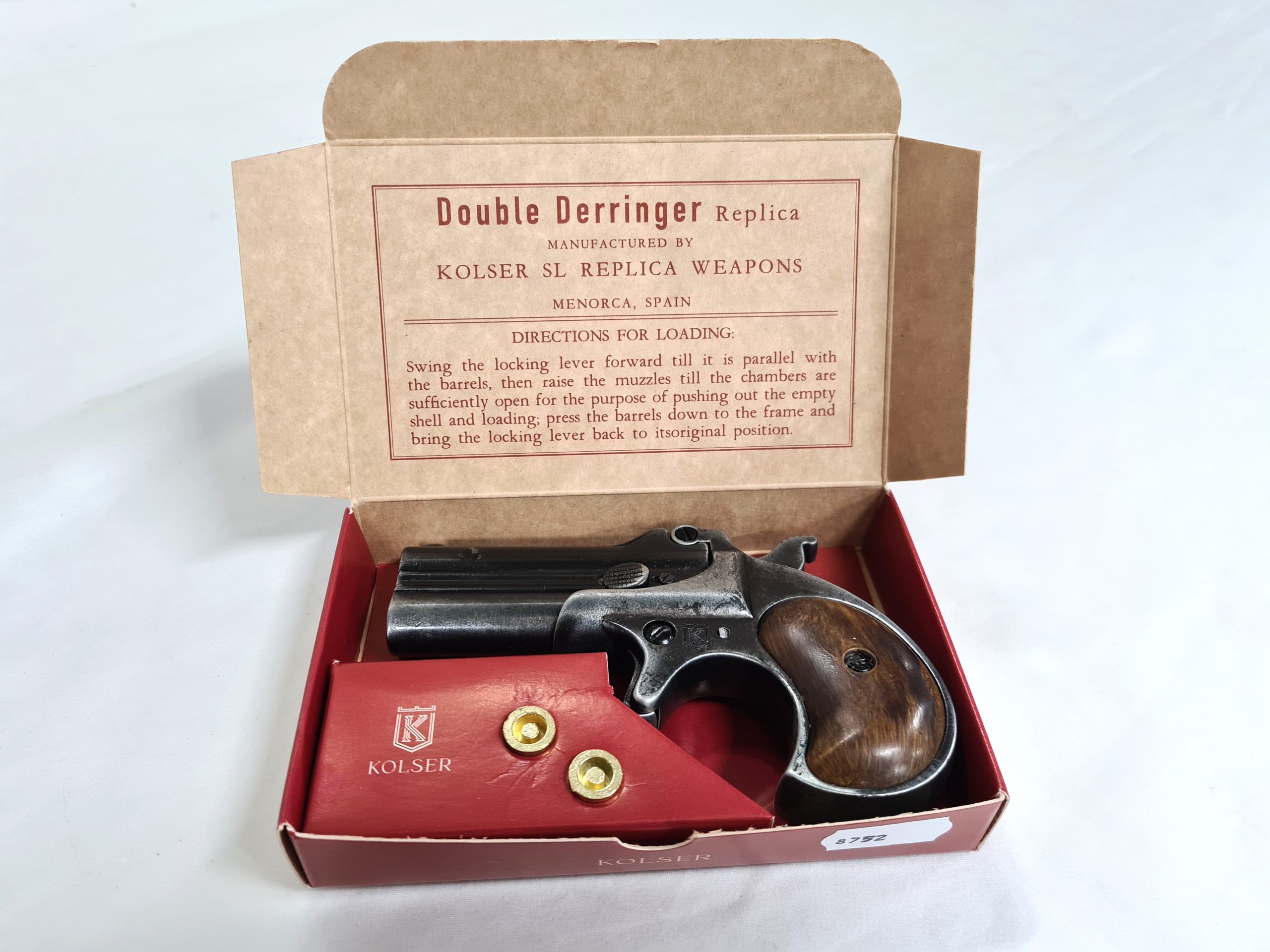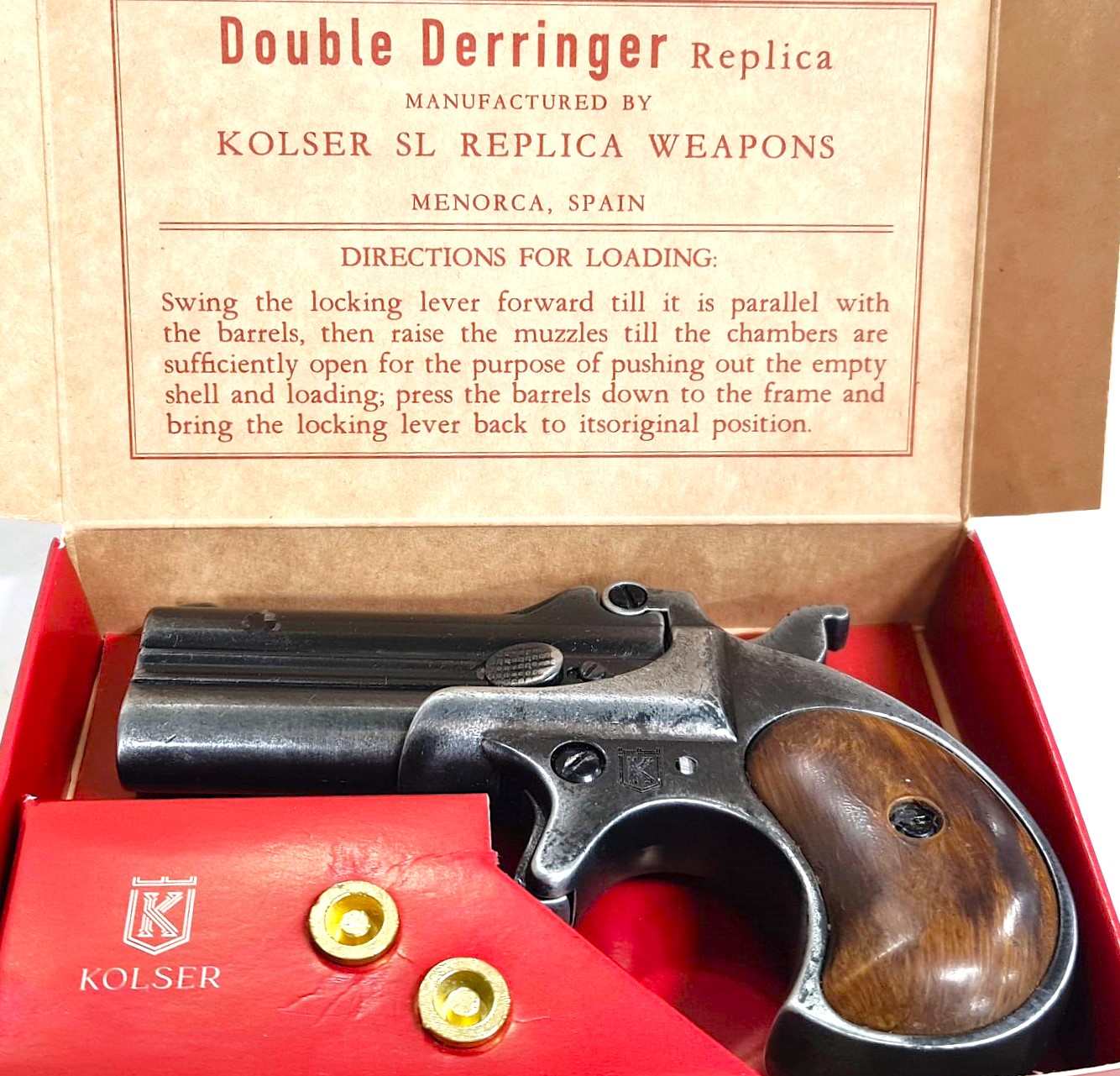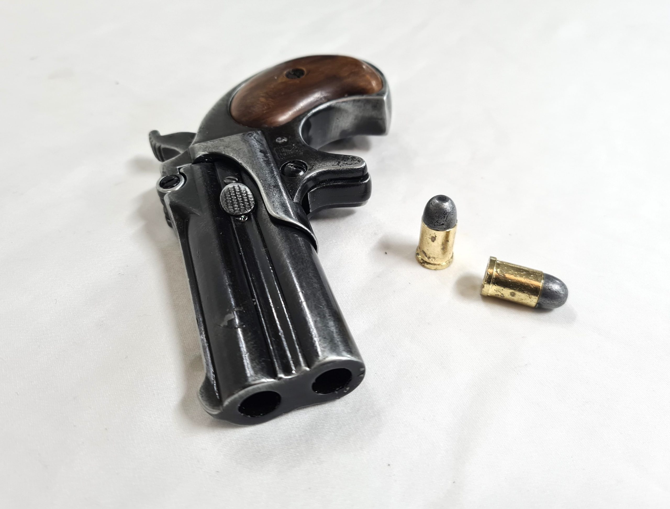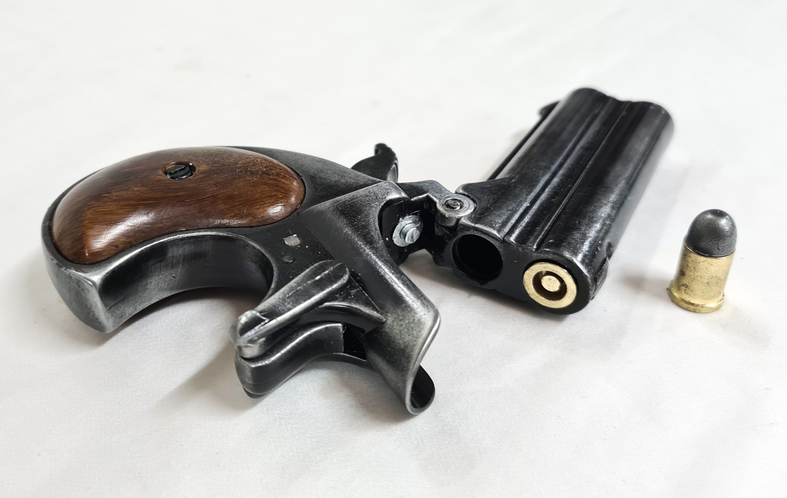 DERRINGER PISTOL, double barrel replica with break opening lever, cocking hammer and dry fire trigger. Comes with two chambering replica bullets.