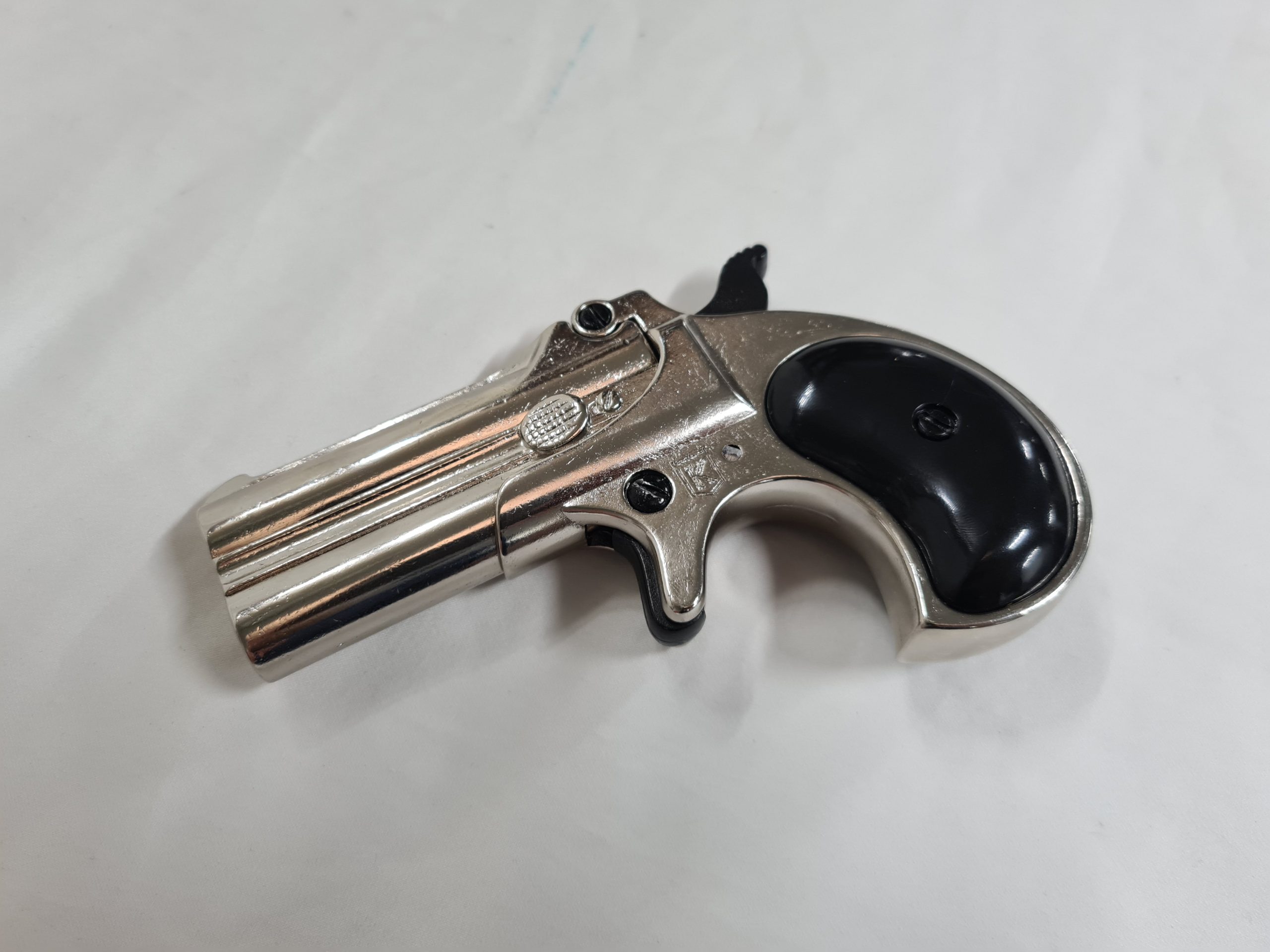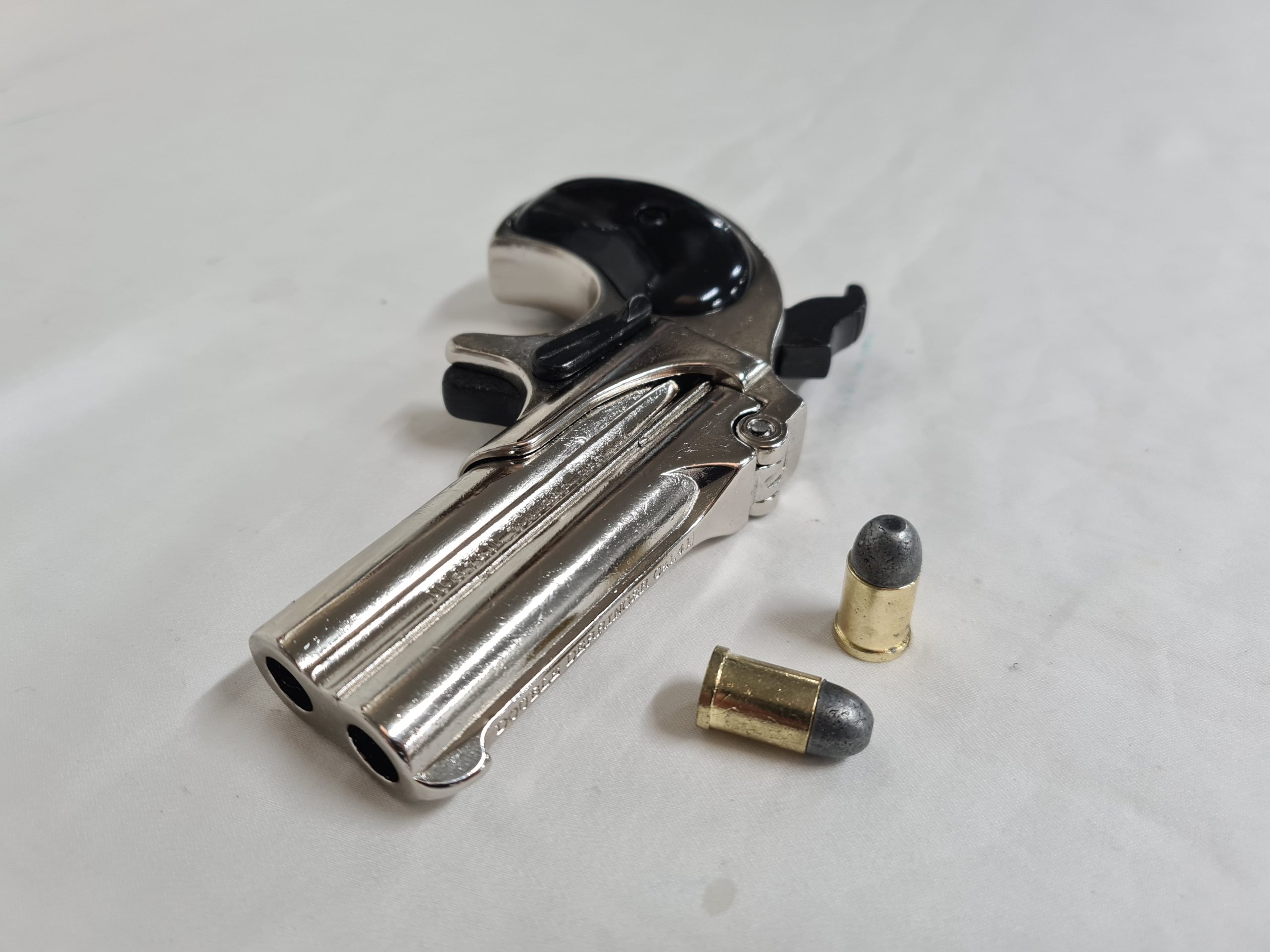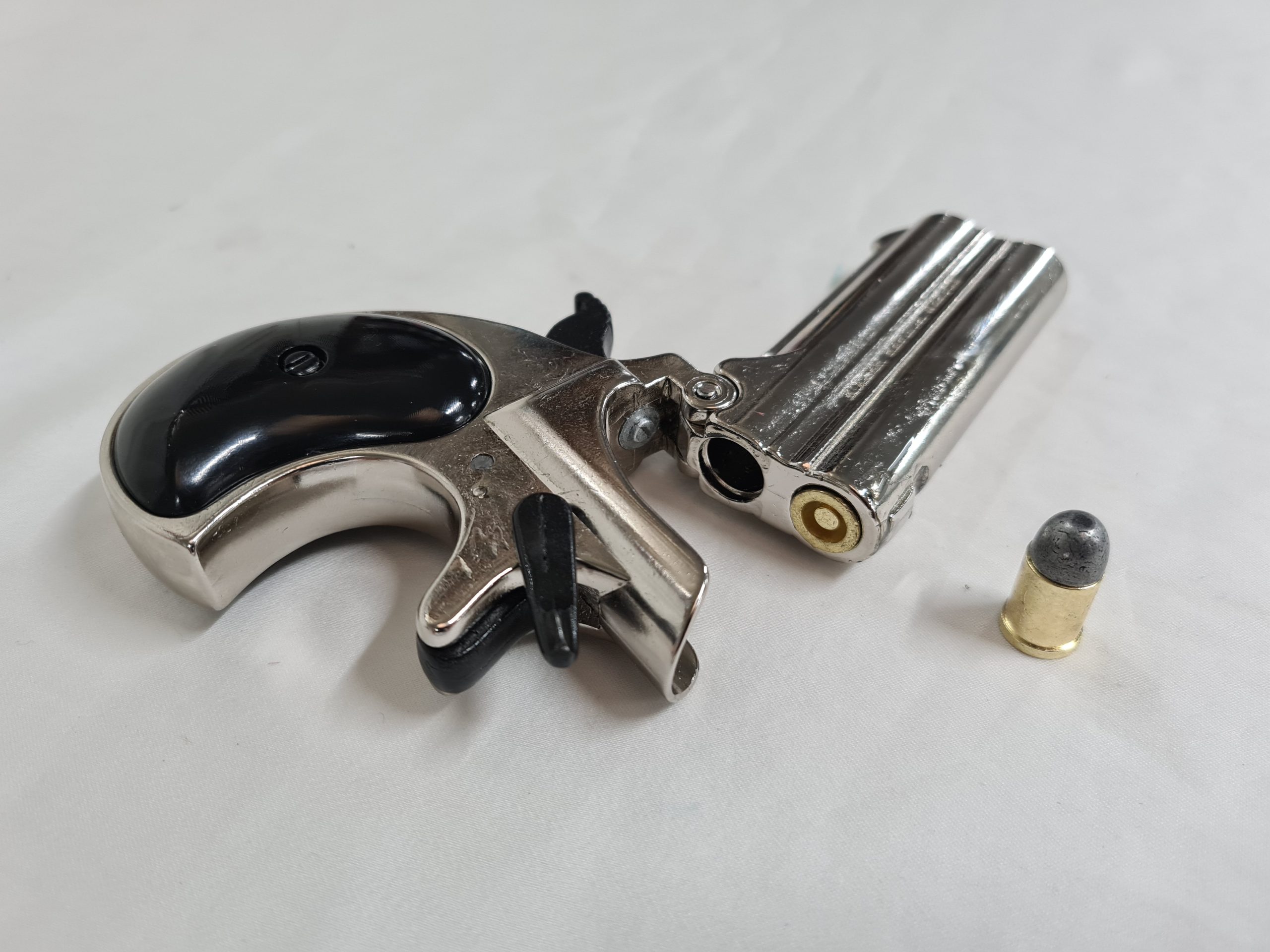 DERRINGER PISTOL, double barrel replica with break opening lever, cocking hammer and dry fire trigger. Comes with two chambering replica bullets.