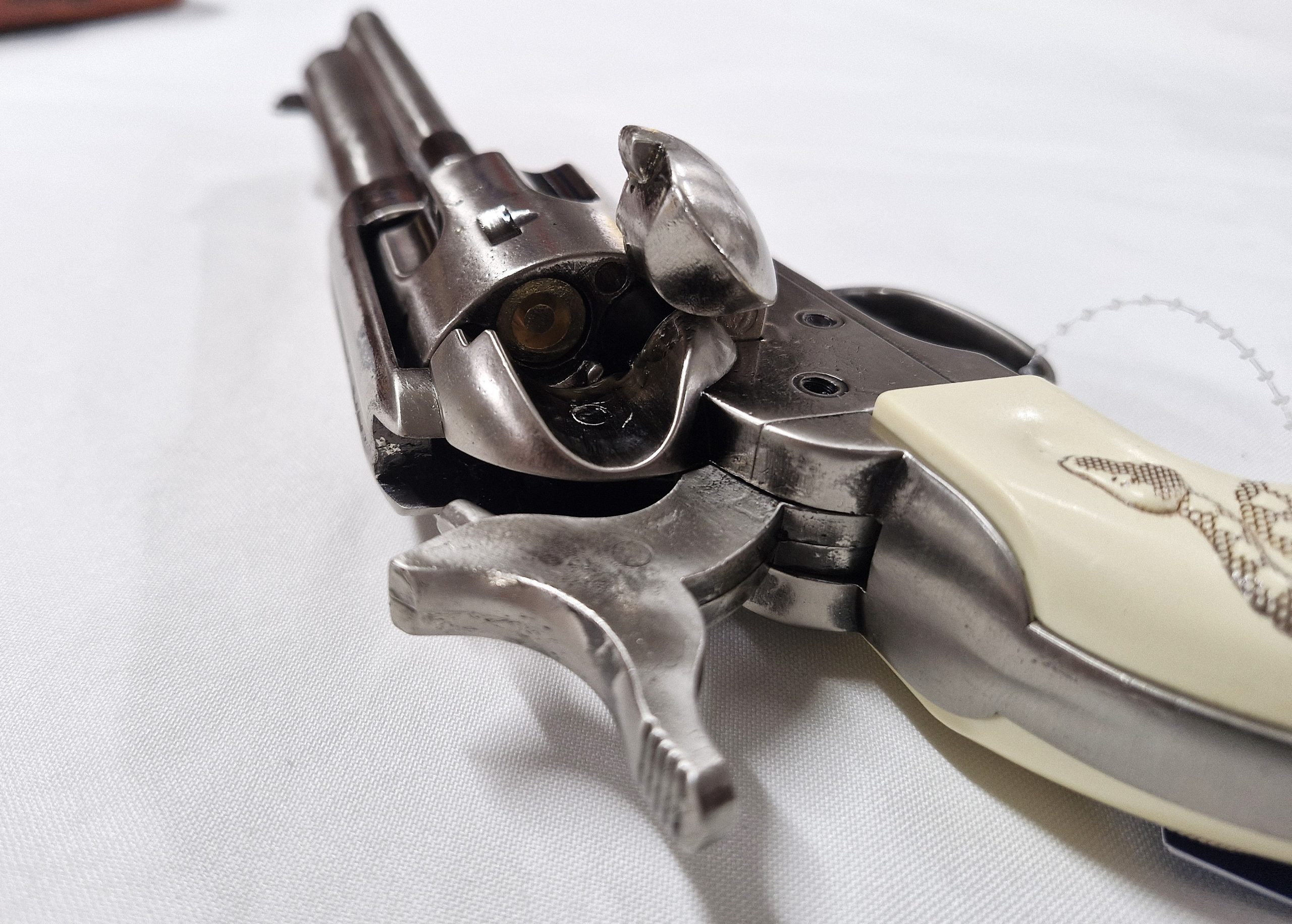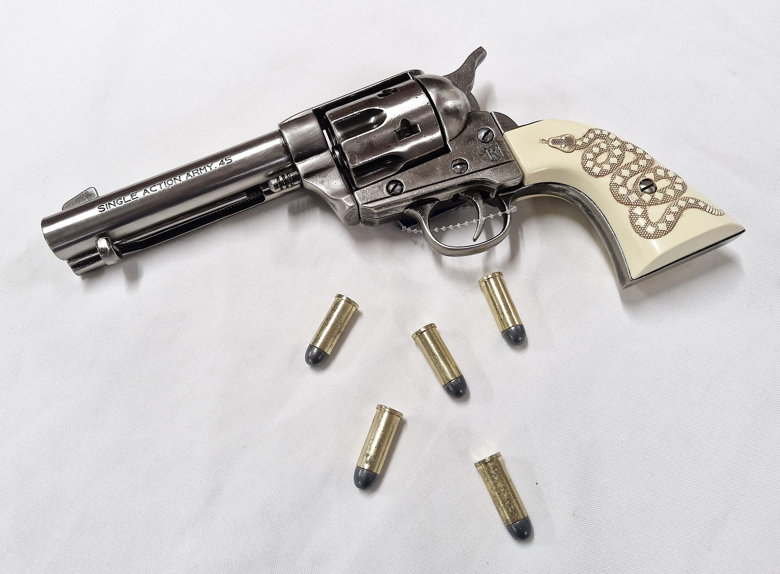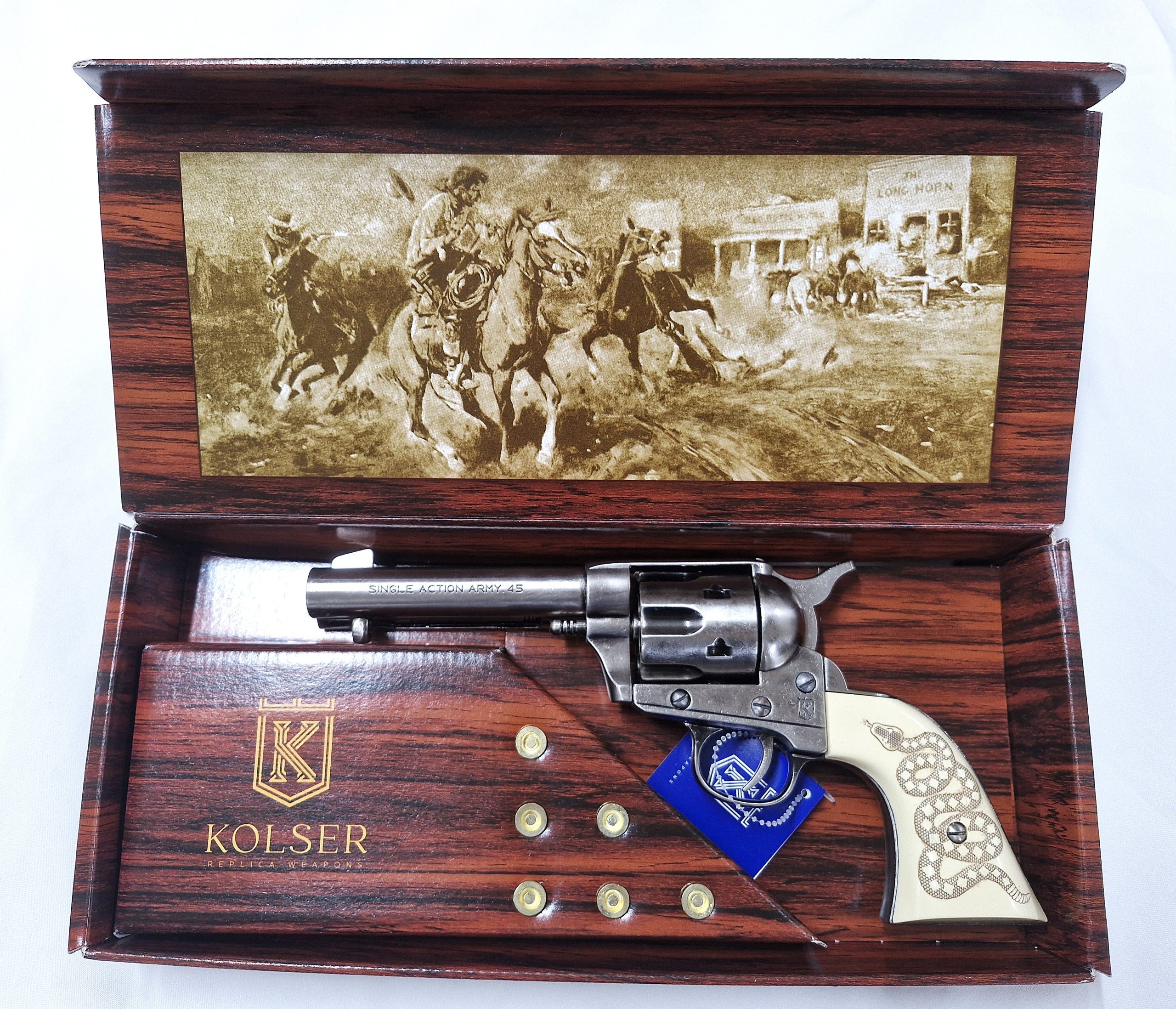 This replica Fast Draw Colt 45cal revolver by Kolser has very realistic appearance with polished nickel finish and faux ivory snake pattern grips, 25.5 cm in length, 940g weight, cap firing capability and comes in presentation box with 6 replica brass tone rounds with lead look bullet heads.
