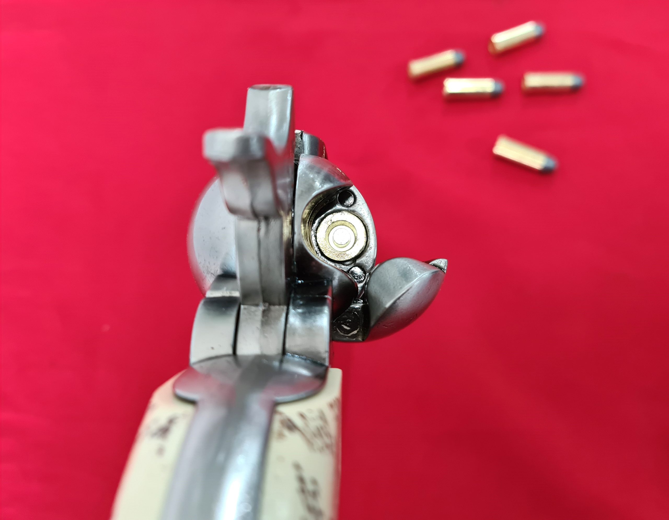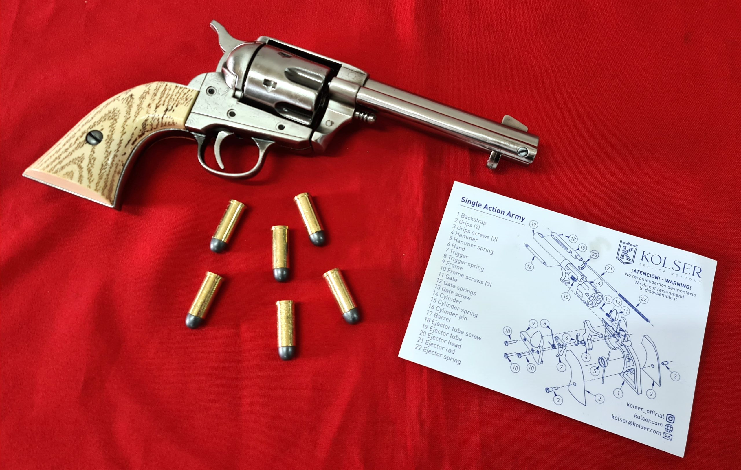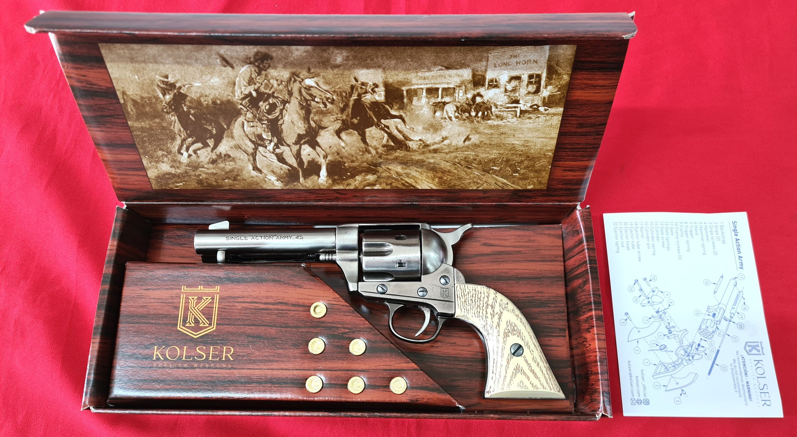 This replica Fast Draw Colt 45cal revolver by Kolser has very realistic appearance with polished nickel finish and faux ivory grips, 25.5 cm in length, 940g weight, cap firing capability and comes in presentation box with 6 replica brass tone rounds with lead look bullet heads.