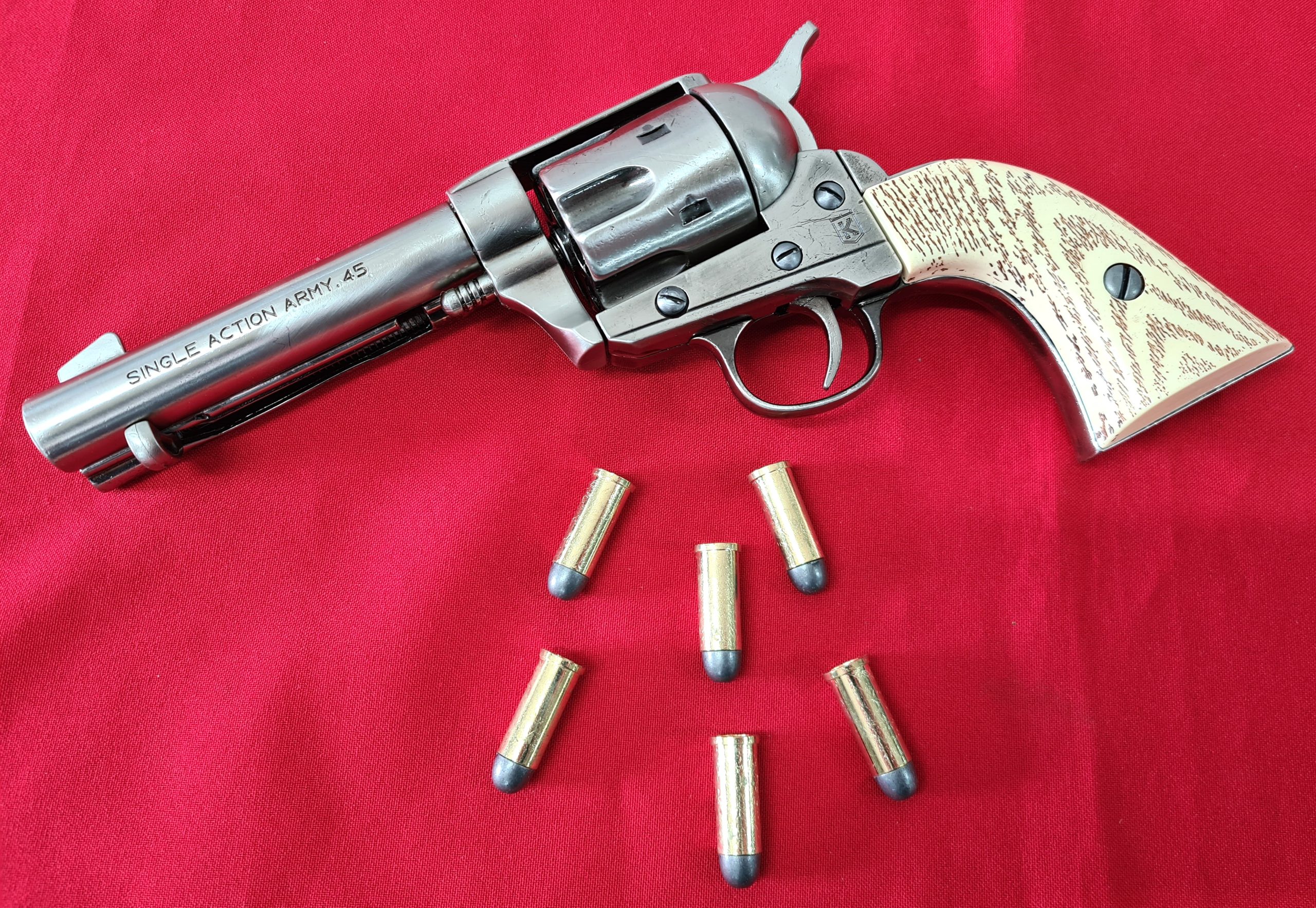 Replica Colt 45 Fast Draw 4.75-inch Revolver with 6 faux bullets and gift box by Kolser – Polished Nickel with faux ivory handle – 1062-1MNP