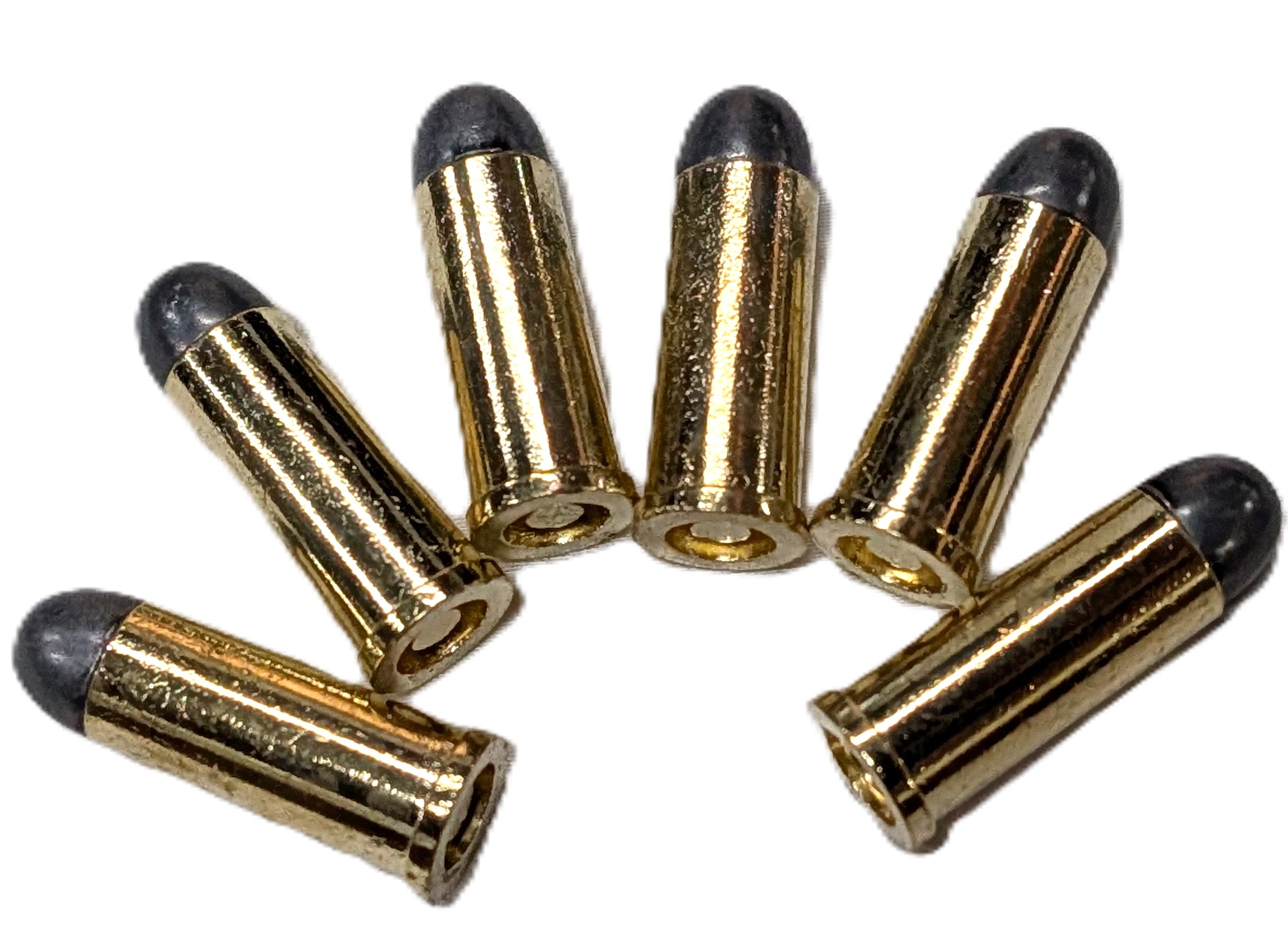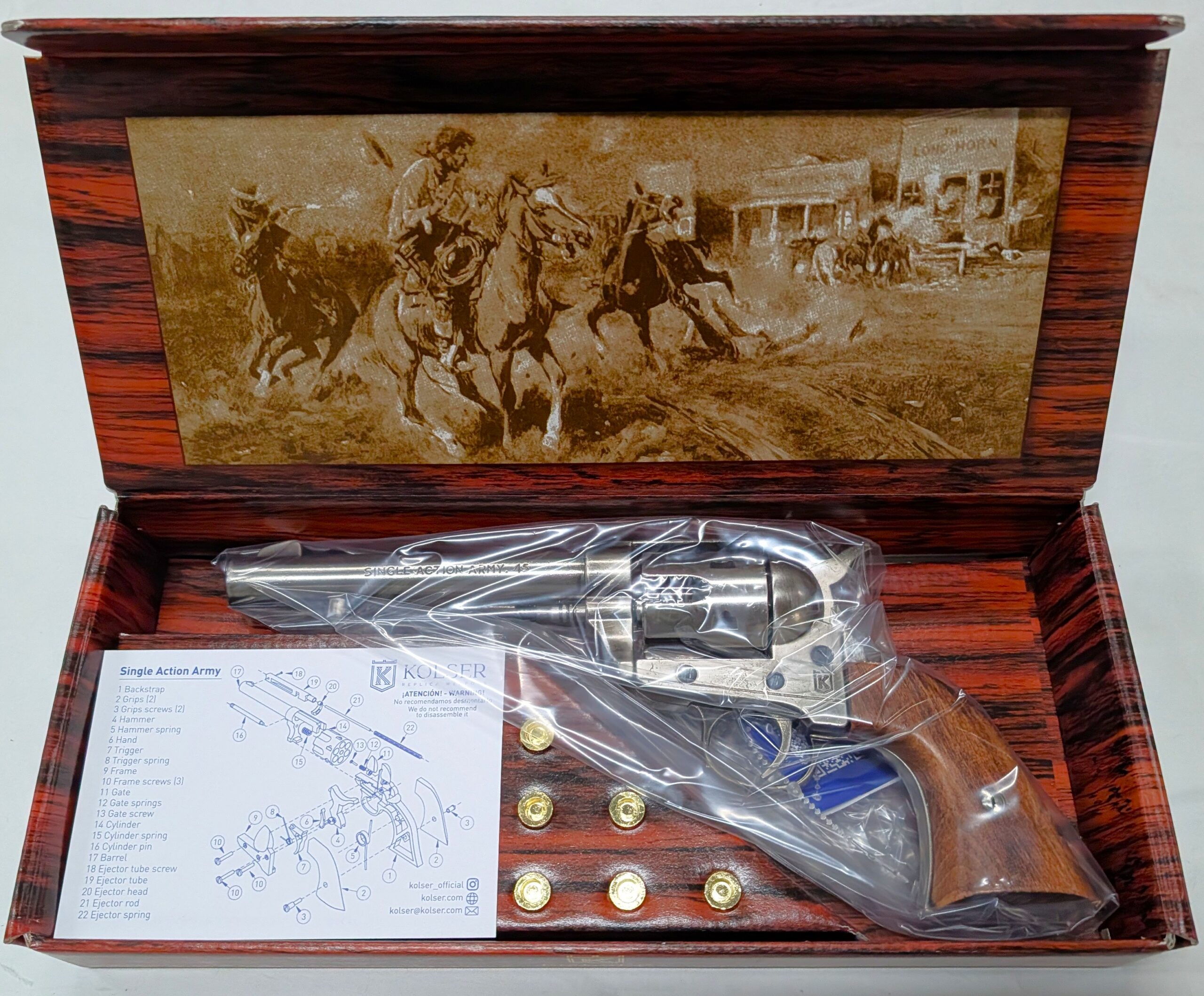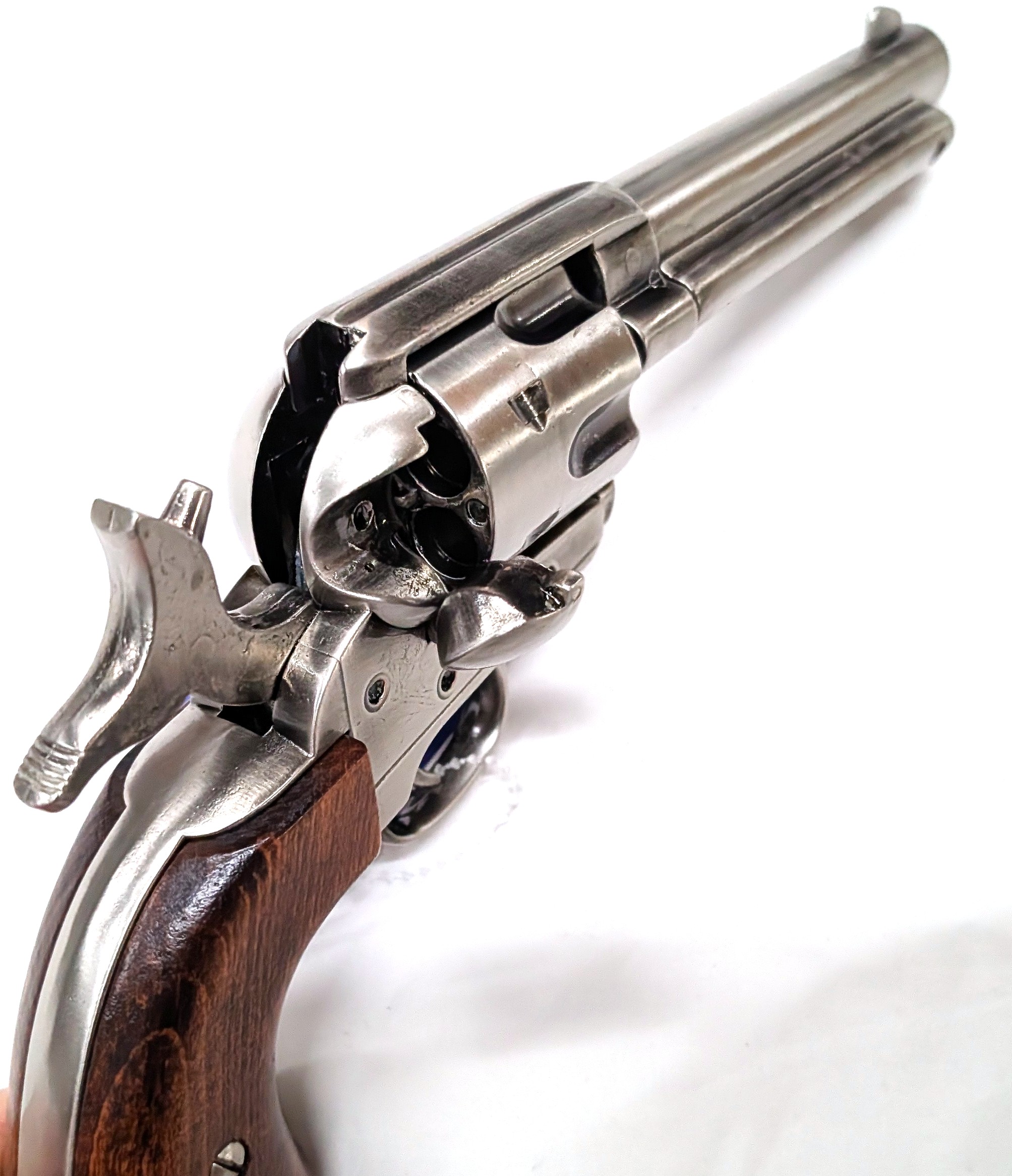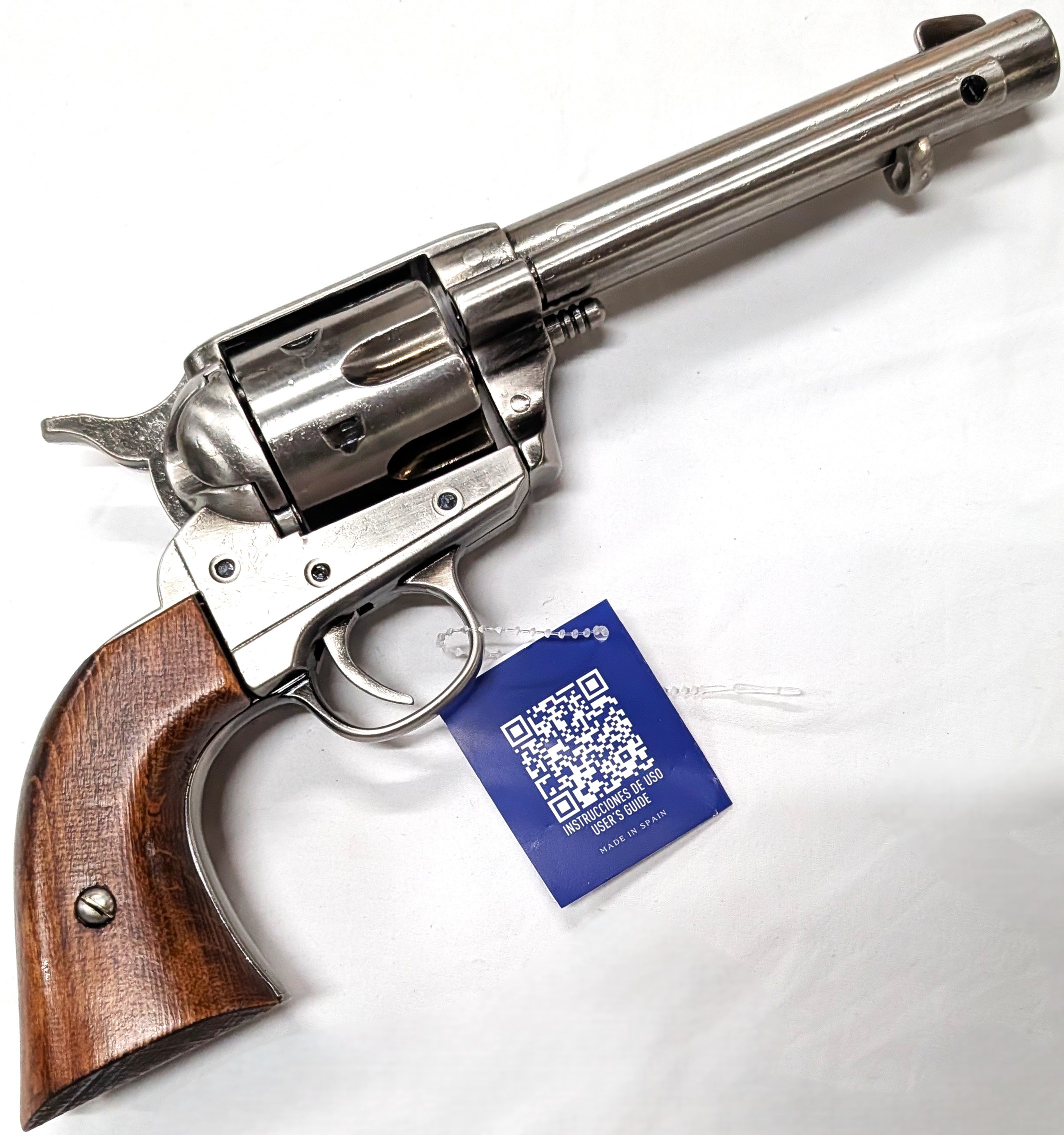 Replica Peacemaker Single Action Army Colt 45cal Revolver. Very realistic appearance with nickel plated finish and wooden grips, 27cm in length, cap firing capability and comes in presentation box with 6 replica brass tone rounds with lead look bullet heads. Great addition to your collection of Replica Firearms.