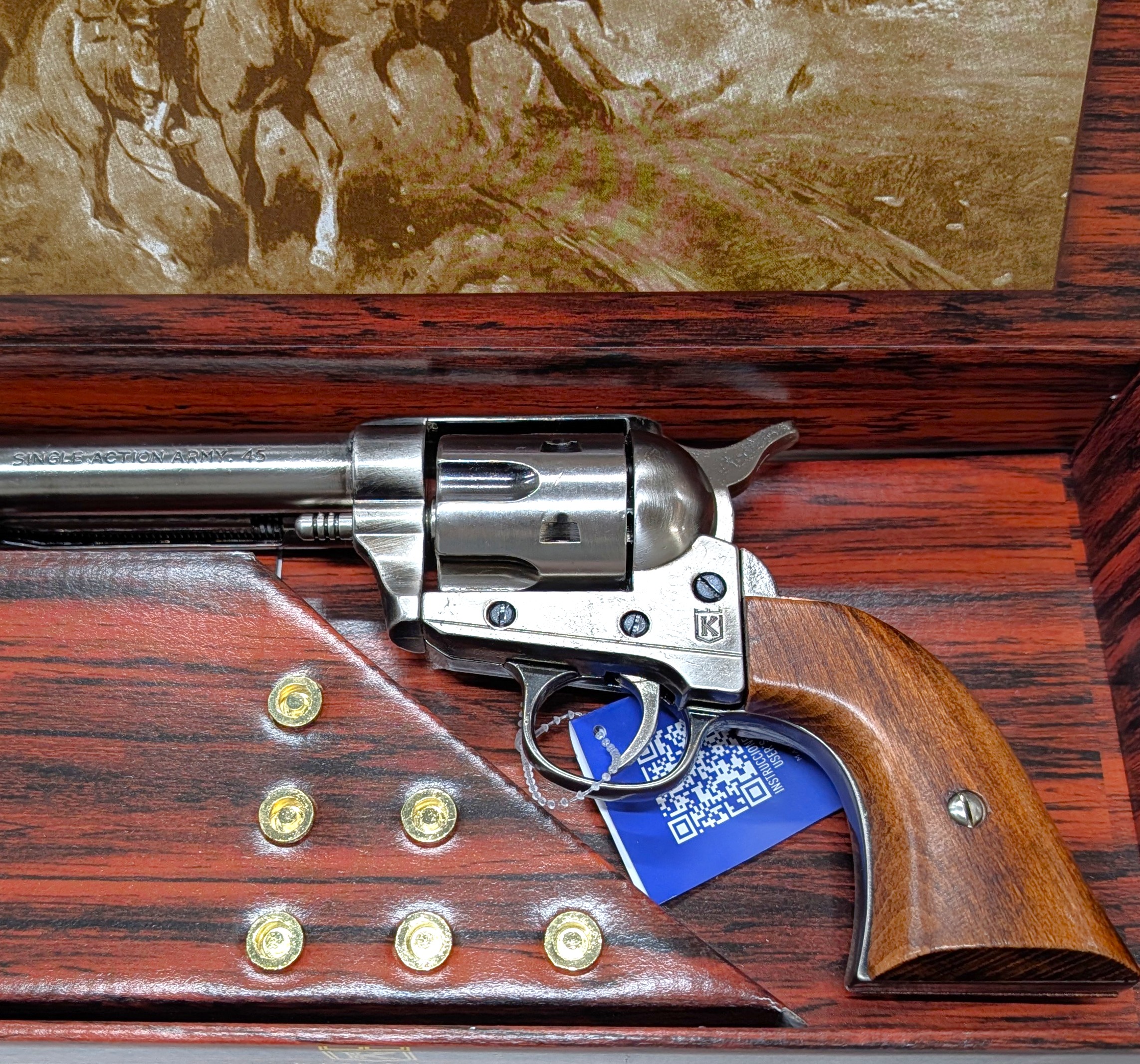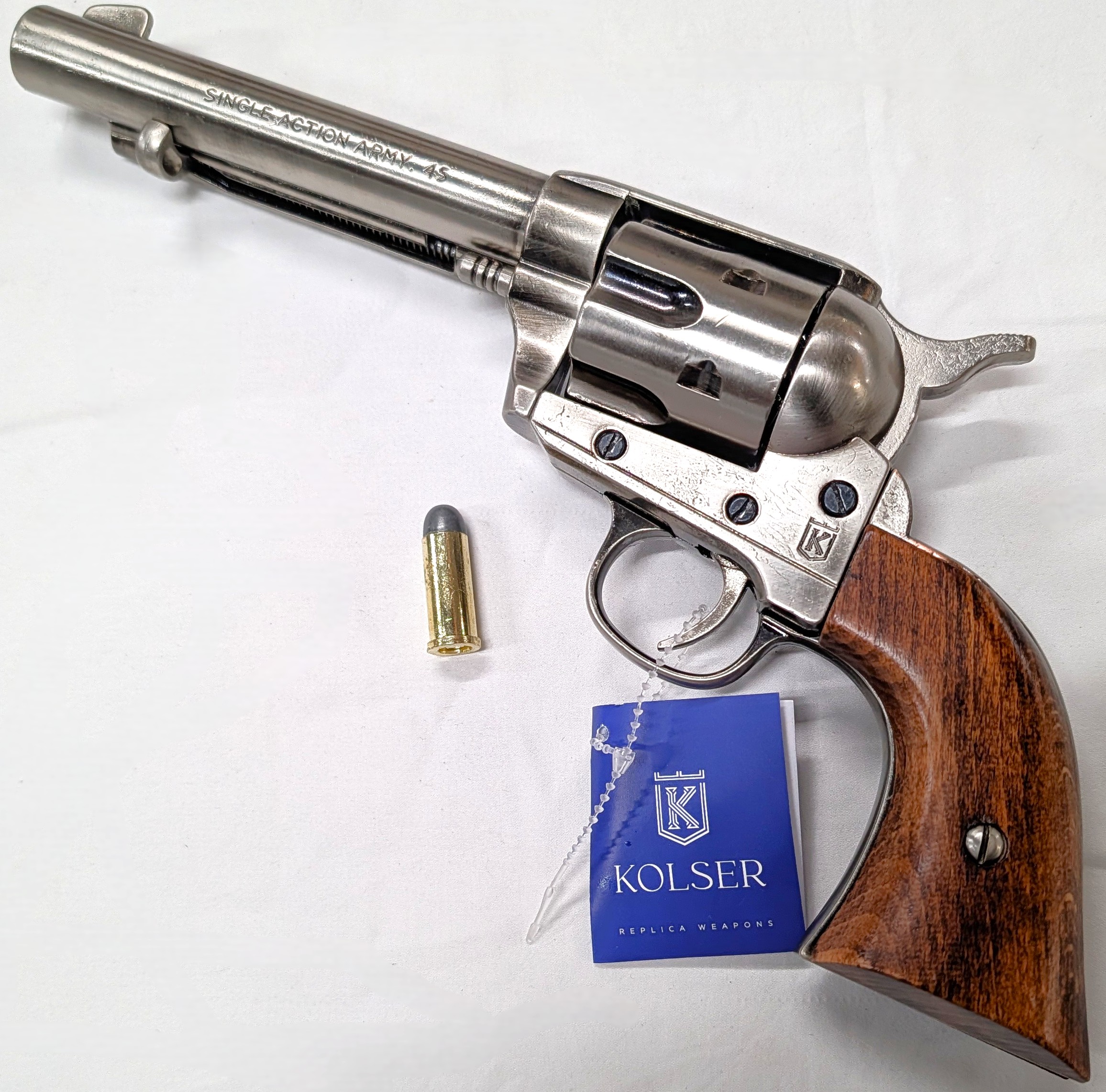 Kolser Western Peacemaker Single Action Army Revolver Colt 45 with 6 cap gun bullet rounds and gift box – 27cm Silver with wood grips – 1065-1WNP