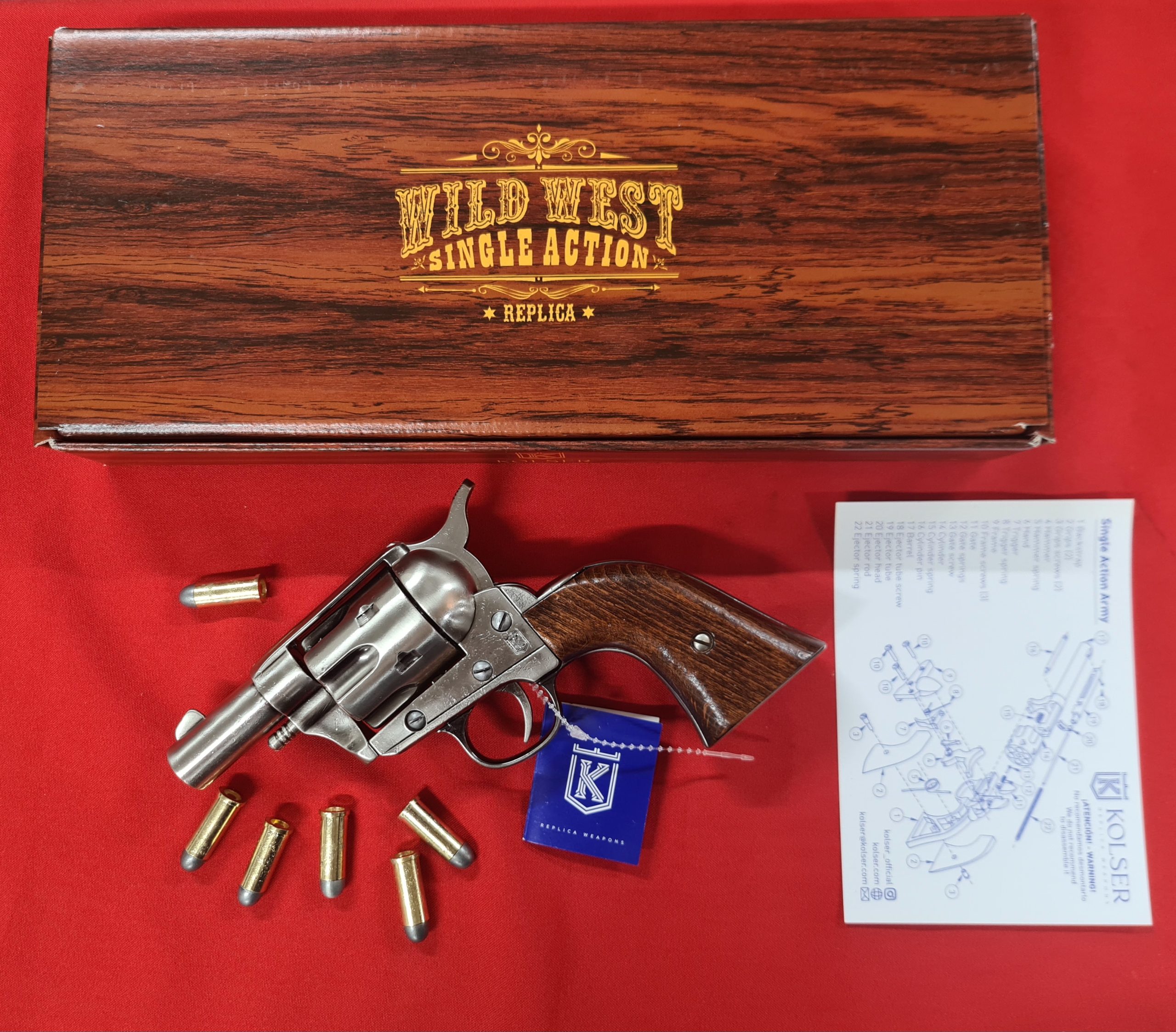 Replica Colt Pocket Revolver .45 with 6 cap gun bullet rounds and gift box by Kolser – Silver with wood handle – 1061-WNP