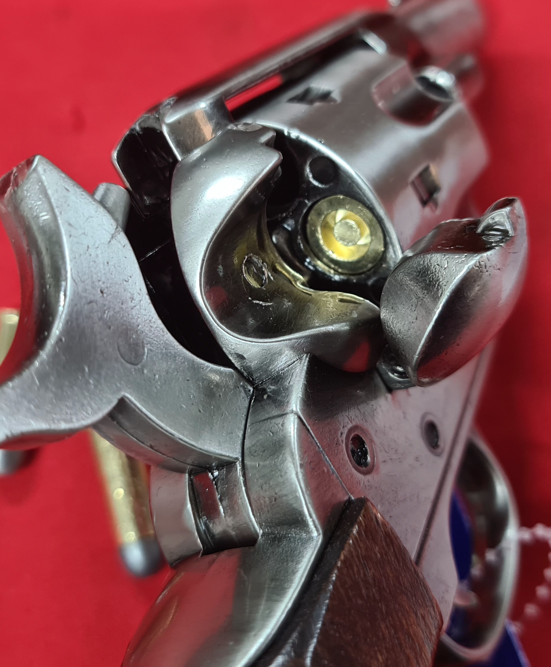 Replica Colt Single Action Army 45cal Revolver with snub nose barrel. Very realistic appearance with burnished steel tone finish and real wood grips with good grain pattern handle. Total length 19cm, with a 6cm barrel.