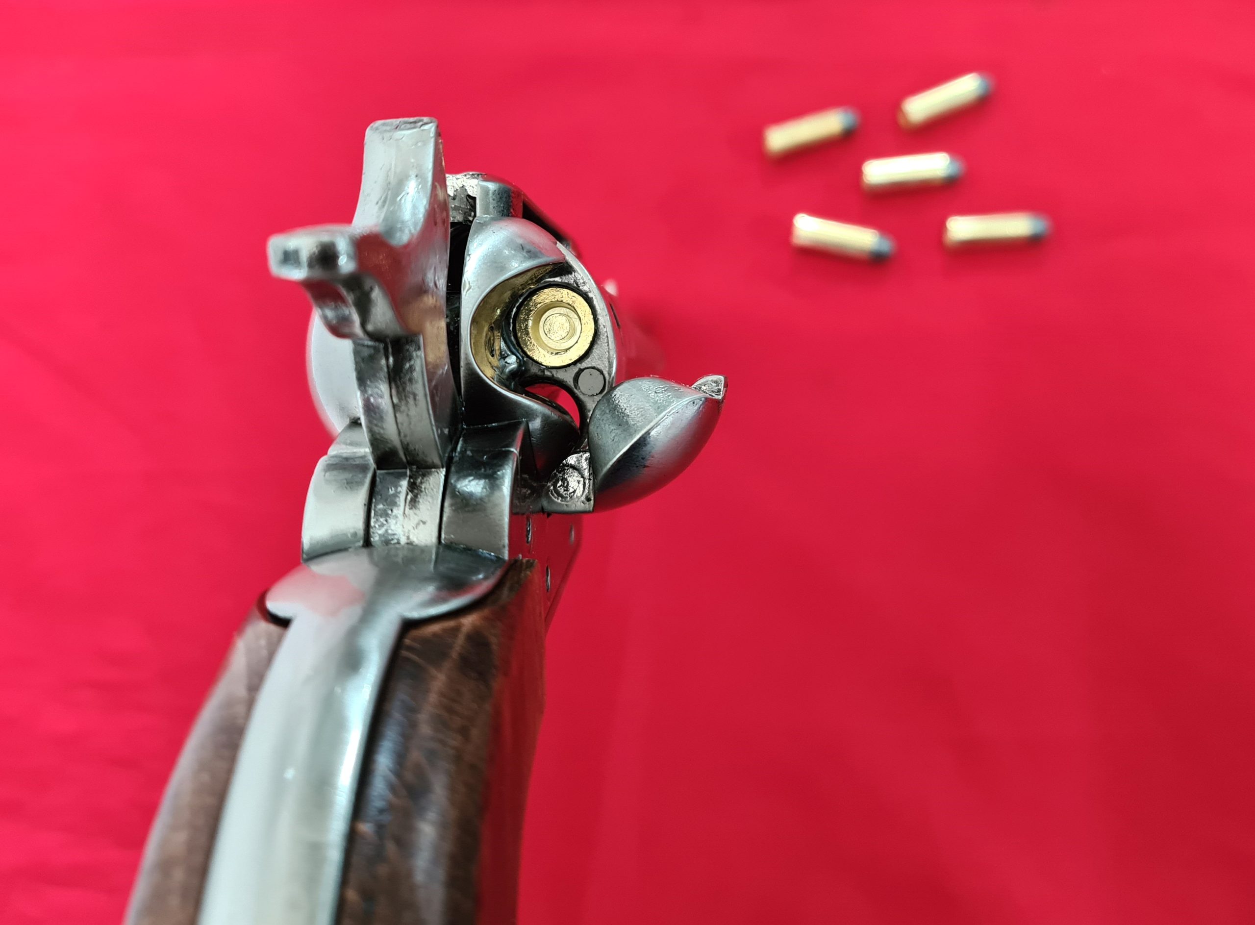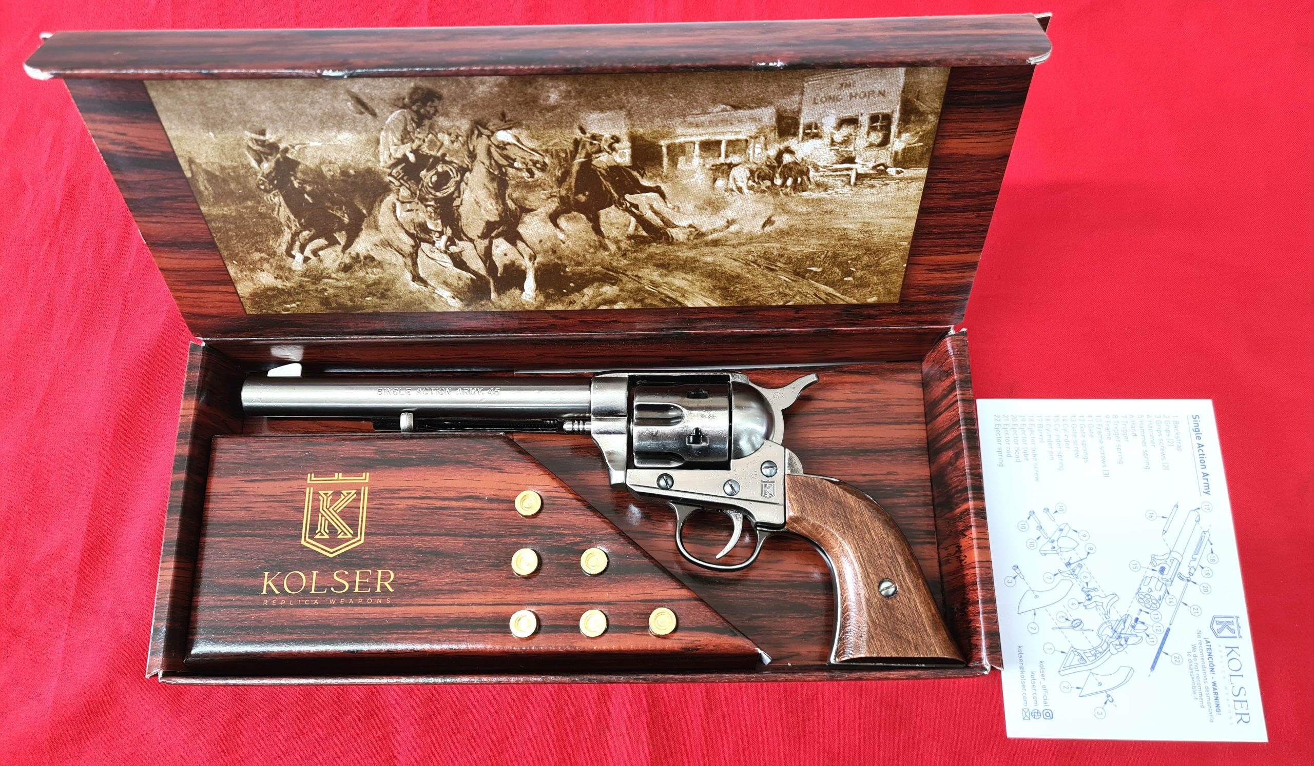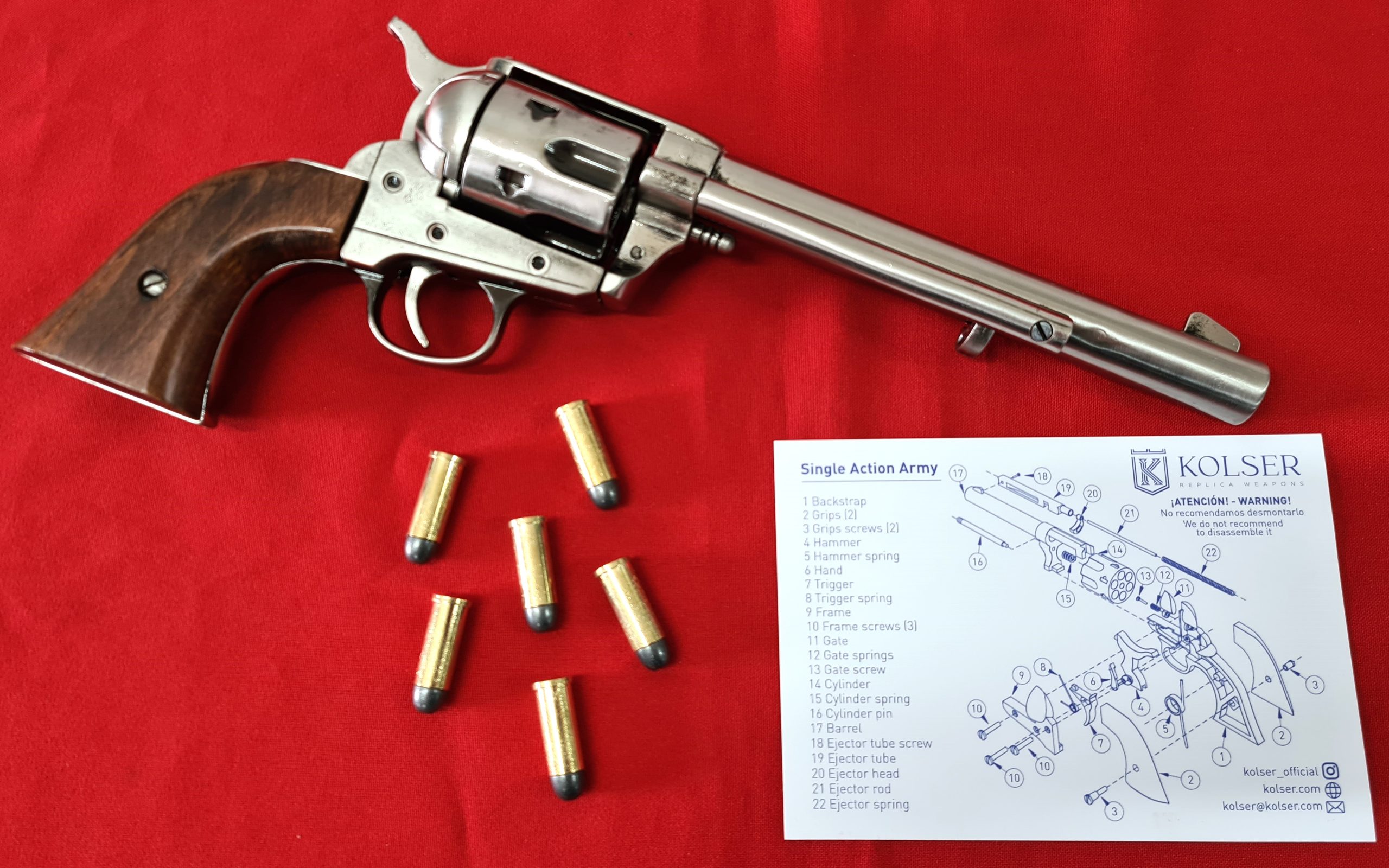 Replica NON-FIRING Single Action Army Colt 45cal Revolver. Very realistic appearance with silver tone finish and wooden handle, 31 cm in length, cap firing capability and comes in presentation box with 6 replica brass tone rounds with lead look bullet heads. Great addition to your collection of replica firearms.