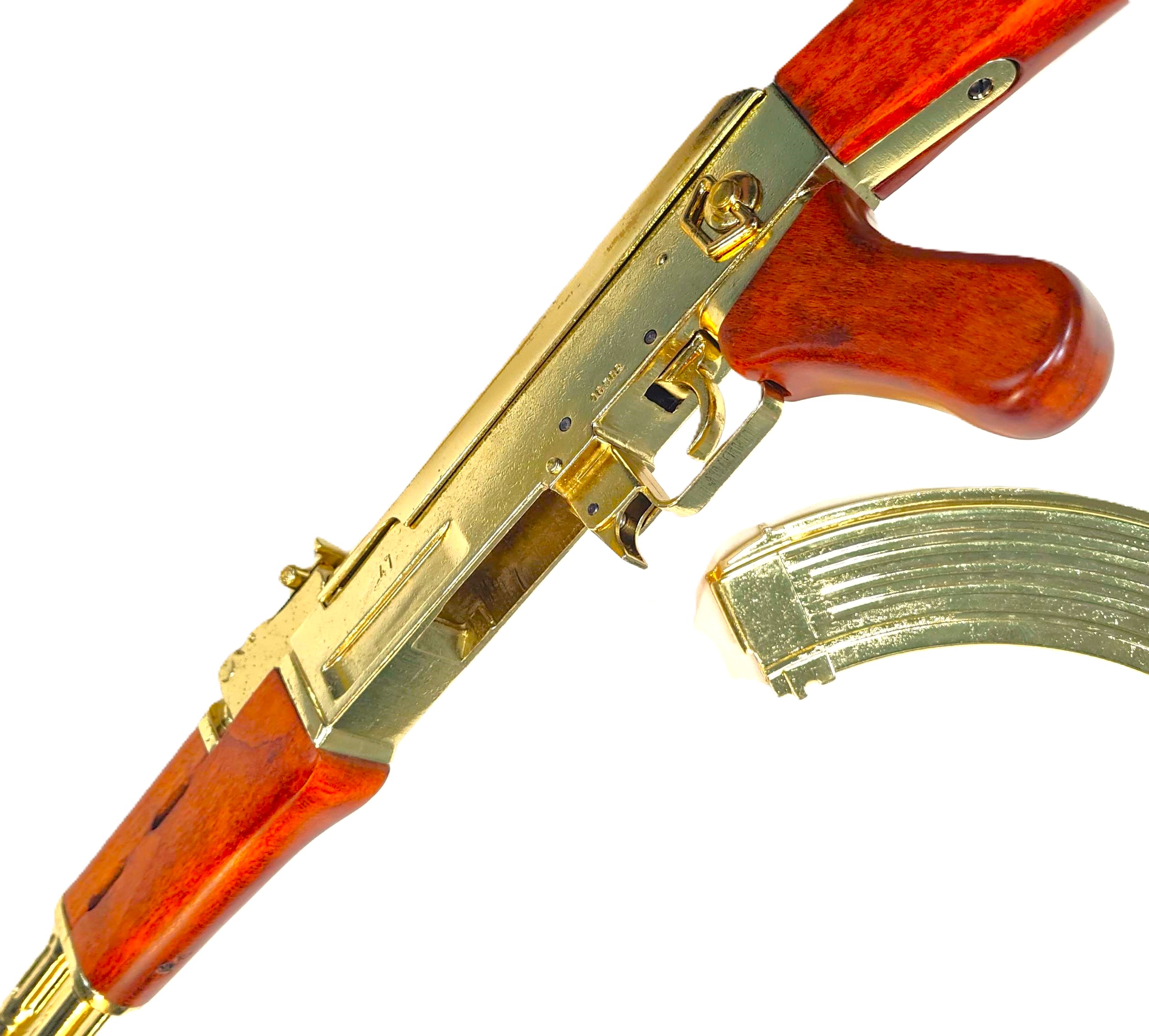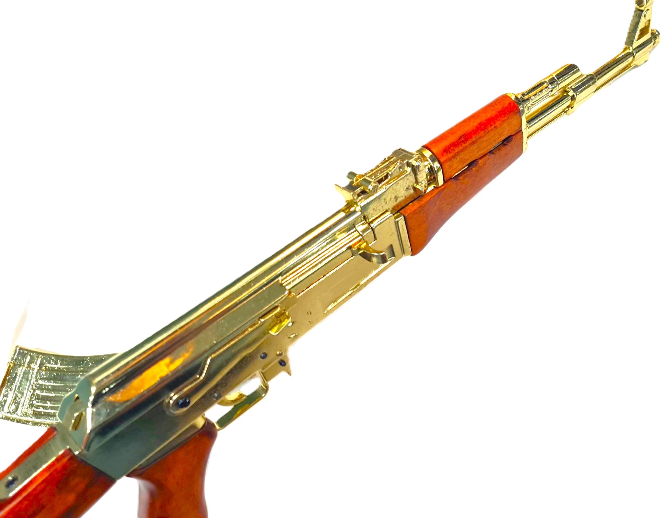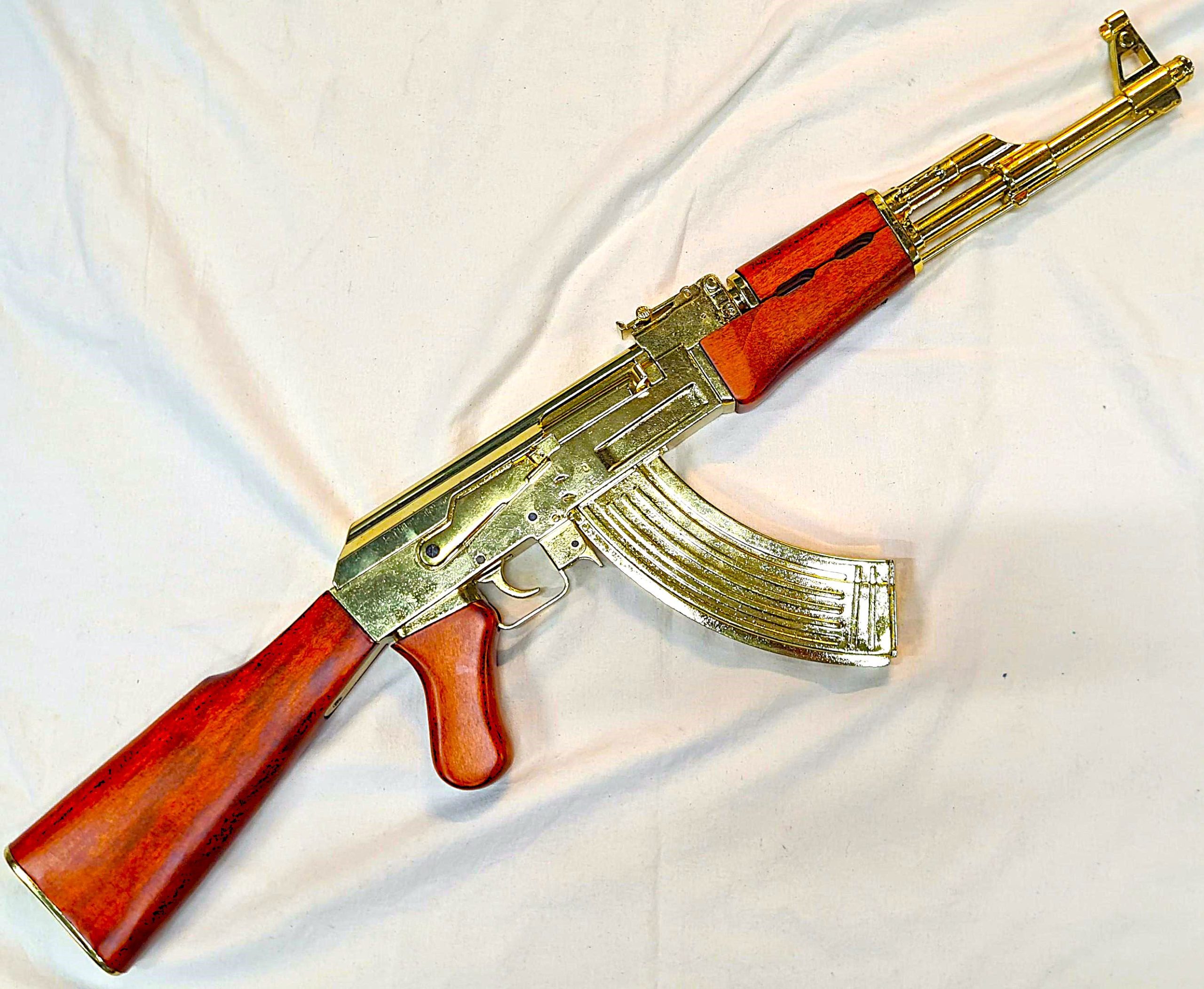 Offered is a very well presented Russian AK-47 Dennix Replica Rifle in Gold finish!! The rifle has a detachable magazine & dust cover, working cocking handle and safety catch, wooden buttstock and foregrip. Like those captured by US forces from Saddam Hussein's palace in Iraq.