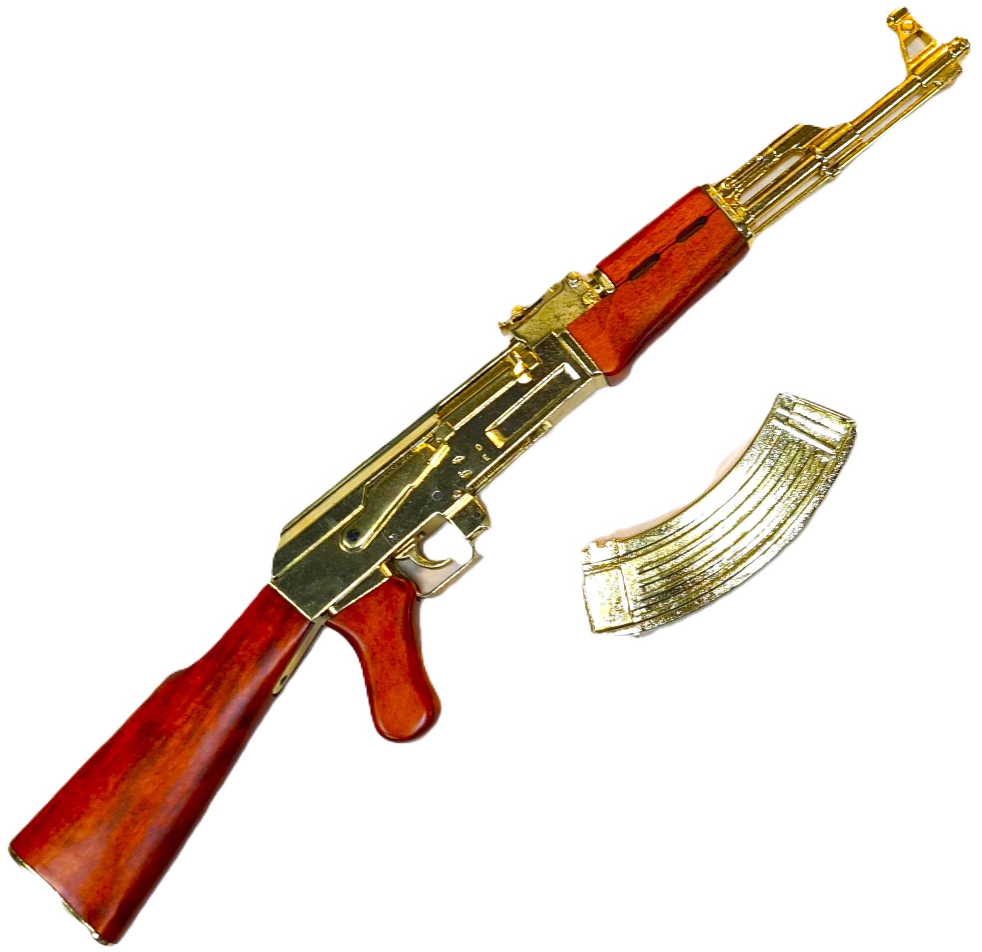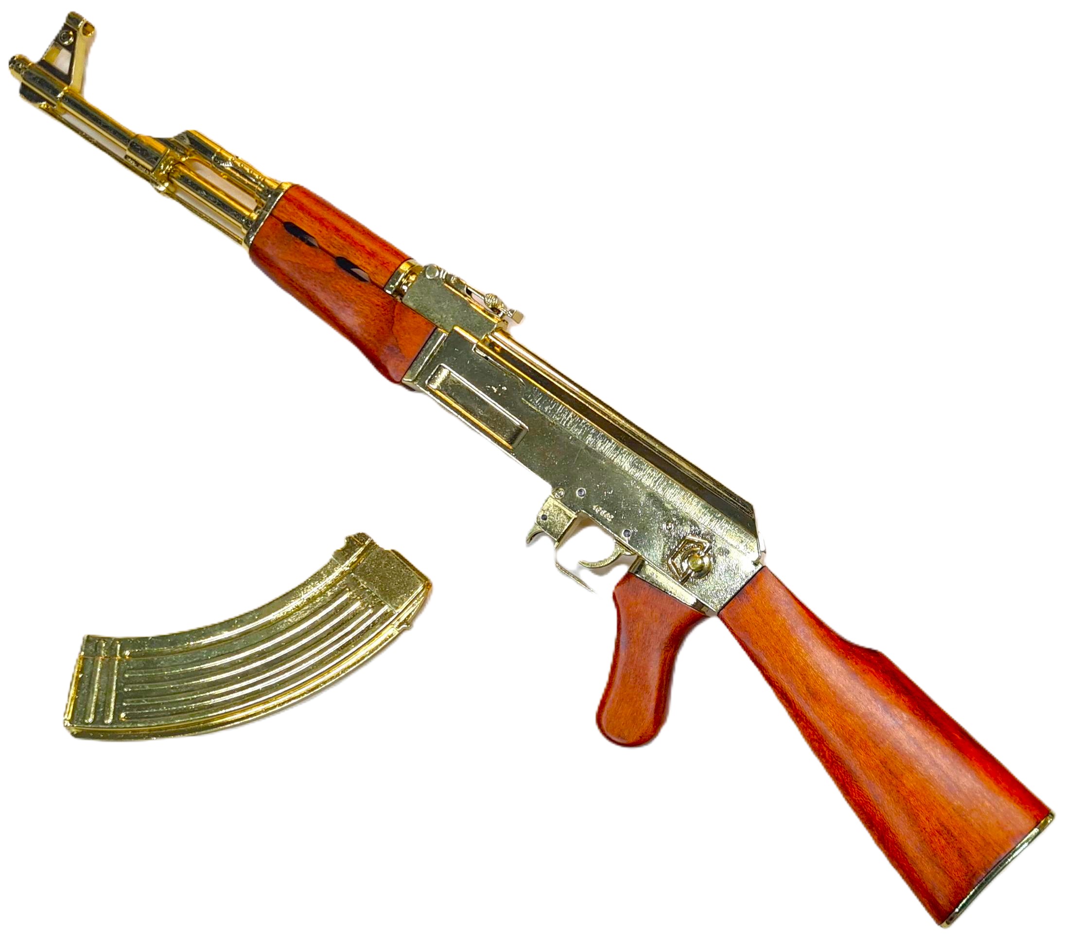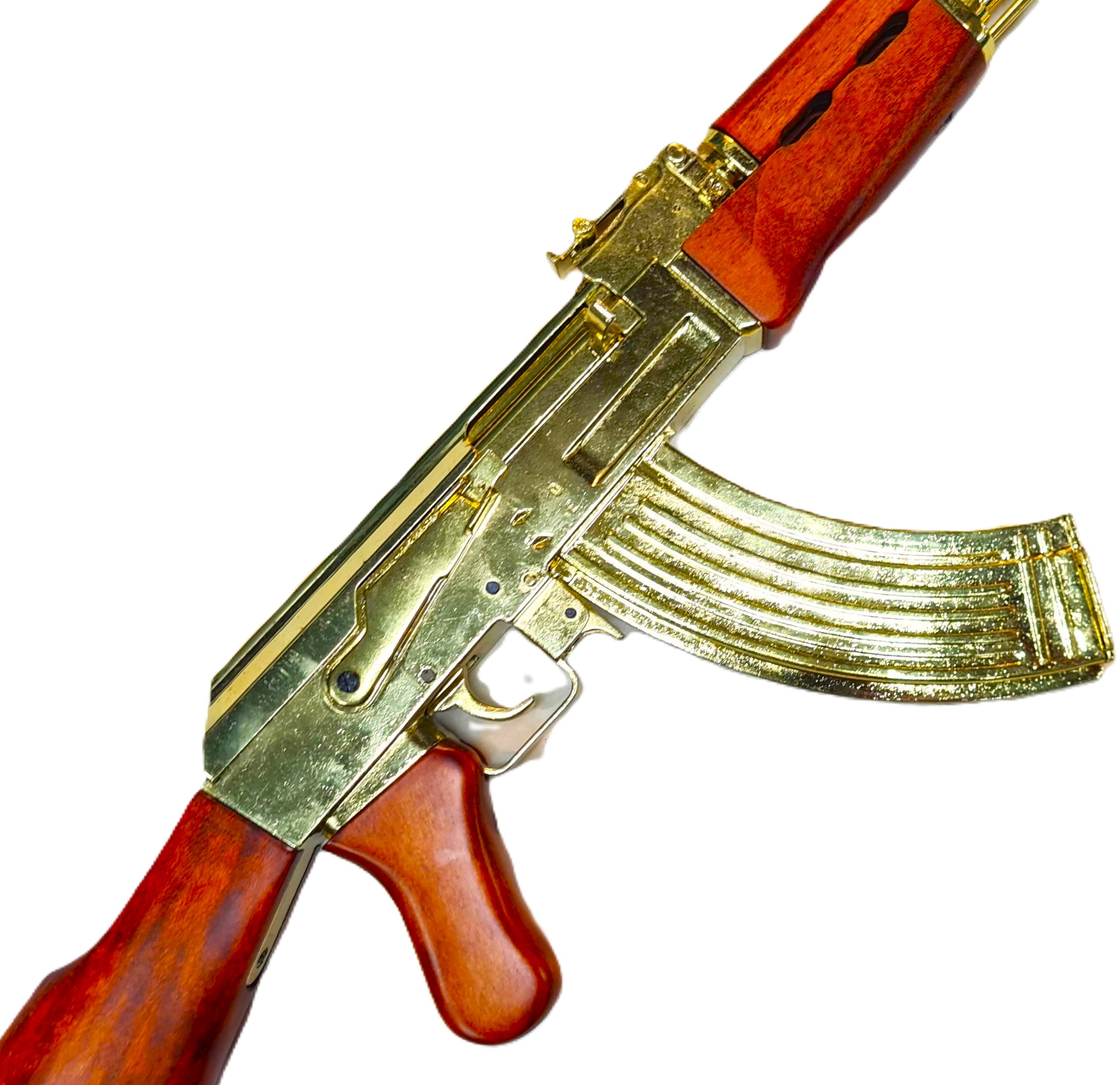 Offered is a very well presented Russian AK-47 Dennix Replica Rifle in Gold finish!! The rifle has a detachable magazine & dust cover, working cocking handle and safety catch, wooden buttstock and foregrip. Like those captured by US forces from Saddam Hussein's palace in Iraq.