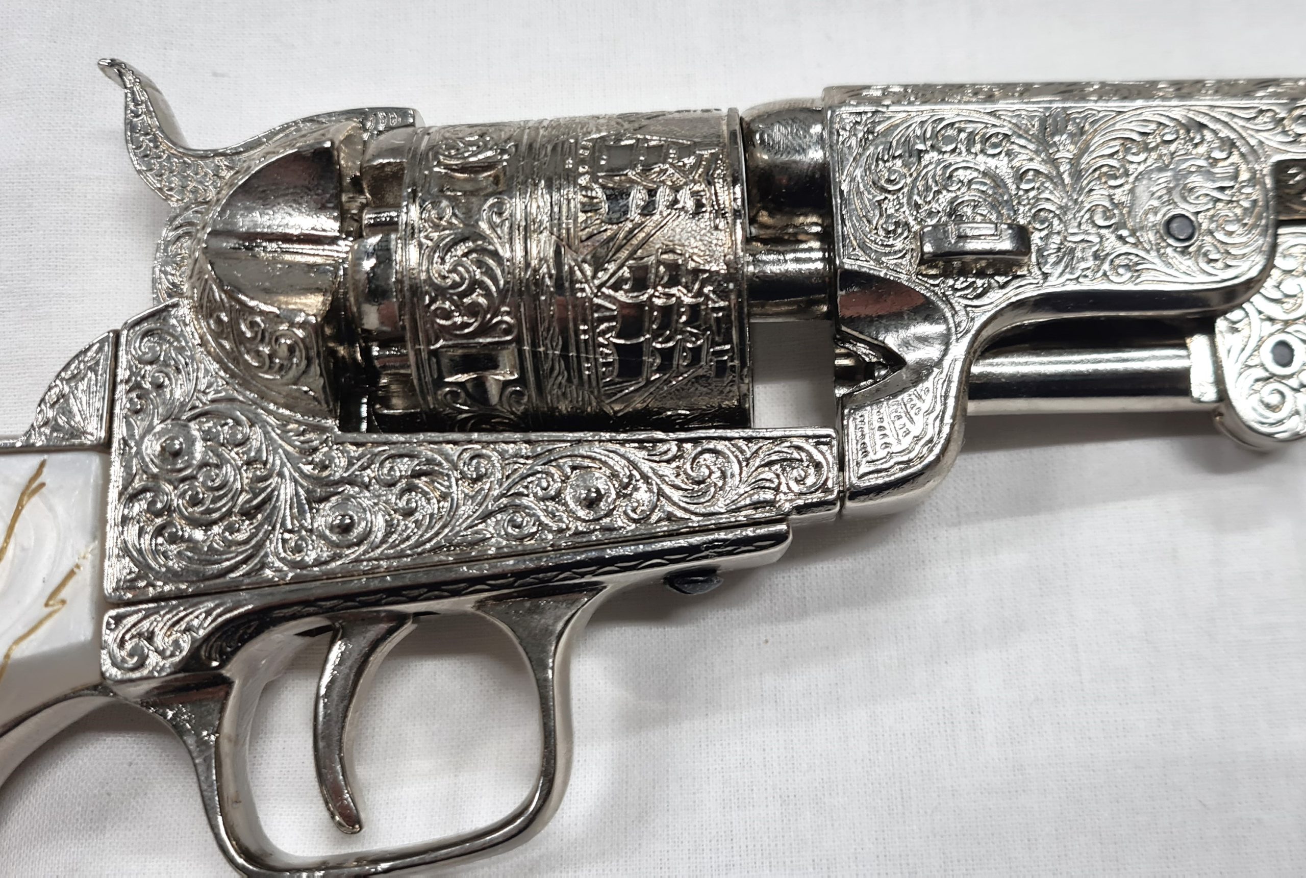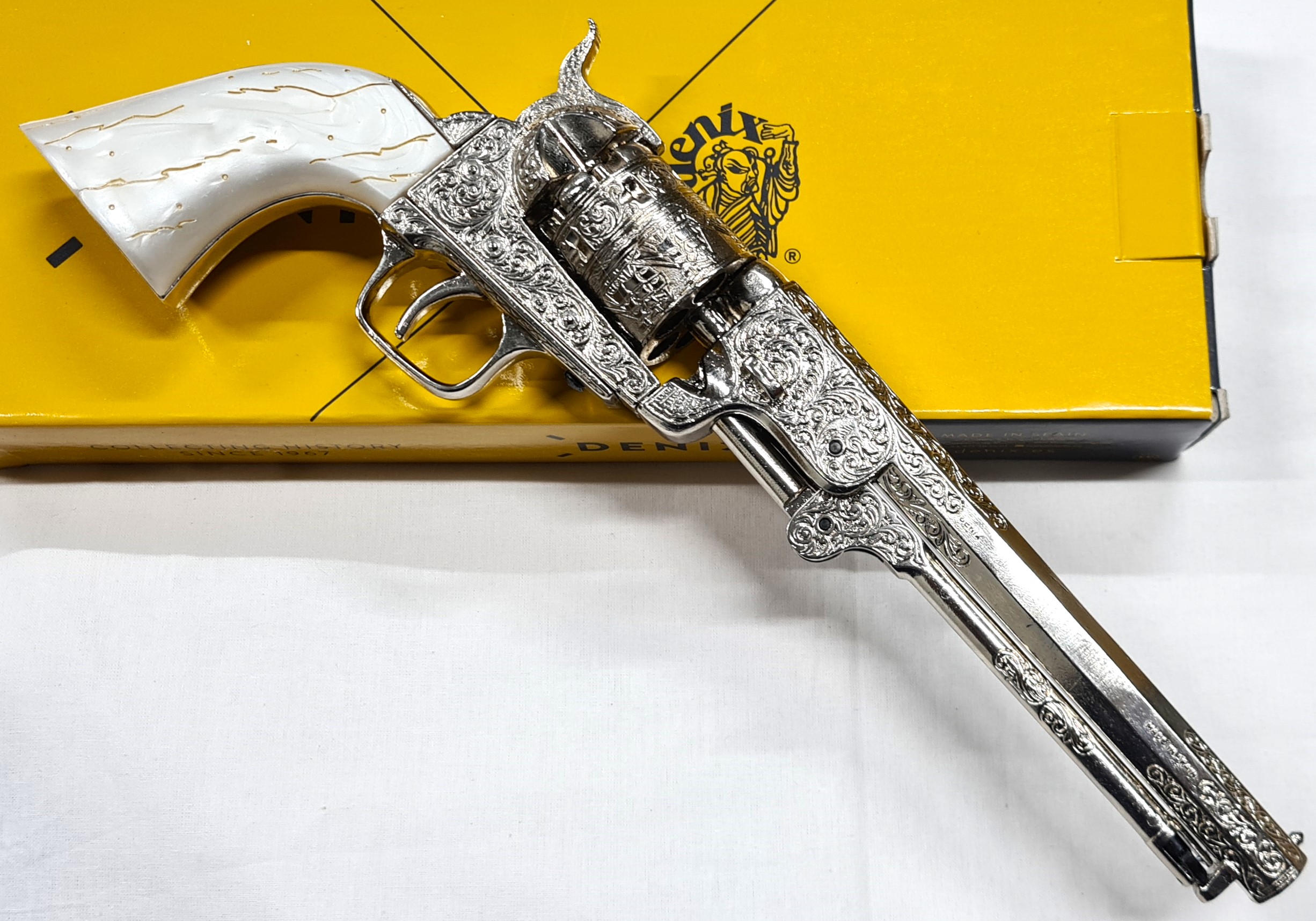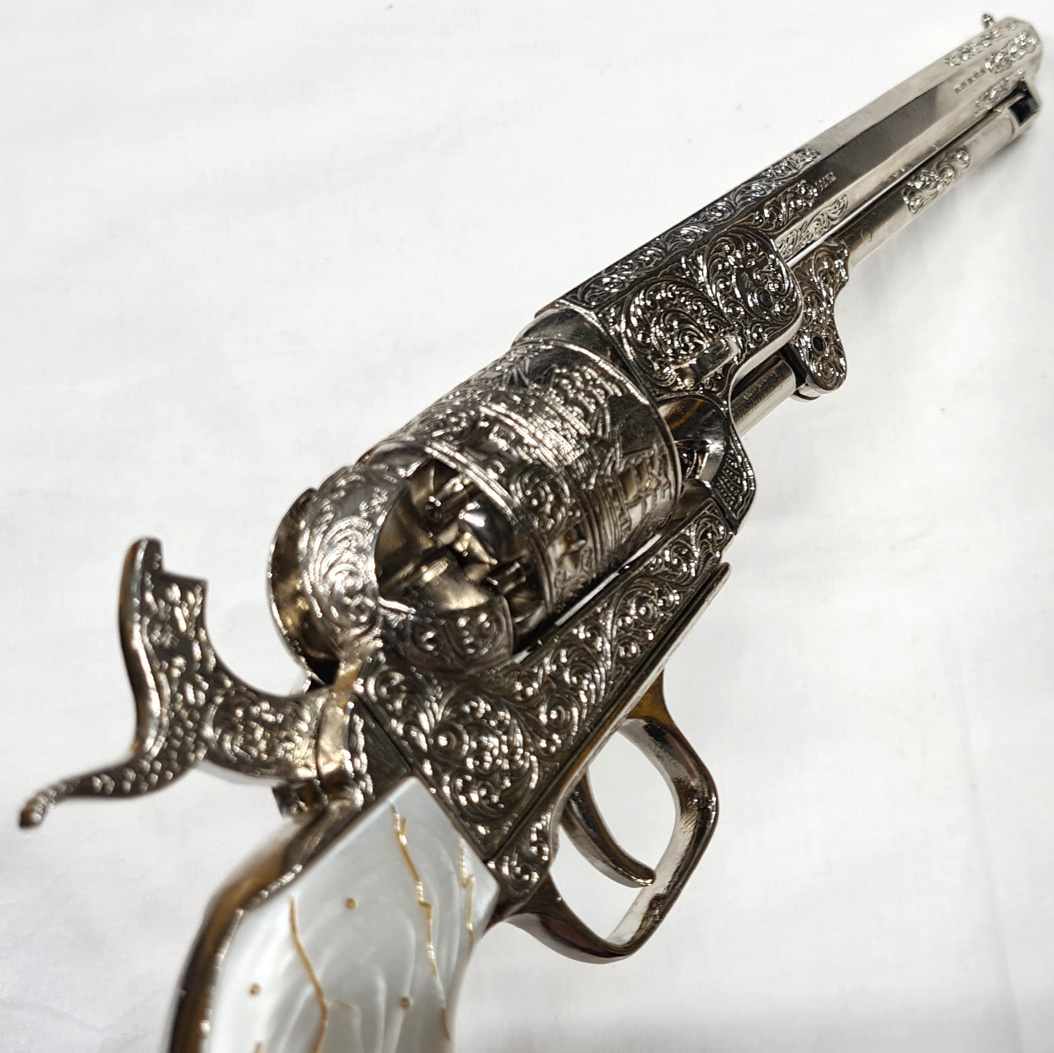 A superb Denix copy of the 1851 Navy colt with Naval battle scrollwork and faux pearl/bone white grips.