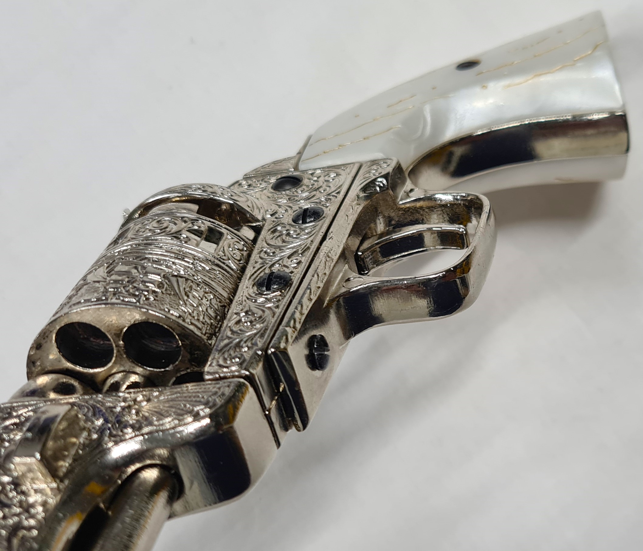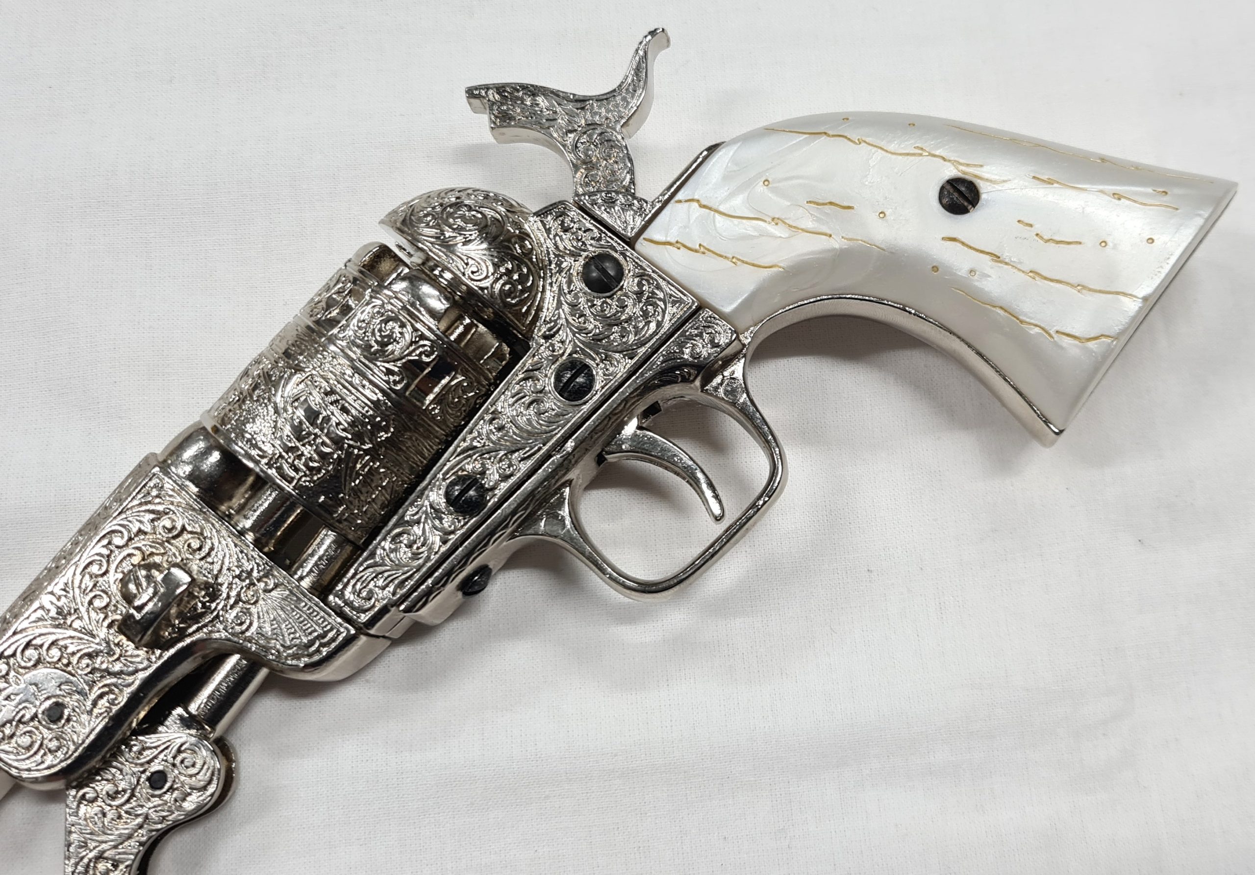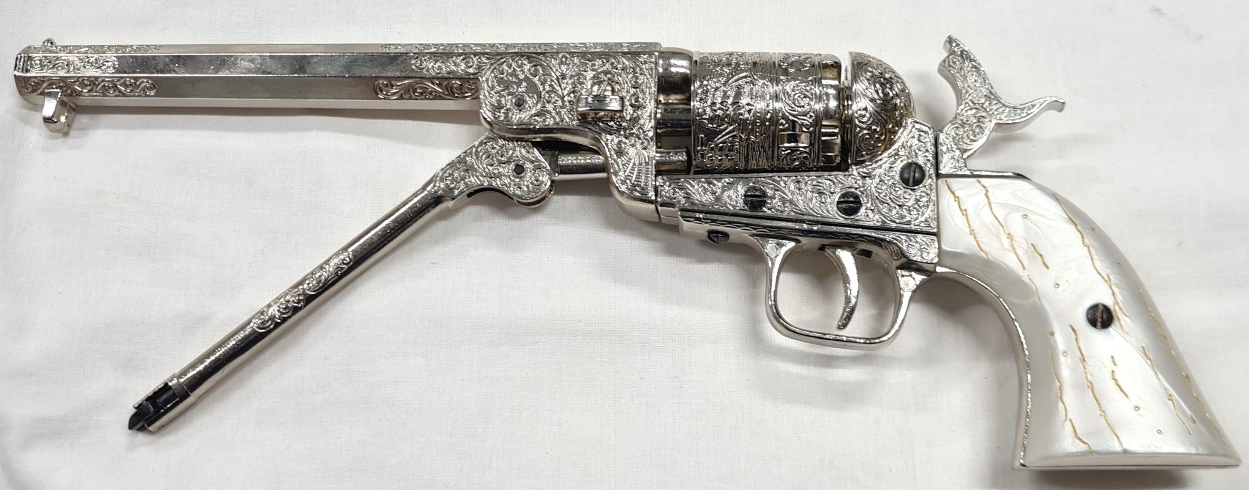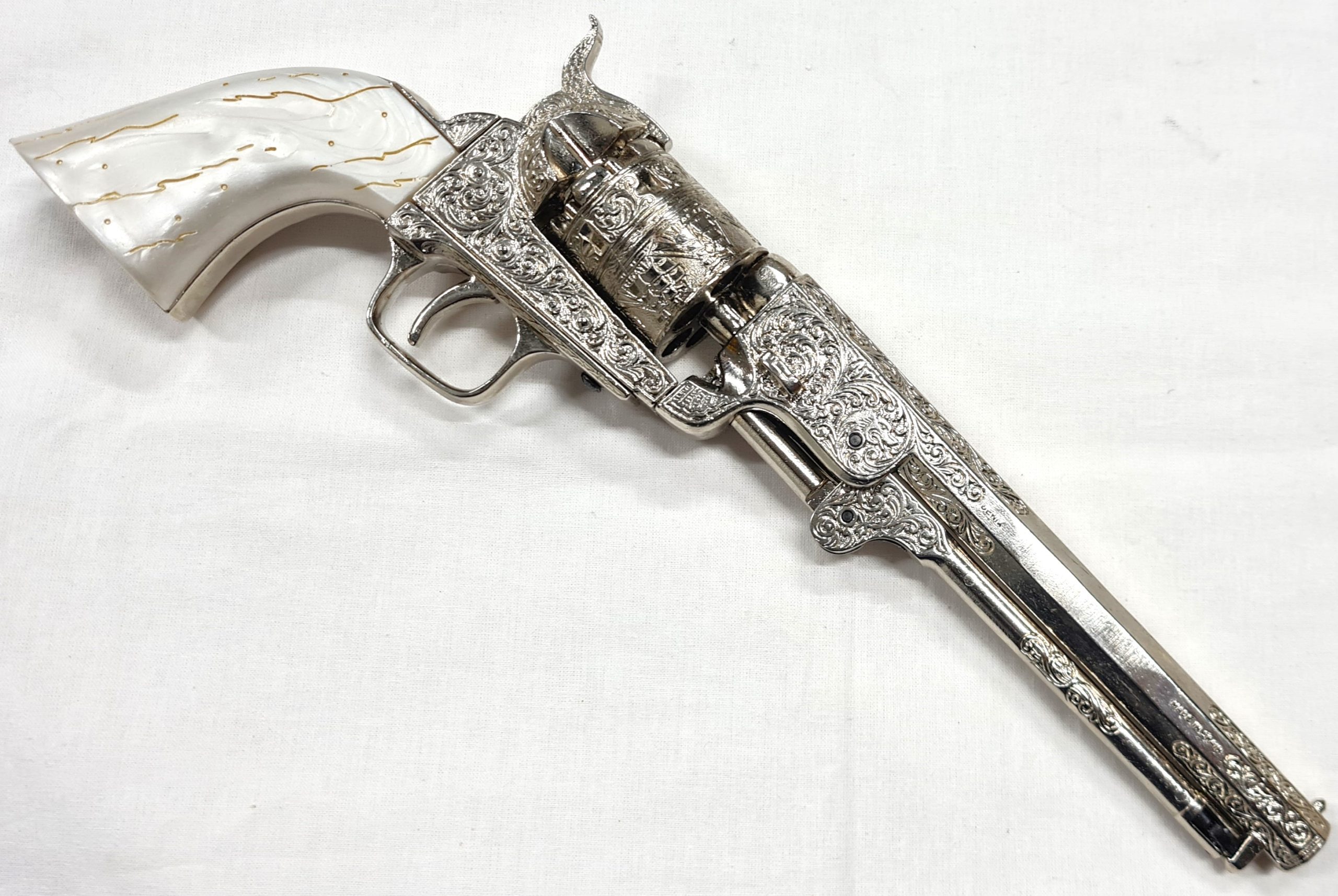 A superb Denix copy of the 1851 Navy colt with Naval battle scrollwork and faux pearl/bone white grips.