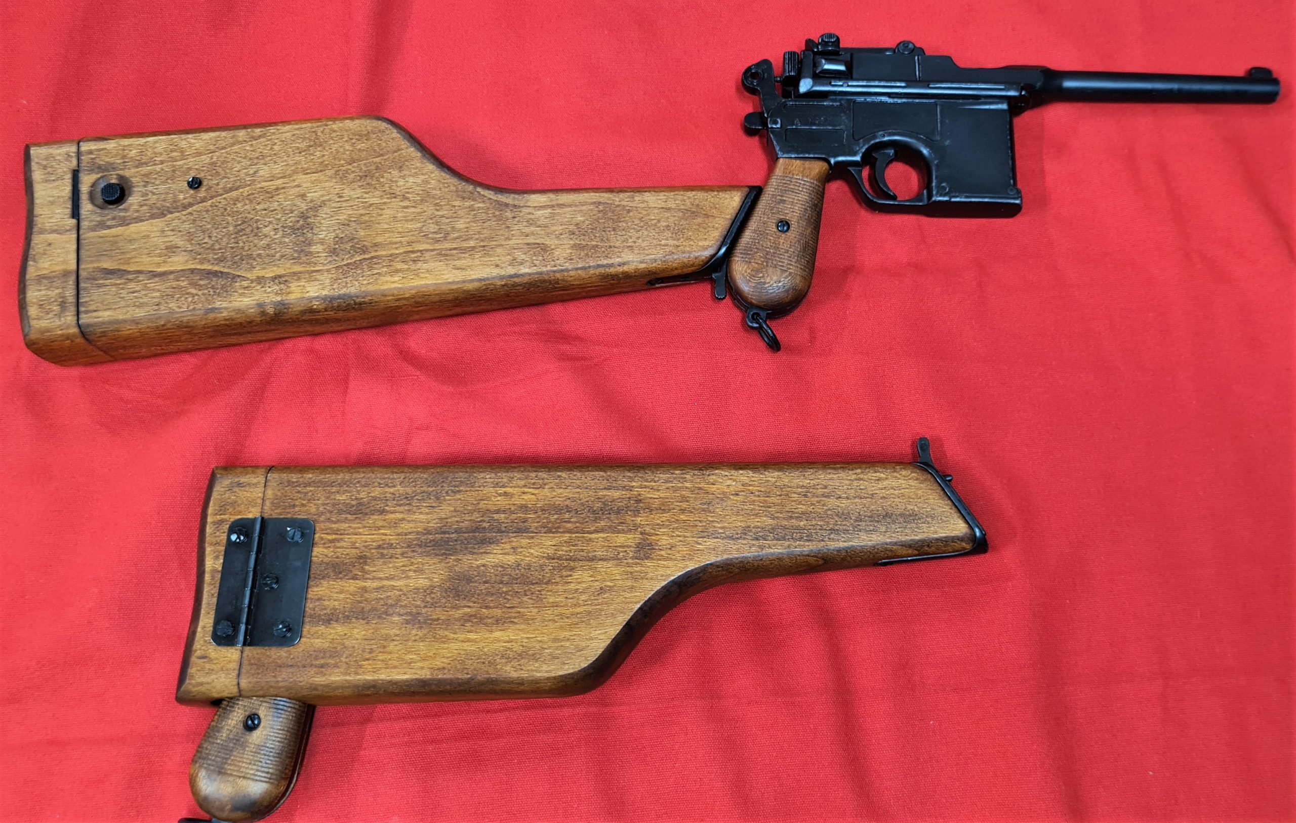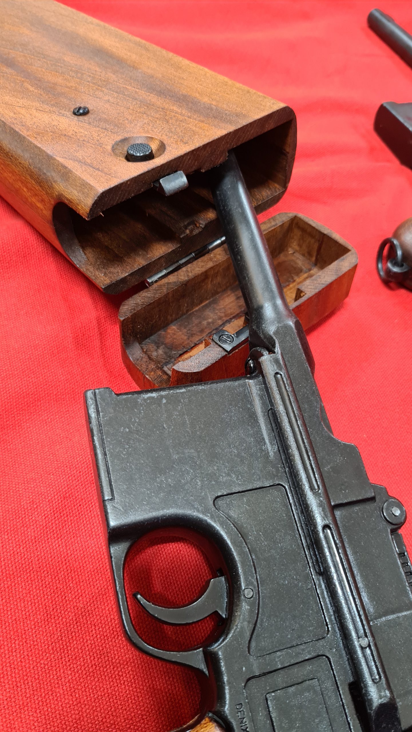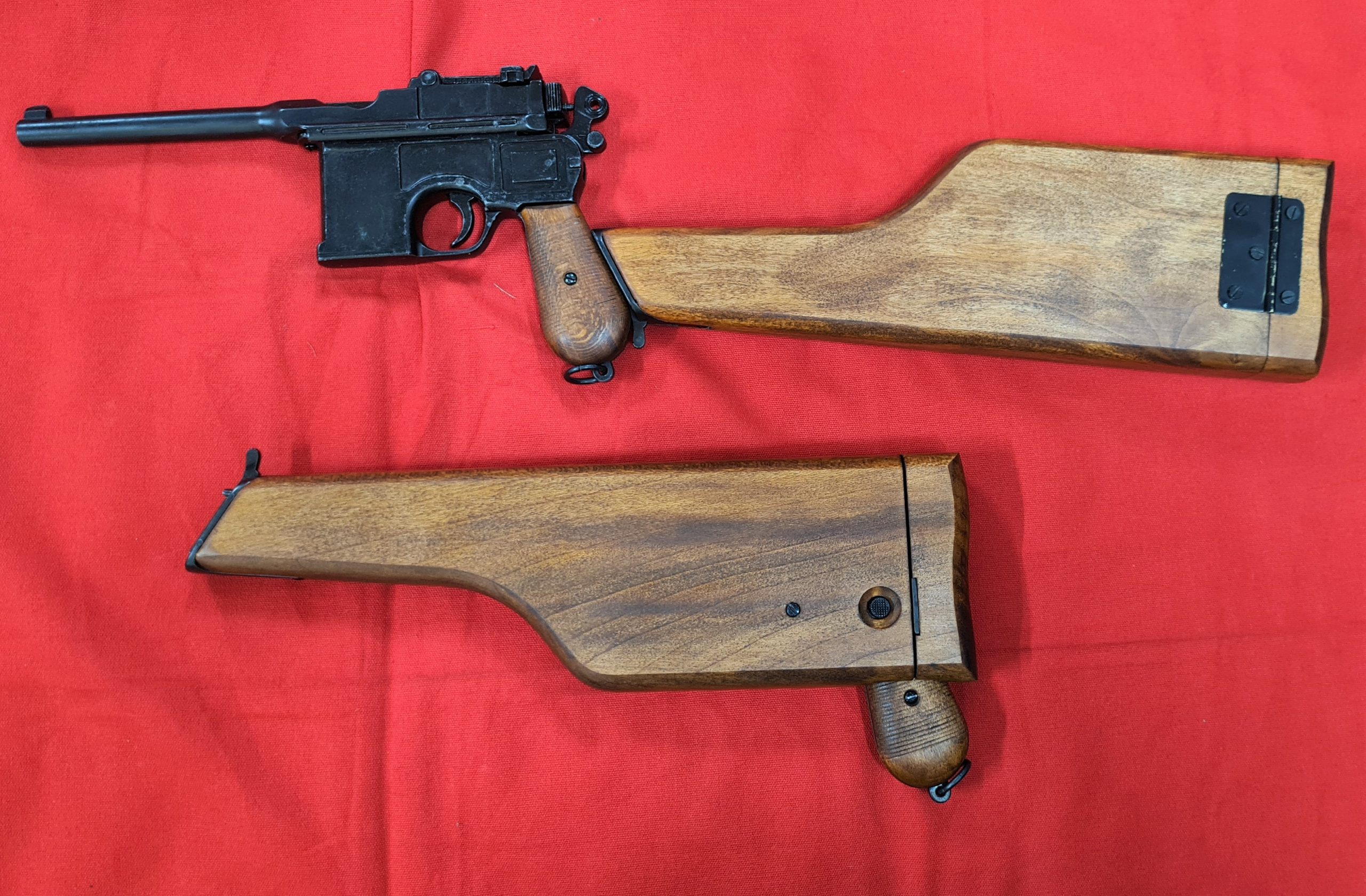 This broom handle Mauser realistic replica of the first successful automatic pistol, with this weapon being known by a variety of other names, including C96, M96, Bolo, P-7.63, Broom handle, Mauser Military Pistol, Large Mauser pistol, Pistole 7.63 and the Model 1930. This pistol was a favourite of Winston Churchill. While commonly carried by field troops in WWII, the Mauser has since been made famous in countless WWII movies. This Mauser replica pistol features a real wooden stock holster that houses the pistol then convert into a buttstock slide locking onto the pistol grip. The hammer cocks back, trigger function works rear sight lifts, the front sight is fixed and bolt slides back and forward.