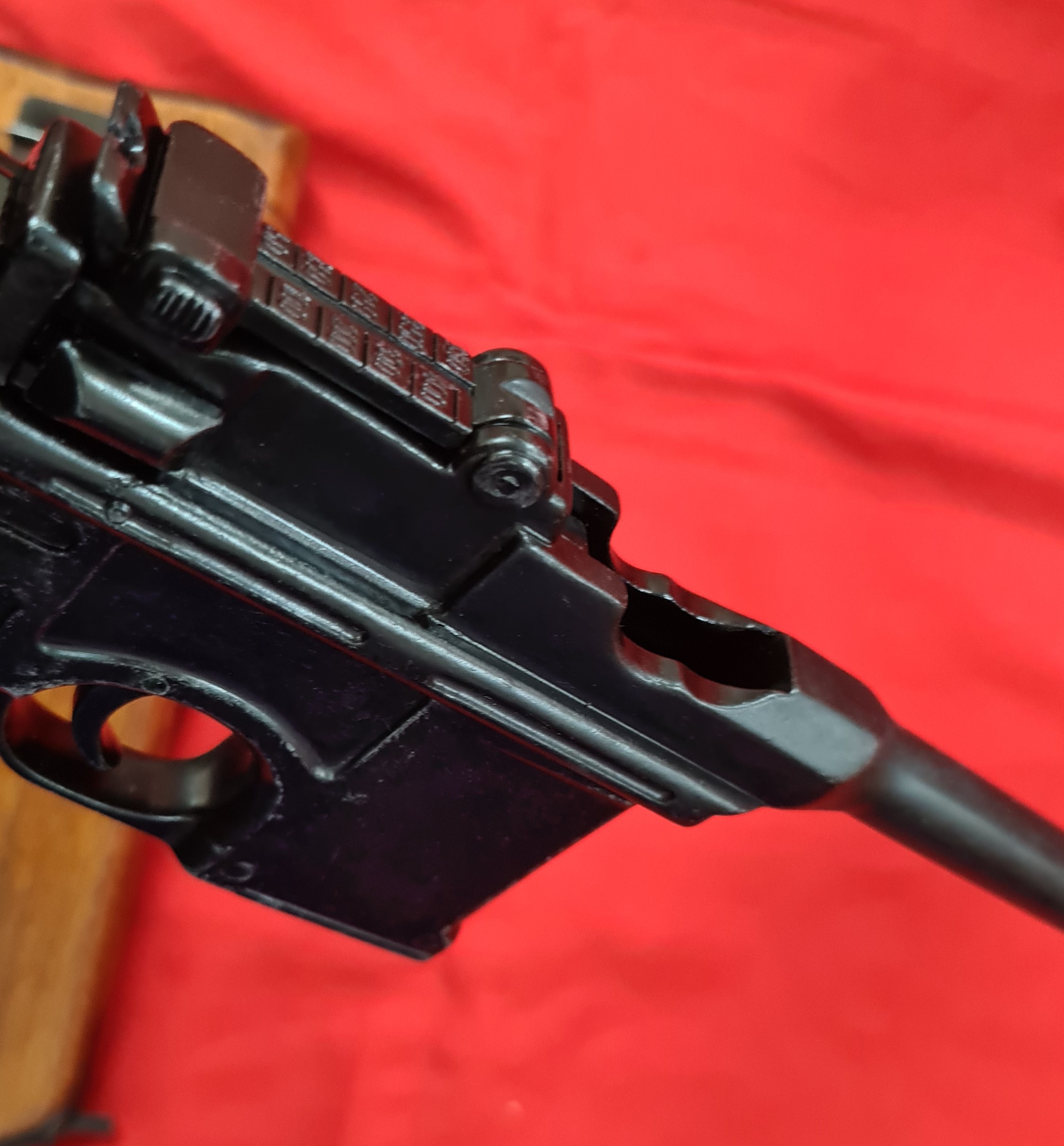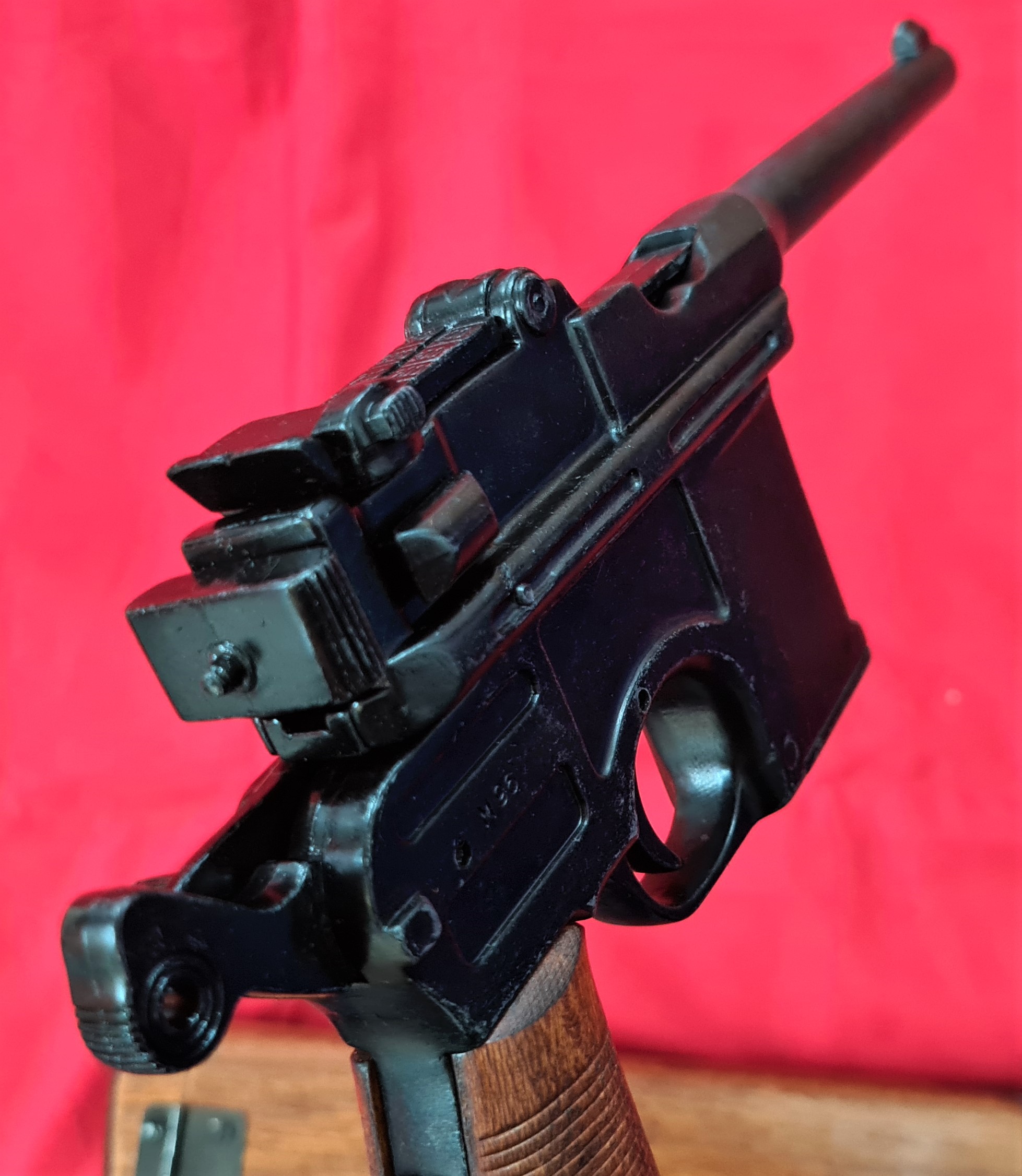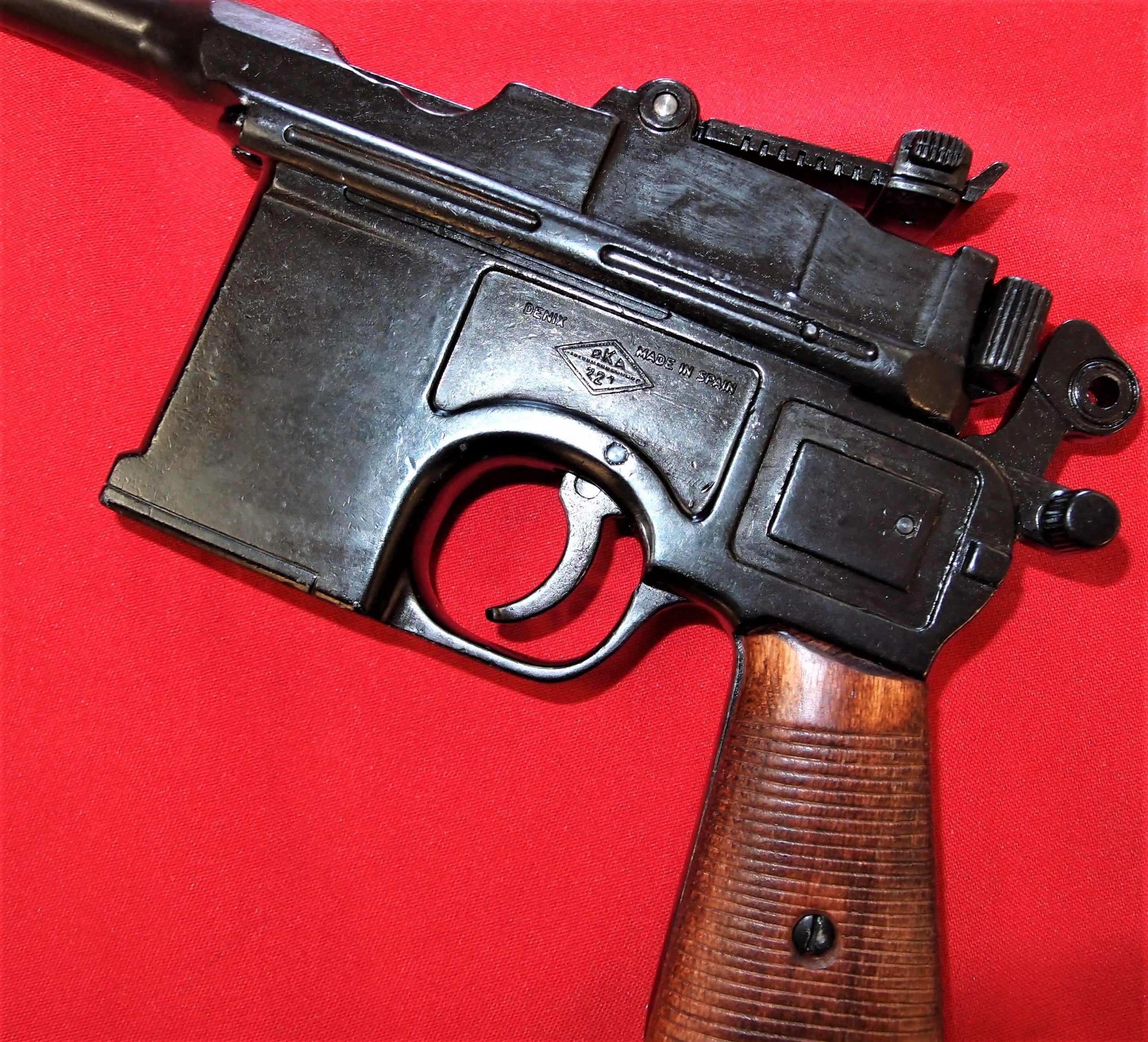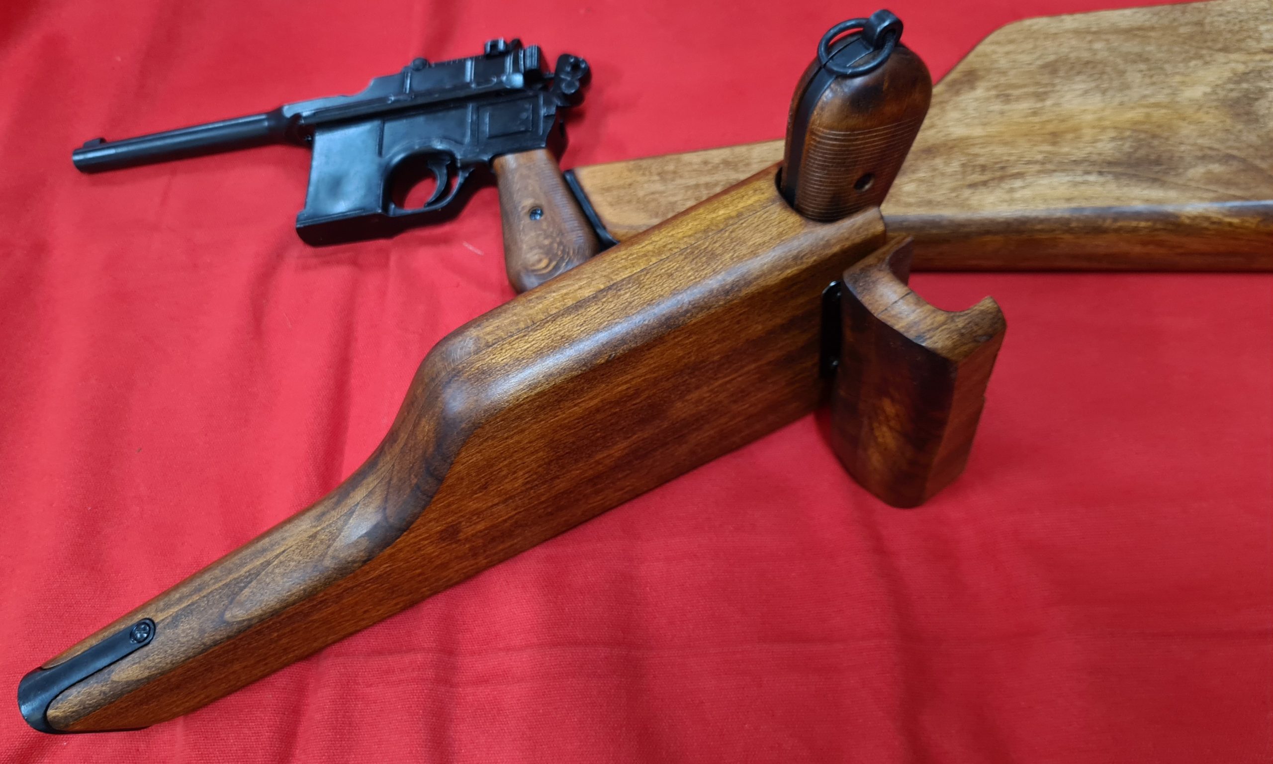This broom handle Mauser realistic replica of the first successful automatic pistol, with this weapon being known by a variety of other names, including C96, M96, Bolo, P-7.63, Broom handle, Mauser Military Pistol, Large Mauser pistol, Pistole 7.63 and the Model 1930. This pistol was a favourite of Winston Churchill. While commonly carried by field troops in WWII, the Mauser has since been made famous in countless WWII movies. This Mauser replica pistol features a real wooden stock holster that houses the pistol then convert into a buttstock slide locking onto the pistol grip. The hammer cocks back, trigger function works rear sight lifts, the front sight is fixed and bolt slides back and forward.