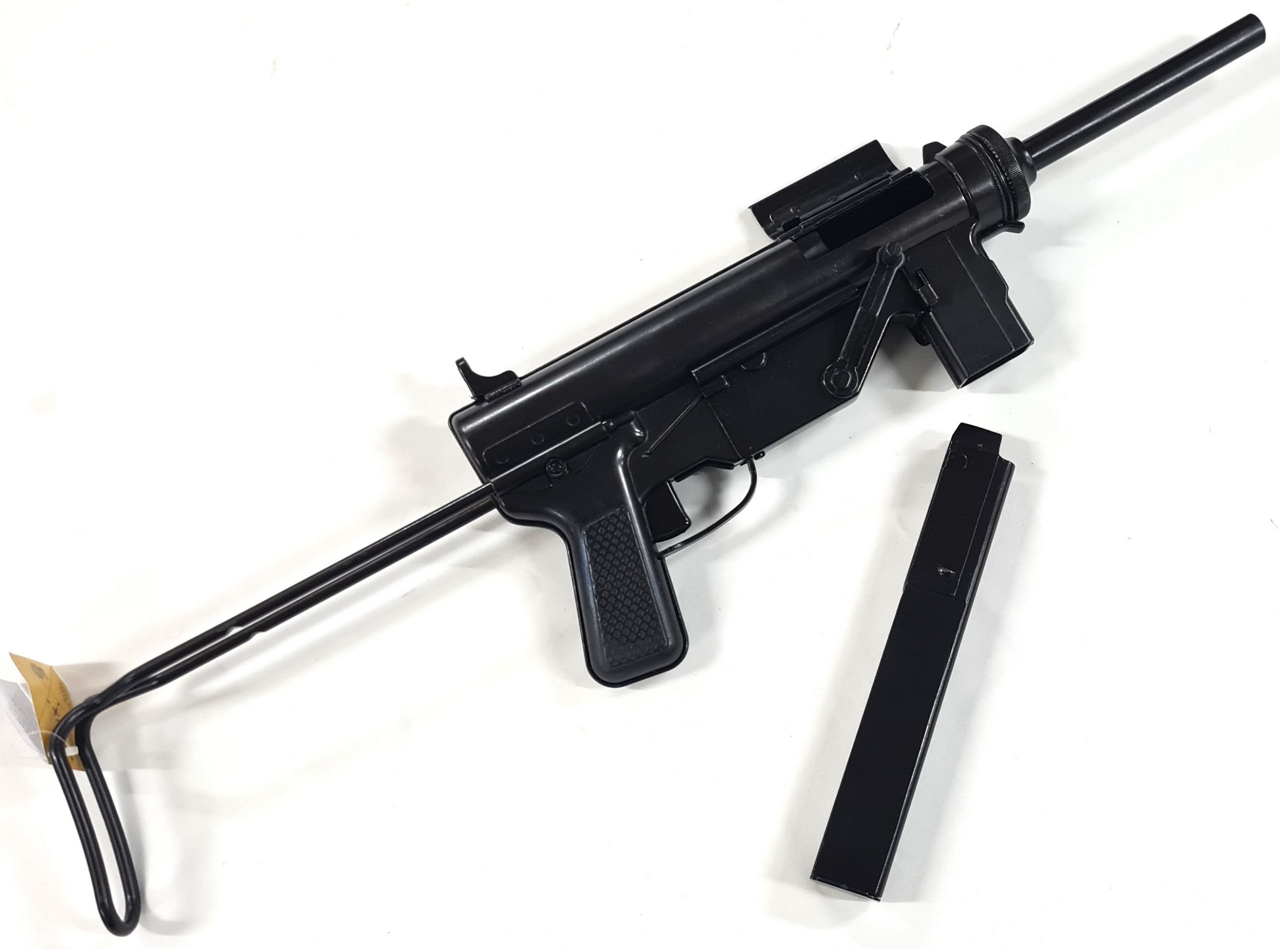 Features a cast black metal body, with simulated mechanism for loading and firing, moveable safe cover, removable magazine, quarter rotating cocking handle & firing trigger. Adjustable push button ,2 position, metal buttstock.
