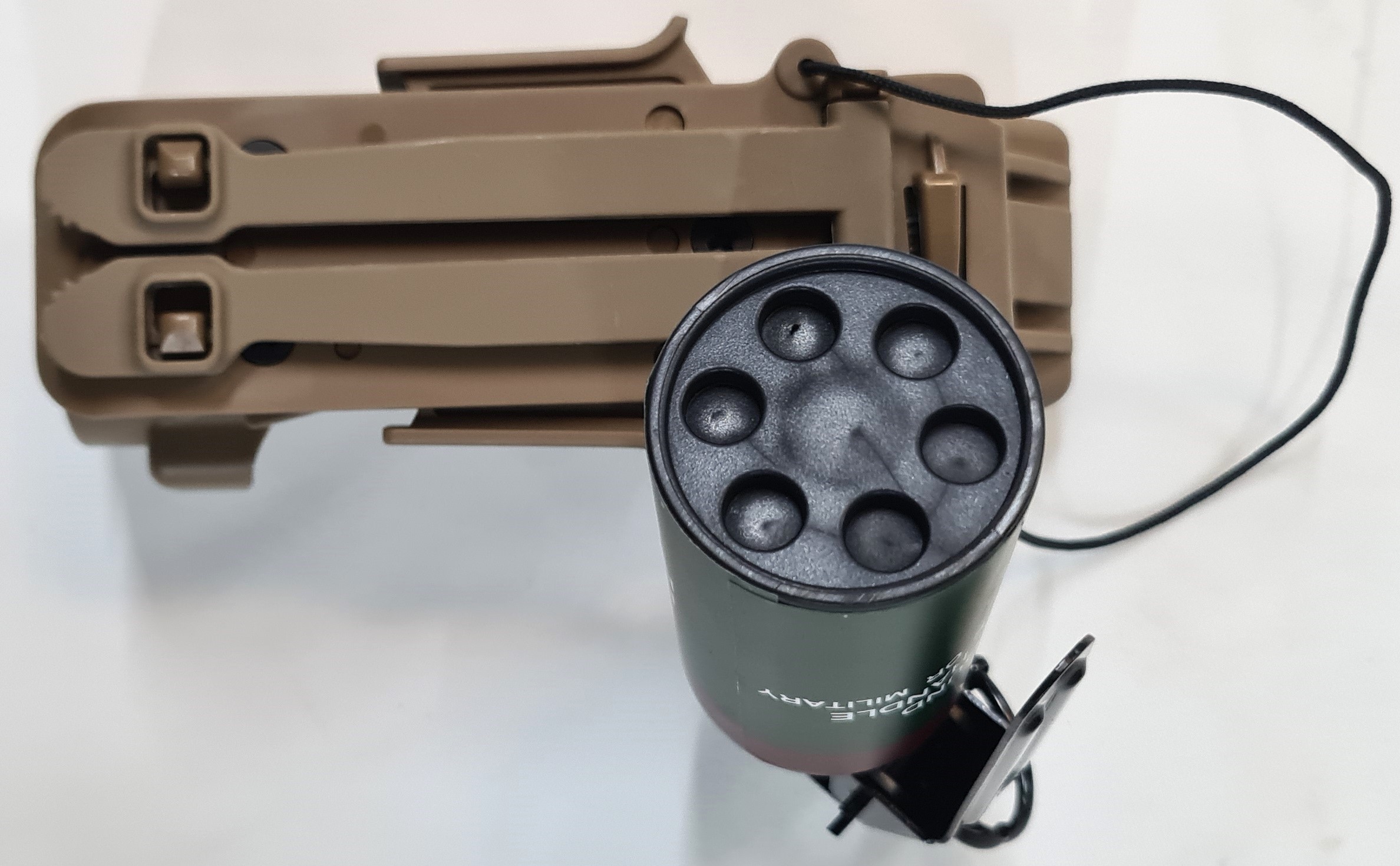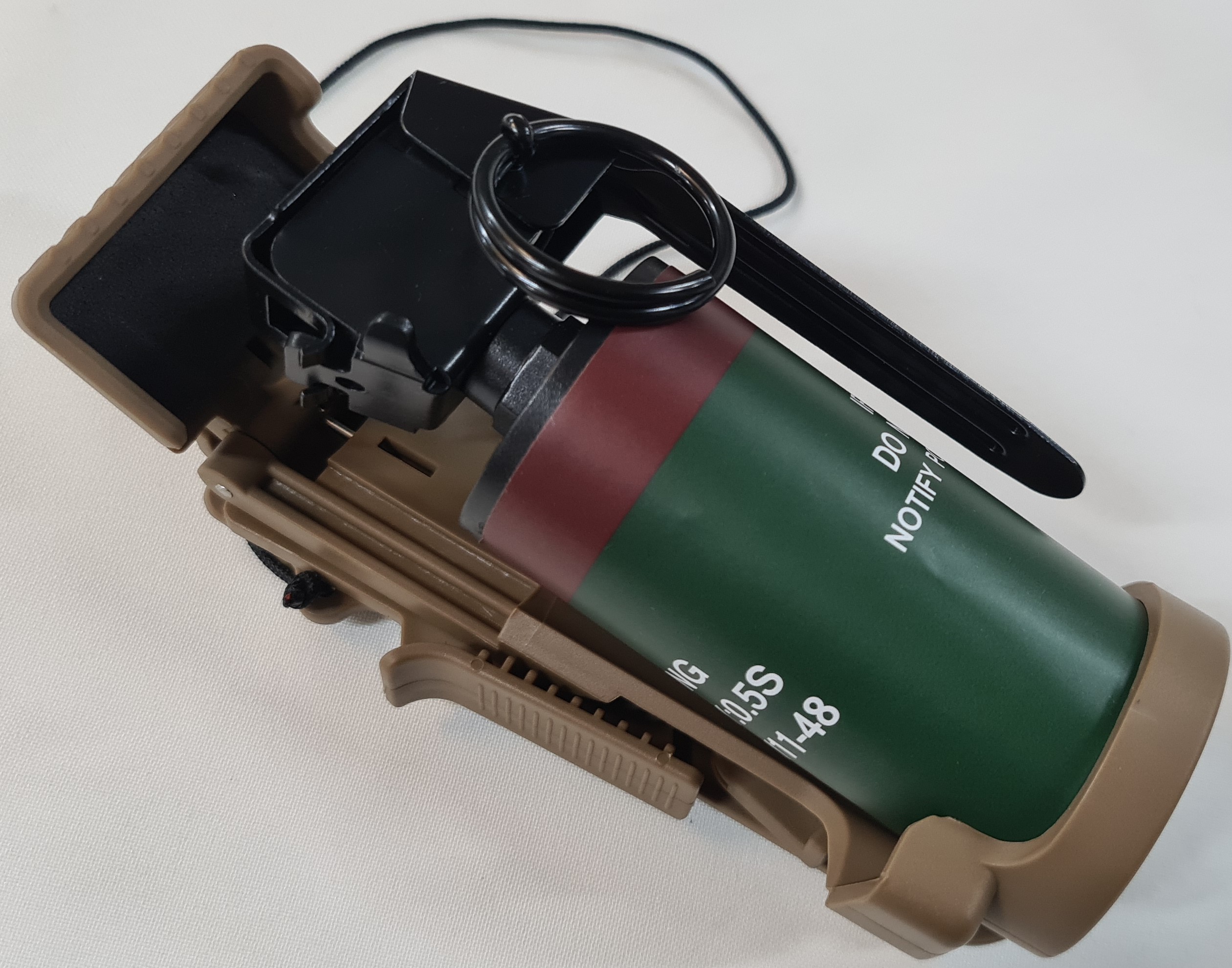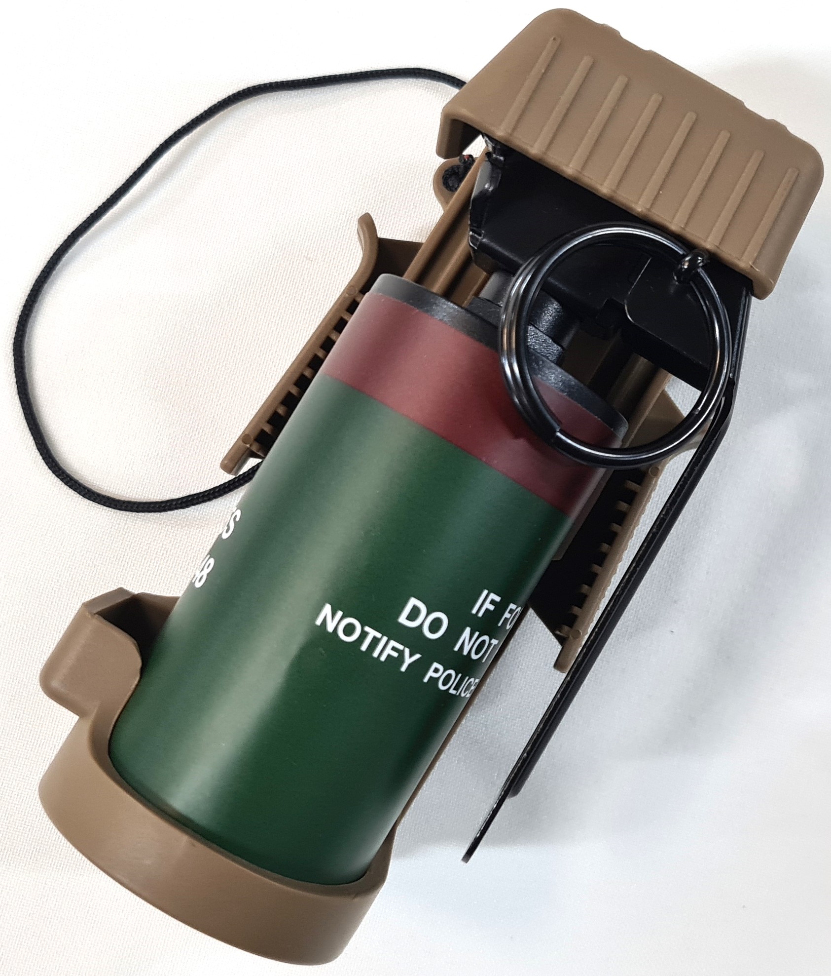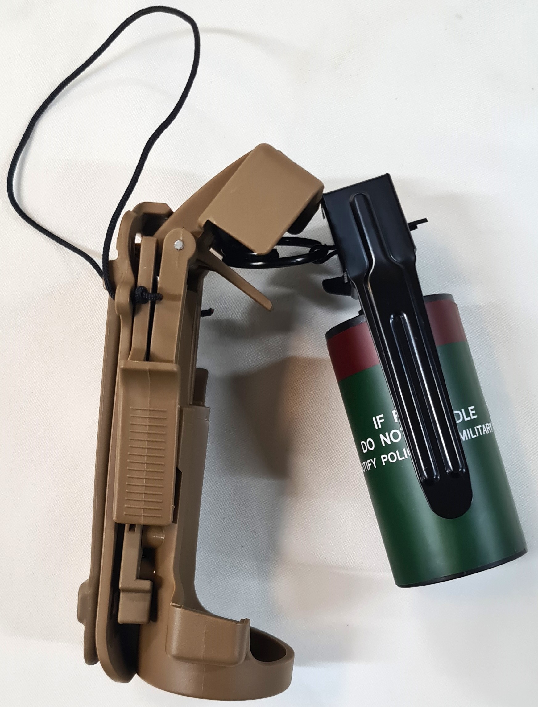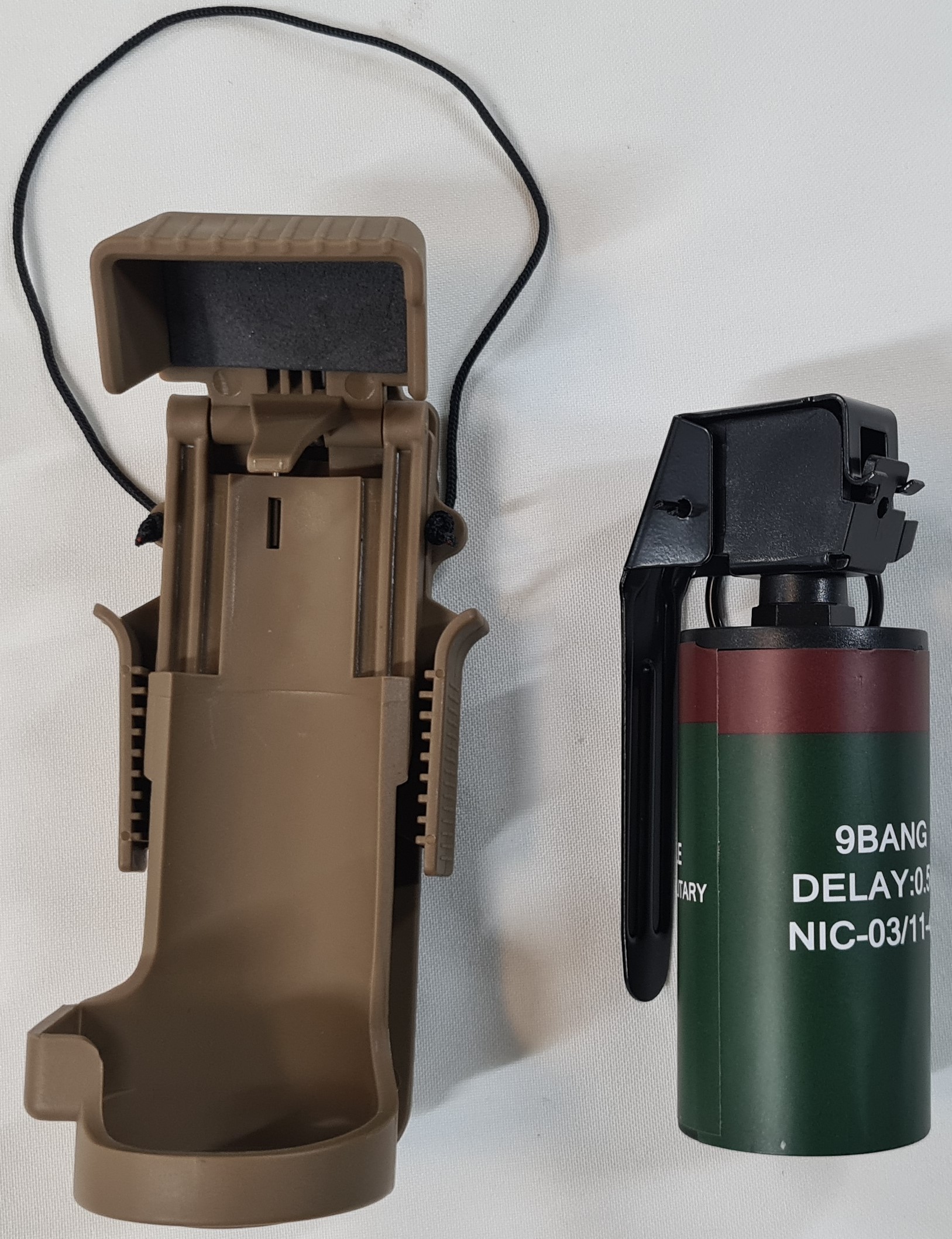 Offered is a replica '9 Flash Bang', United States / Australian grenade in quick release tan cup holder