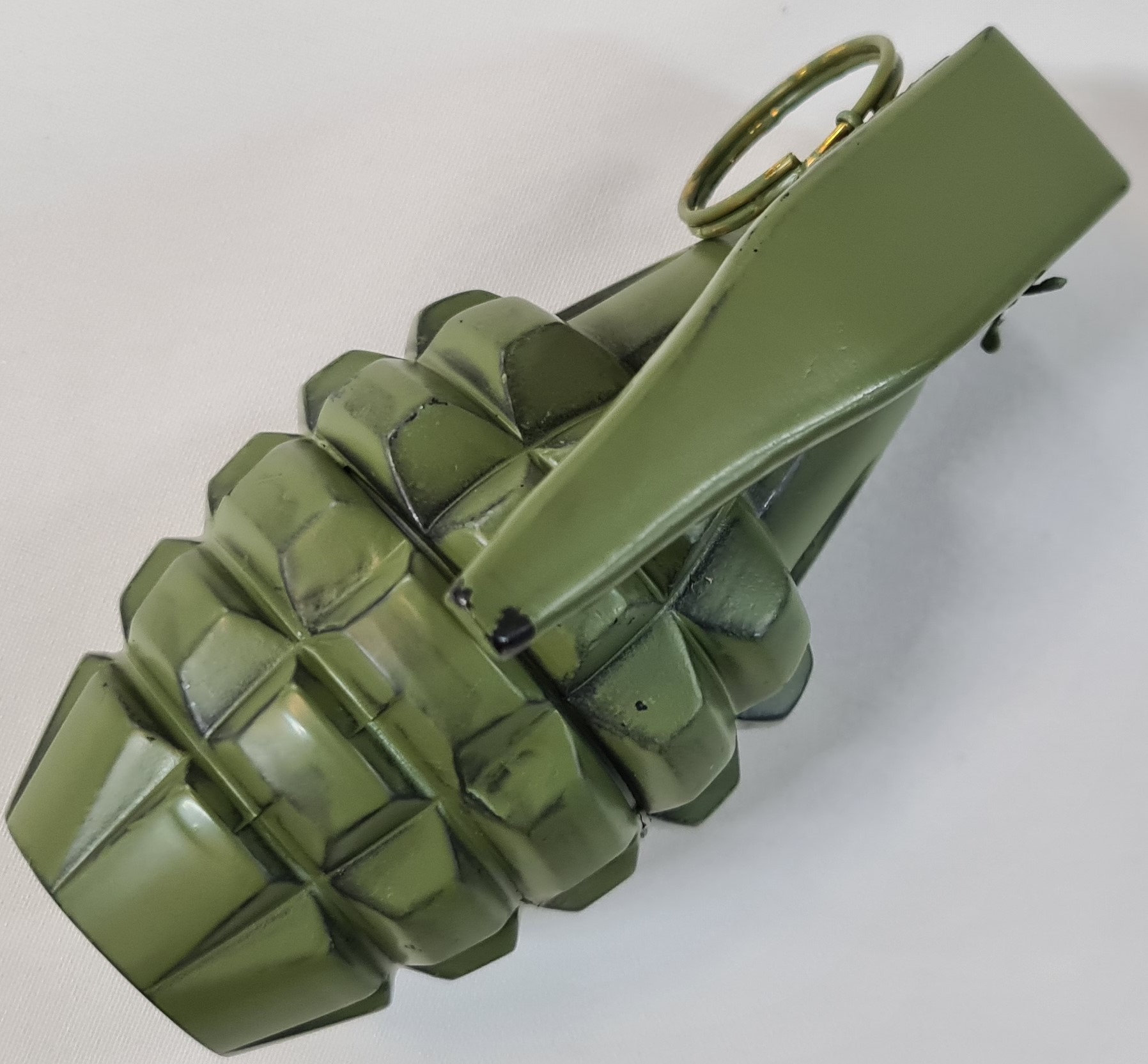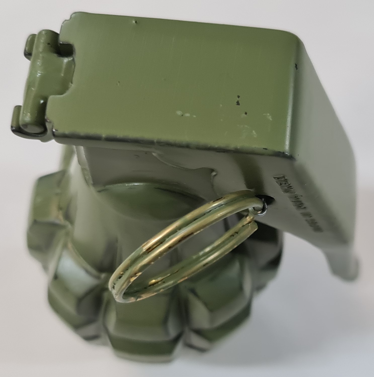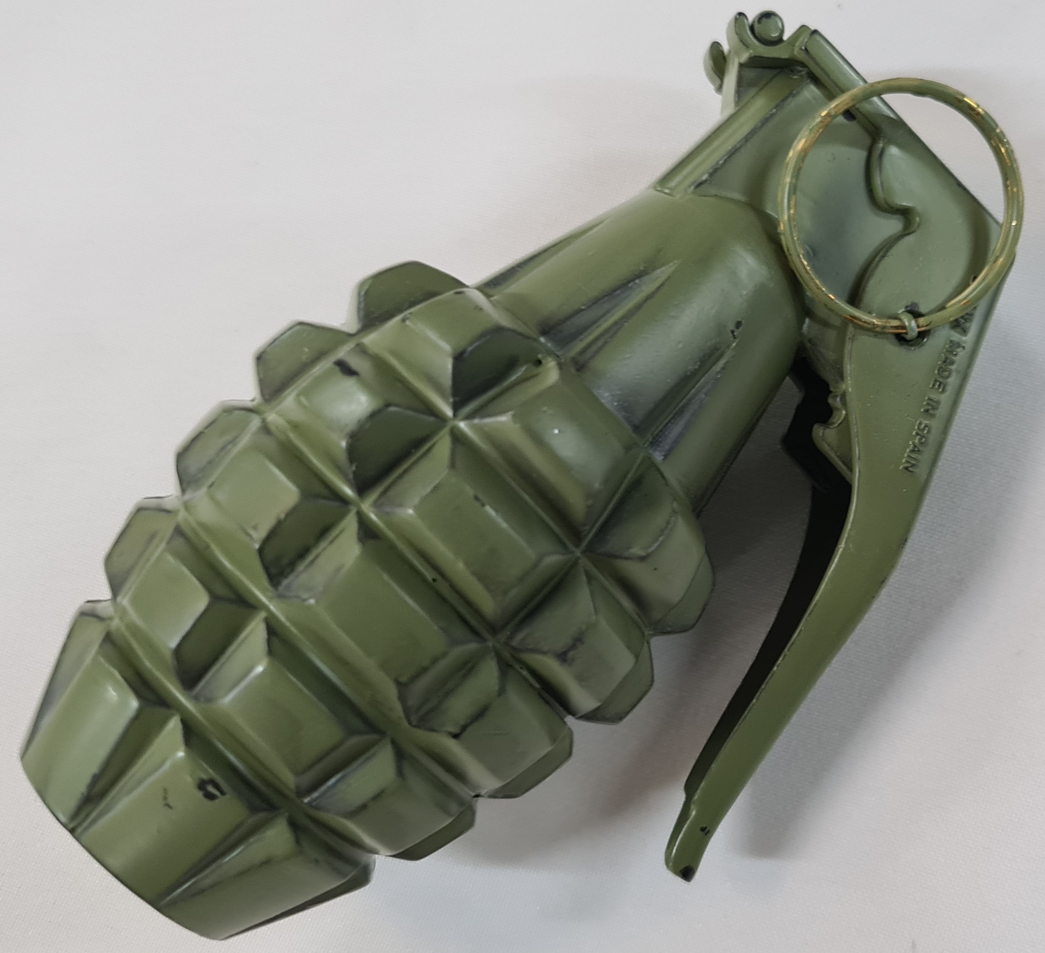 Full cast, 1:1 scale metal body & fuse head, with ribbed outer grooved surface of 40 grip knobs, with removeable safety lever & safety pin. These are all alloy metal parts.
