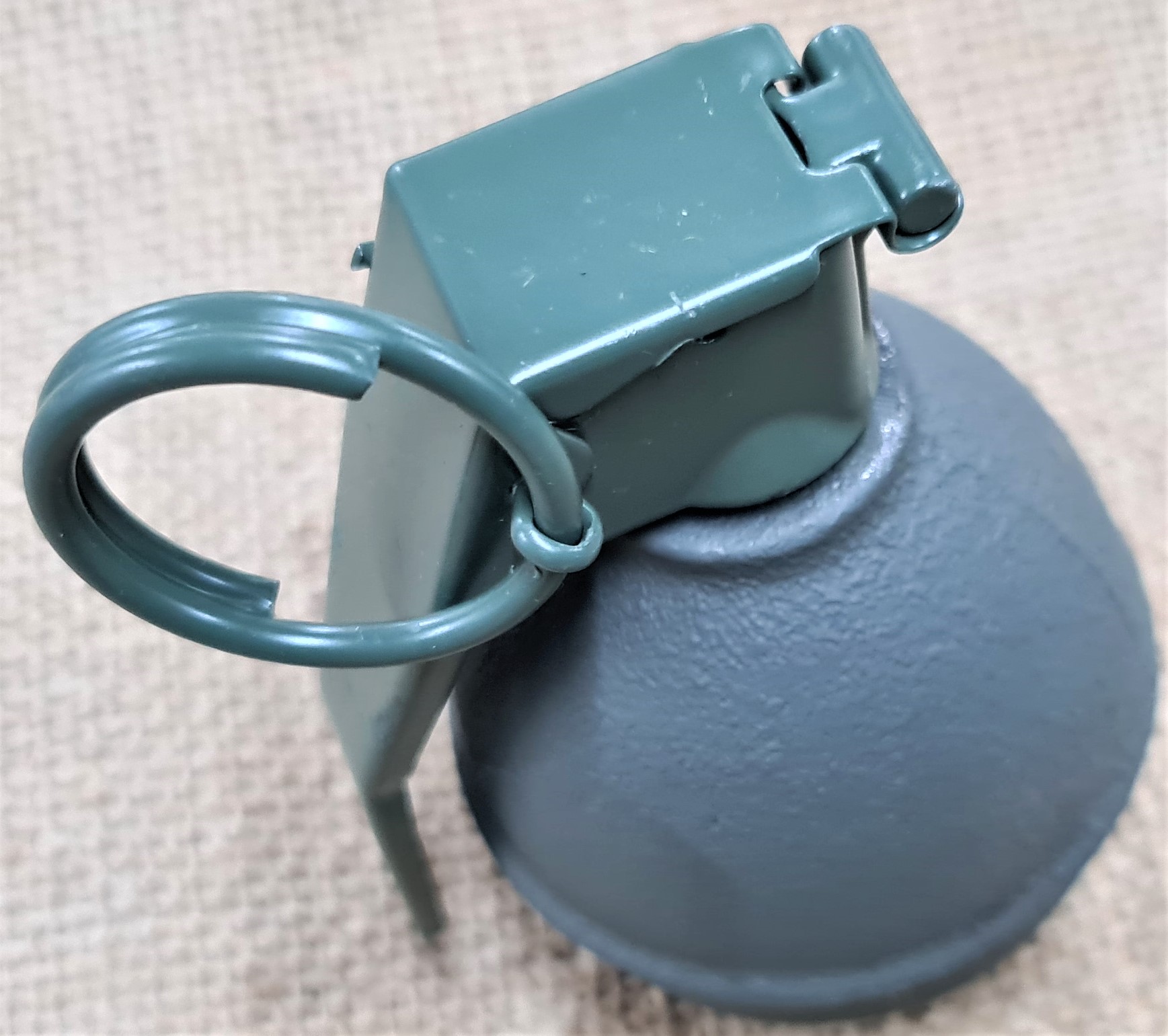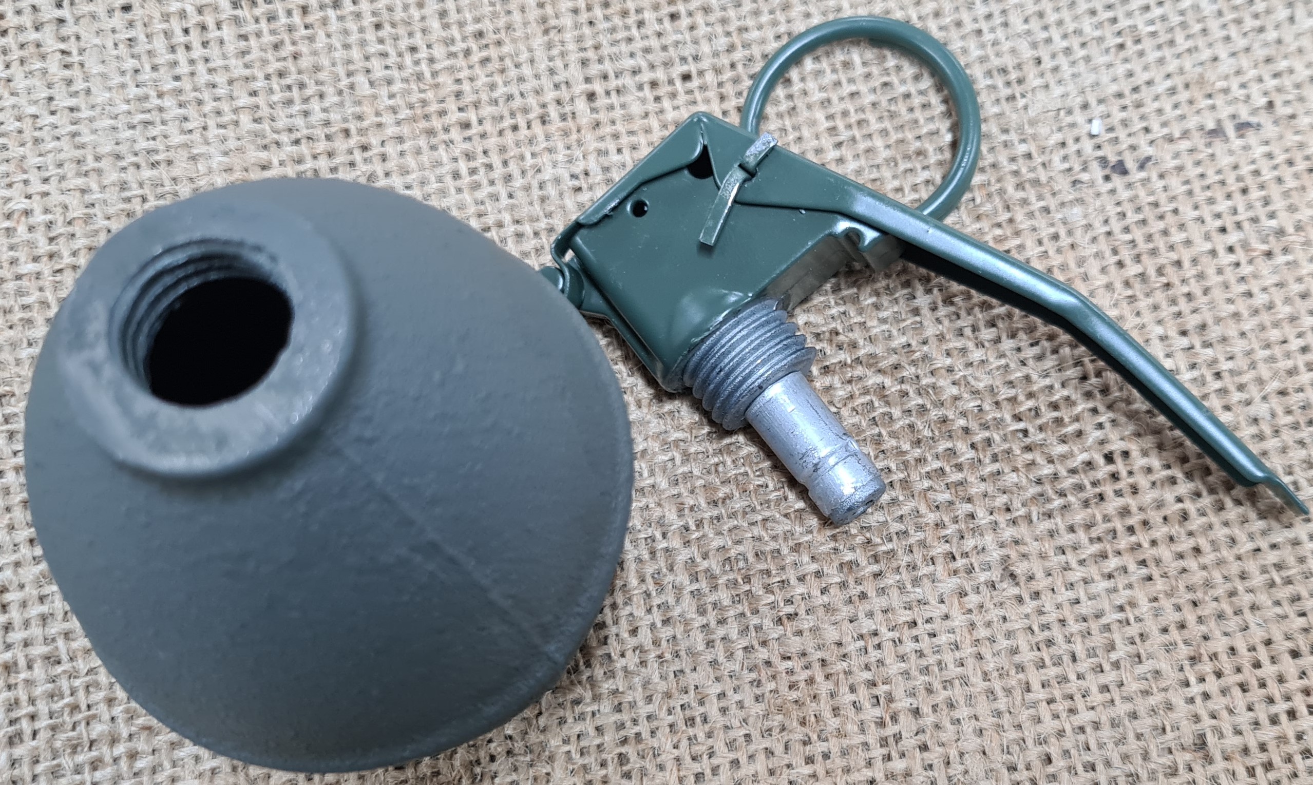 Full cast, 1:1 scale metal body & fuse head, with ribbed outer rim, with removeable safety lever & safety pin. These are all alloy metal parts..