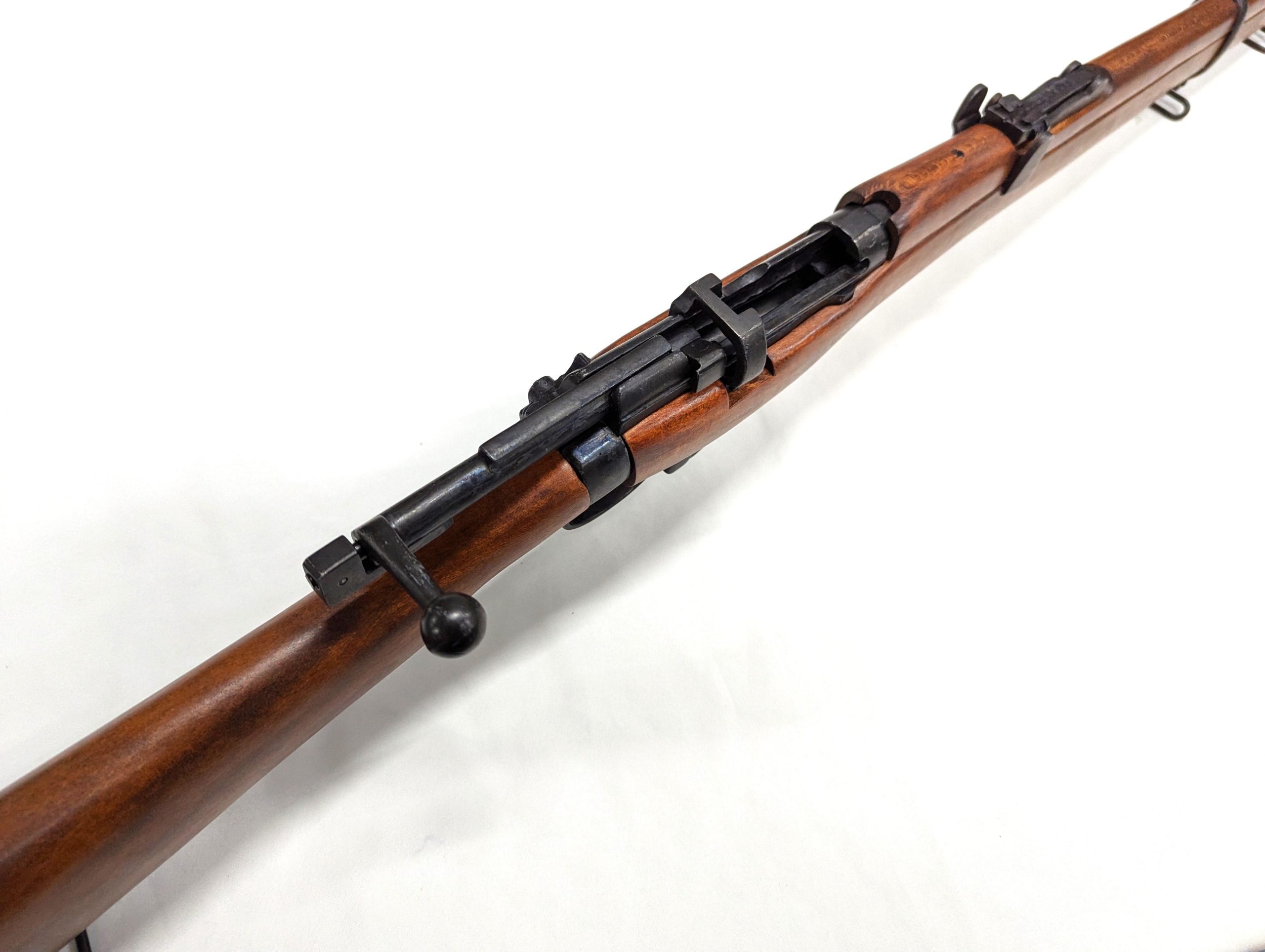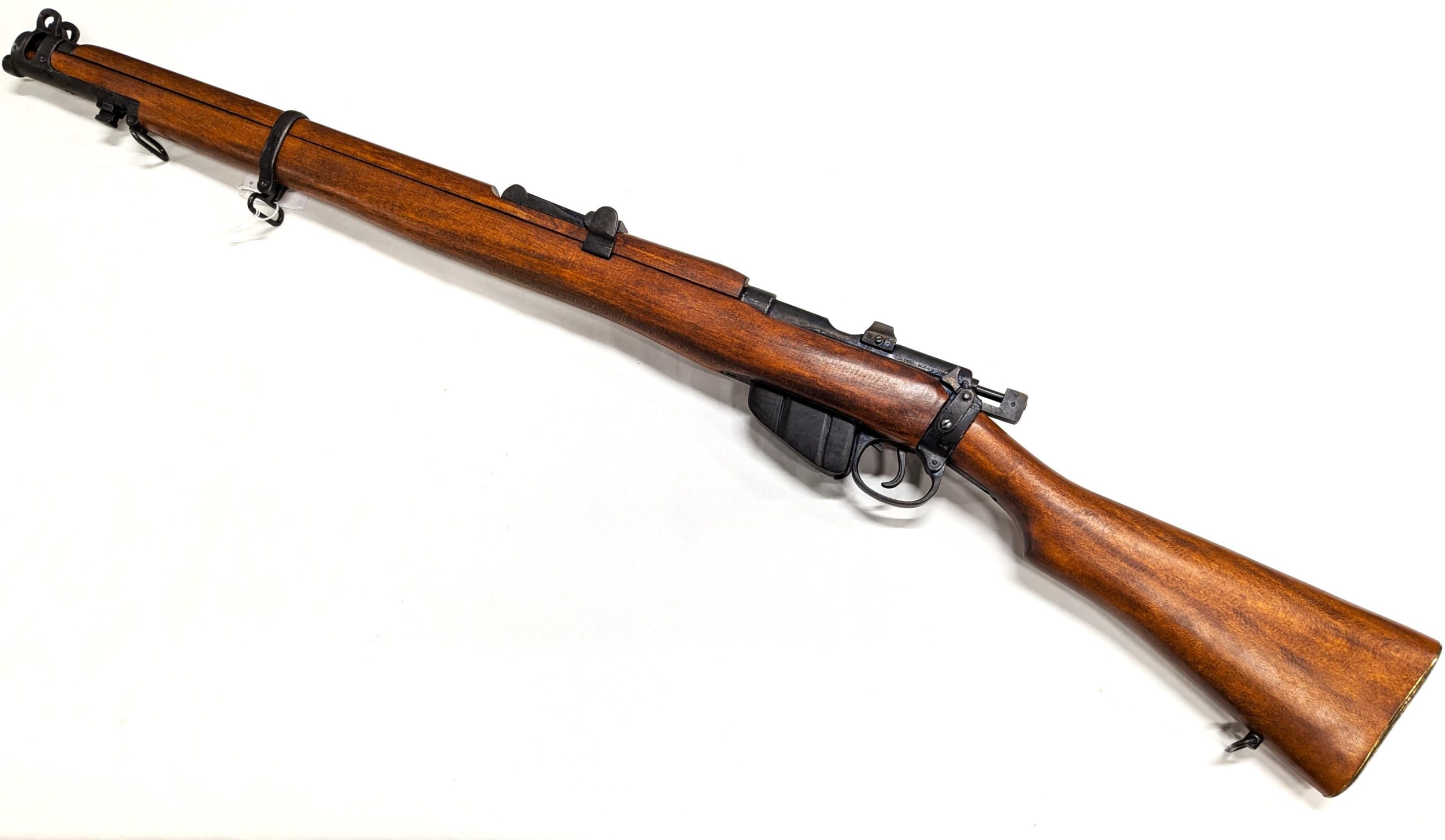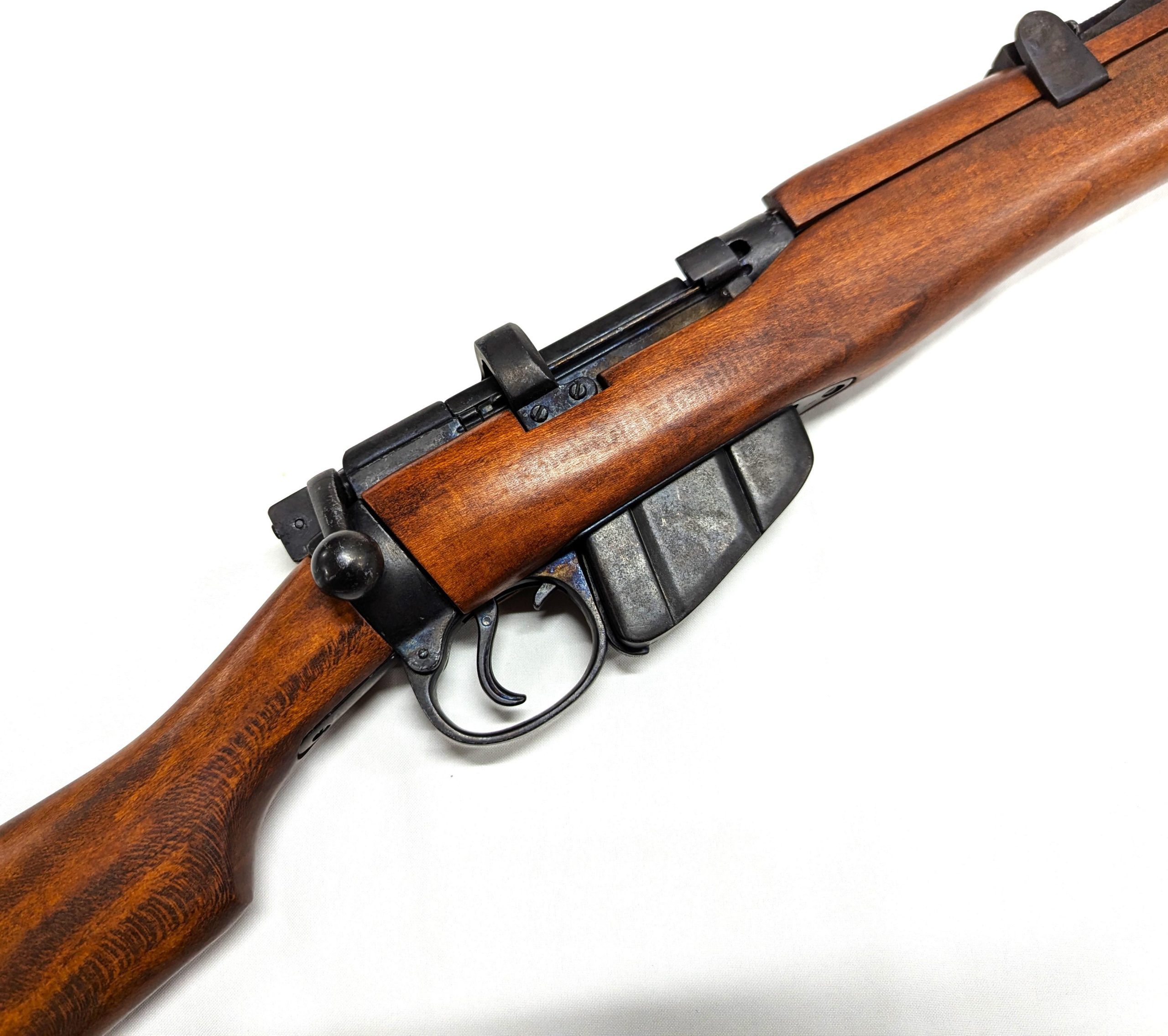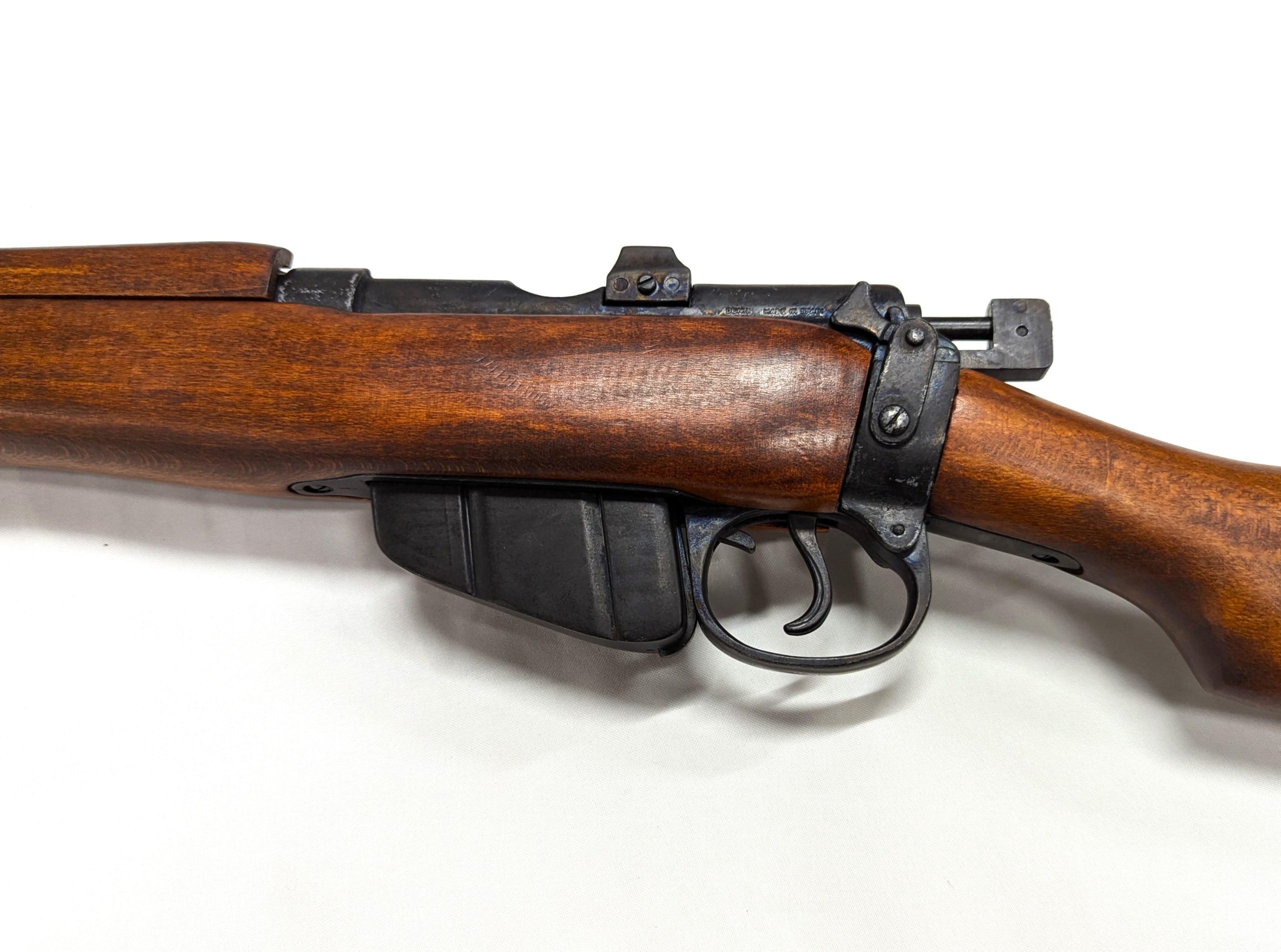 The Lee-Enfield was standard army service rifle for the first half of the 20th century, it was British Army's standard bolt-action, magazine-fed, repeating rifle from 1895 until 1956 and was adopted by Britain's colonies and Commonwealth allies. In 1904 a shorter and lighter version of the original MLE was introduced, the famous Rifle, Short, Magazine, Lee-Enfield, or SMLE. Total production of all Lee-Enfields is estimated at over 17 million rifles, making it the one of the most numerous military bolt-action rifles ever produced. The non-firing imitation with its eye catching authentic details is a must have for all the collectors.