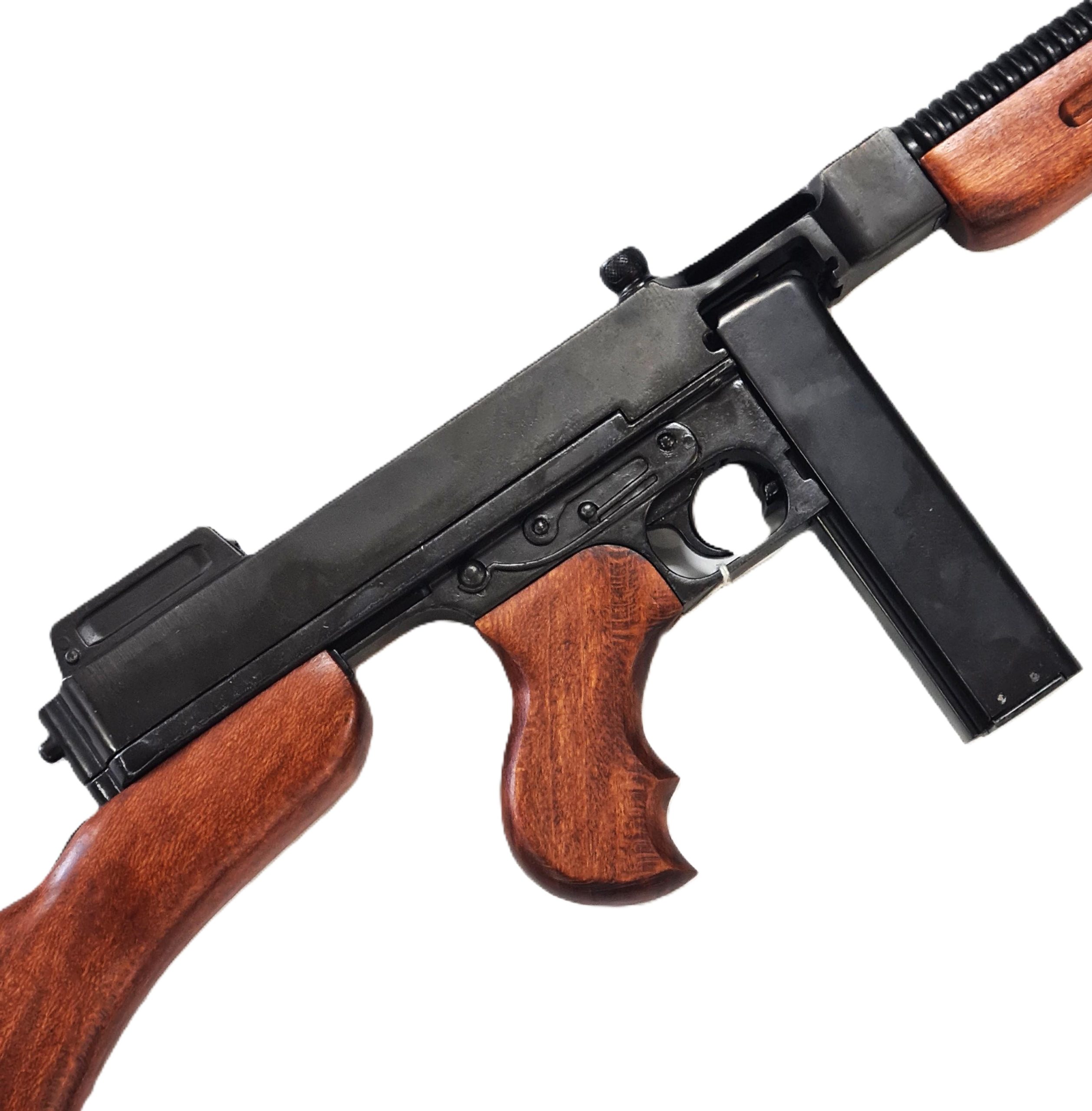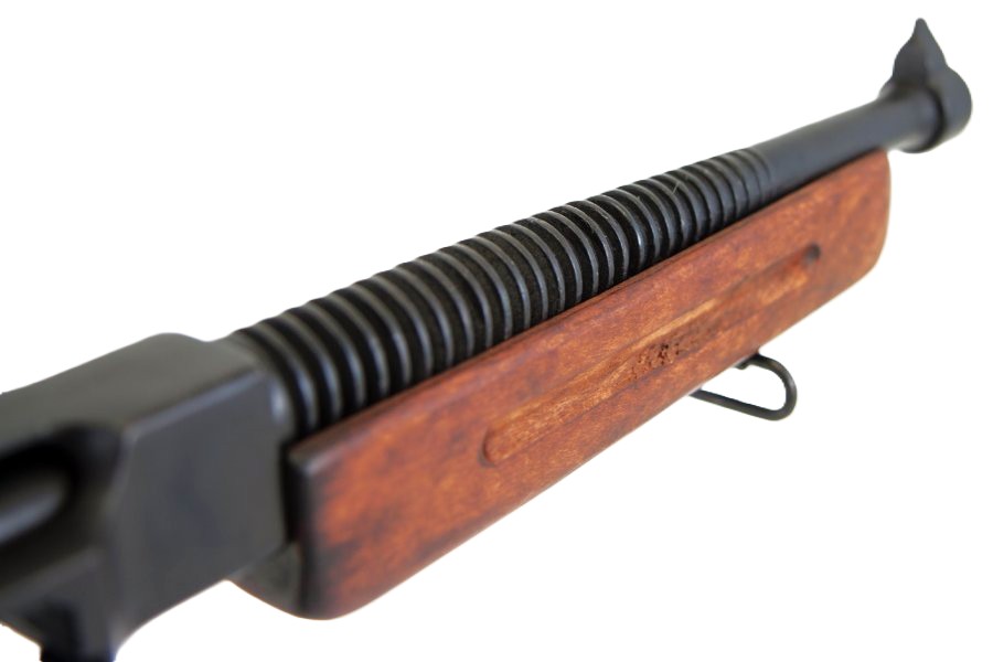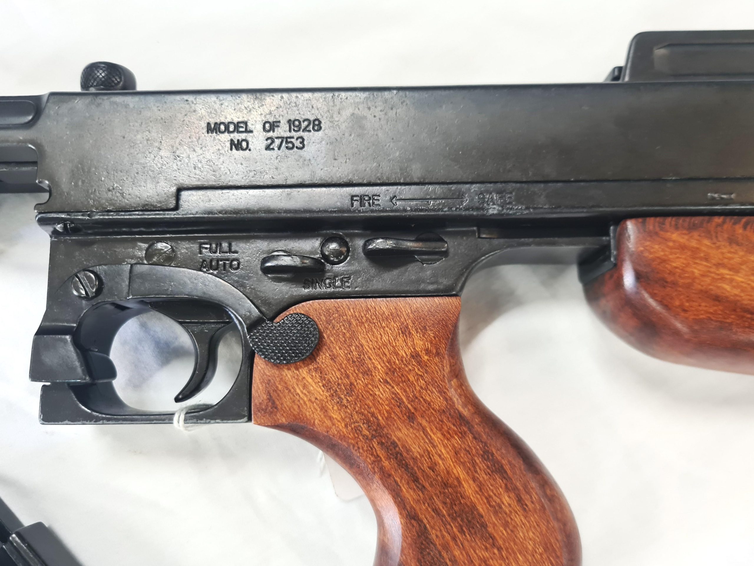 This is perhaps the most recognizable firearm of World War II, made famous by the Airborne Troops of the 101st and 82nd Airborne Divisions. This classic replica has been out of production for several years and is now returning for a limited run. This military model differs from the original commercial model in its 20 round magazine and its horizontal foregrip. Though heavy by today's standards, the weight helped control the .45 calibre bursts when operated on full-automatic. The bolt cocks and fires from an open position also the magazine can be released and removed. A lovely and well-made piece. Dimensions: 82cm Weight: 3.745kg