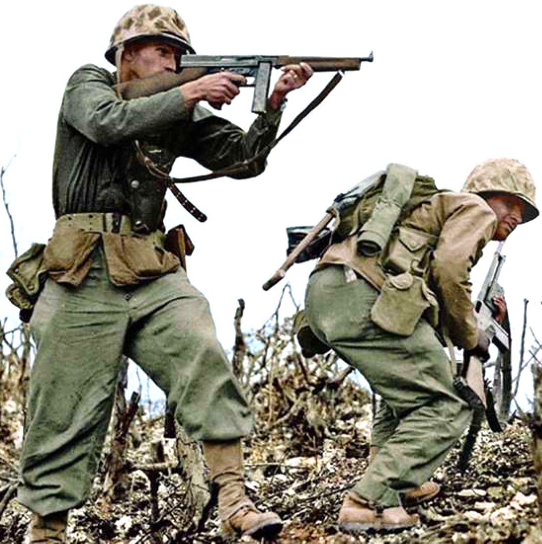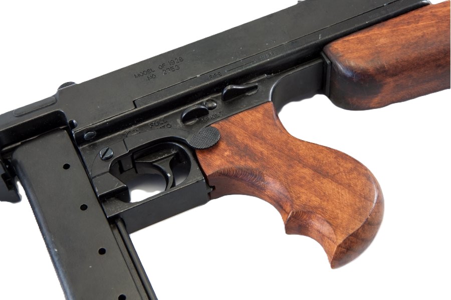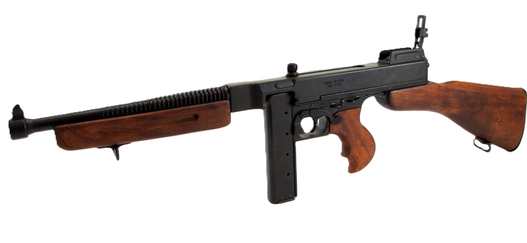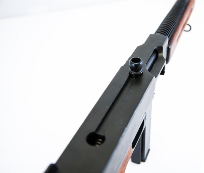 This is perhaps the most recognizable firearm of World War II, made famous by the Airborne Troops of the 101st and 82nd Airborne Divisions. This classic replica has been out of production for several years and is now returning for a limited run. This military model differs from the original commercial model in its 20 round magazine and its horizontal foregrip. Though heavy by today's standards, the weight helped control the .45 calibre bursts when operated on full-automatic. The bolt cocks and fires from an open position also the magazine can be released and removed. A lovely and well-made piece. Dimensions: 82cm Weight: 3.745kg