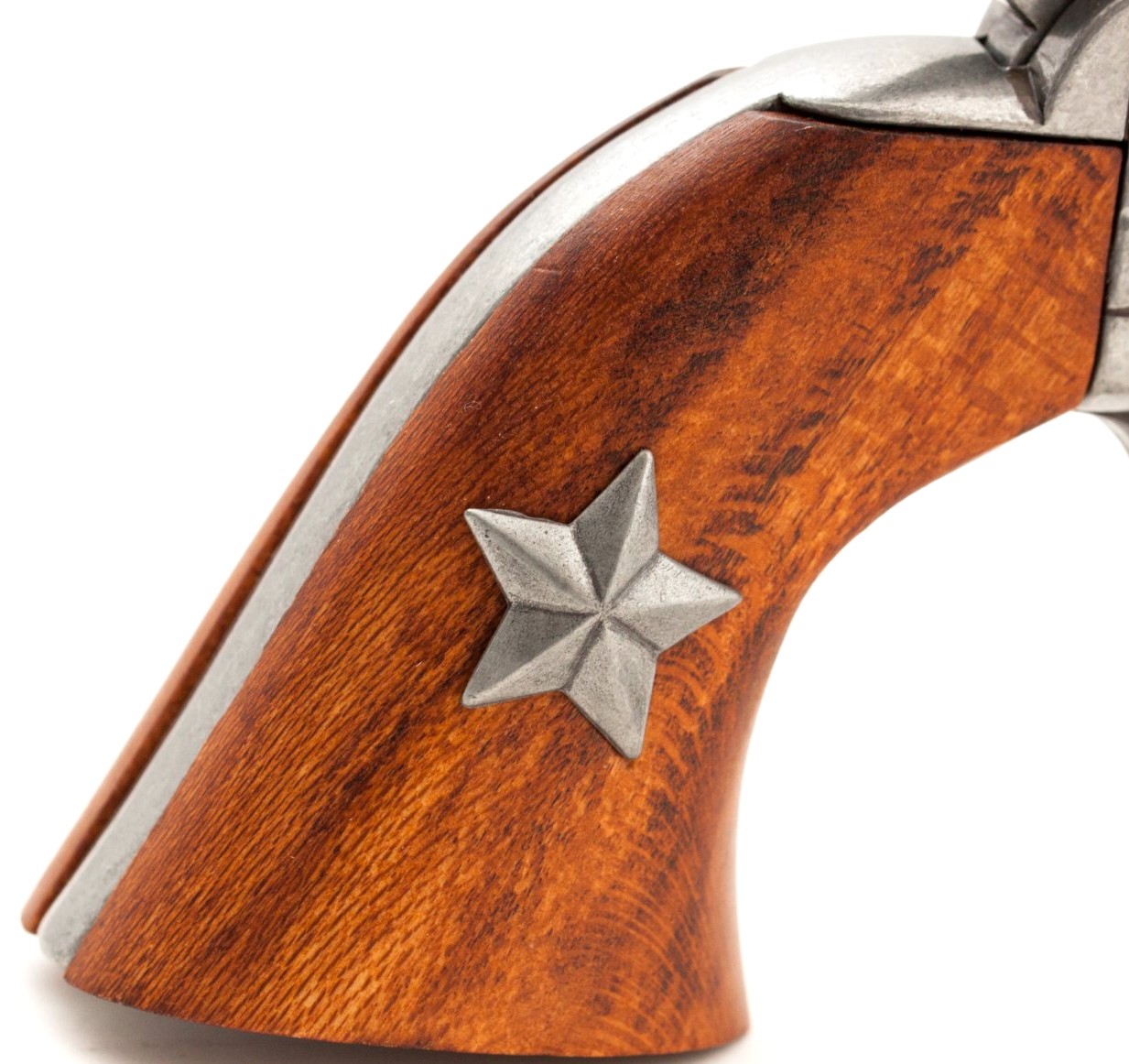 The Colt .45 Peacemaker (grey toned metal) was one of the most famous Western guns in Wild West history. Frequently associated with western icons such as Wyatt Earp, Pat Garrett, and Bat Masterson, you'll see why this is our most popular replica western gun. Our realistic replica features a 10cm barrel, wood grips, and shell ejector. With this classic military collectible, you can cock it and pull it - just like they did in the old days. This model is authentically designed - original in size, weight and appearance, and functions just like the original. Made from quality wood and metal for realism and durability, with accurate detail in look and craftsmanship.