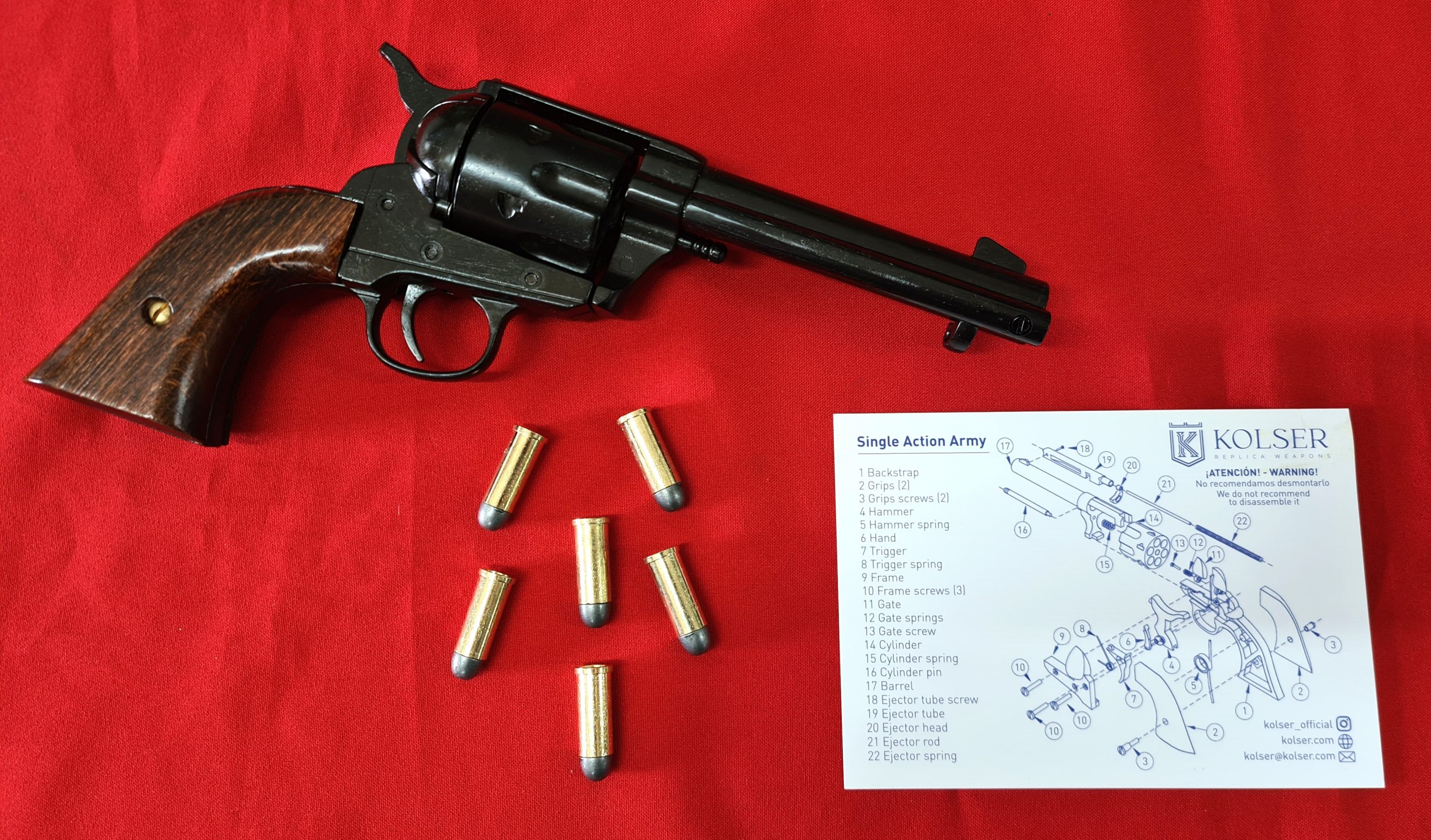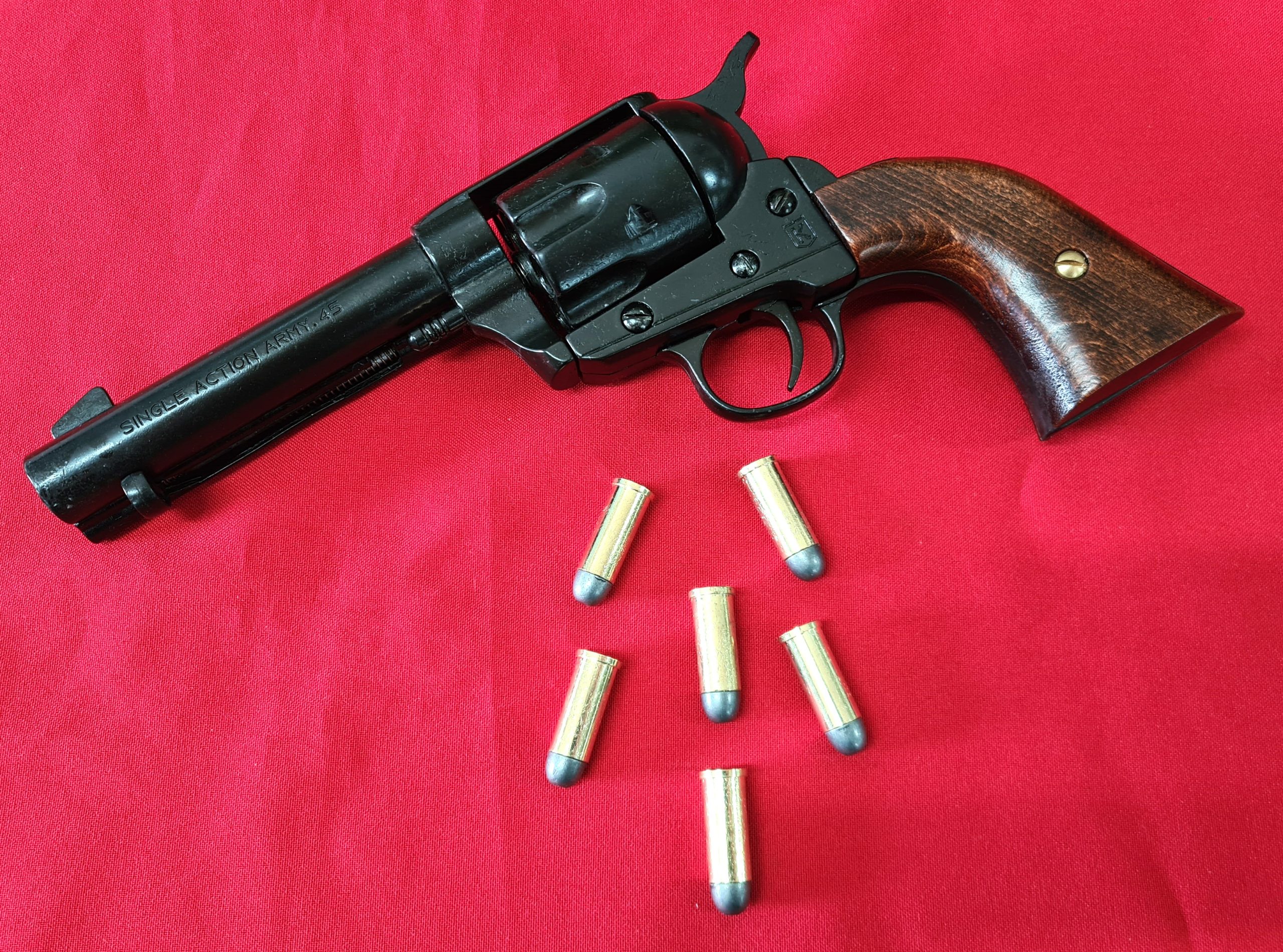 Replica Peacemaker Single Action Army 45cal Revolver. Very realistic appearance with black "blued" tone finish and wooden grips, 26cm in length, cap firing capability and comes in presentation box with 6 replica brass tone rounds with lead look bullet heads. Great addition to your collection of Replica Firearms.