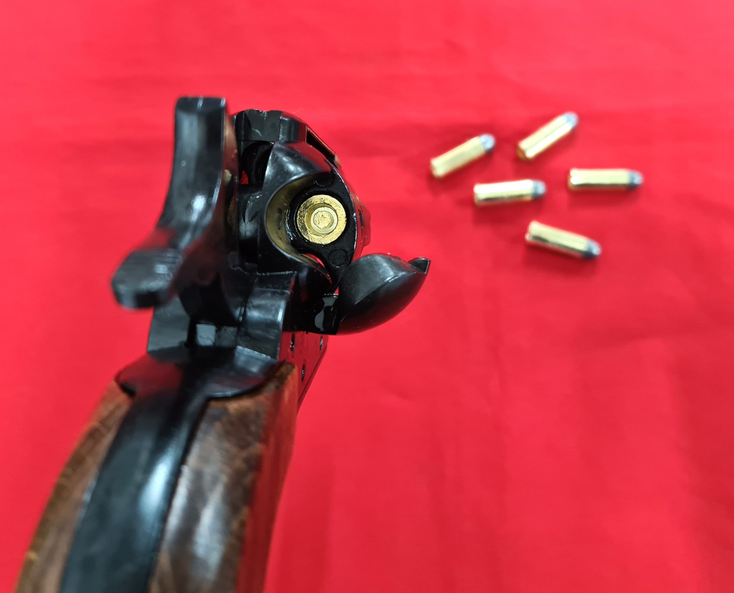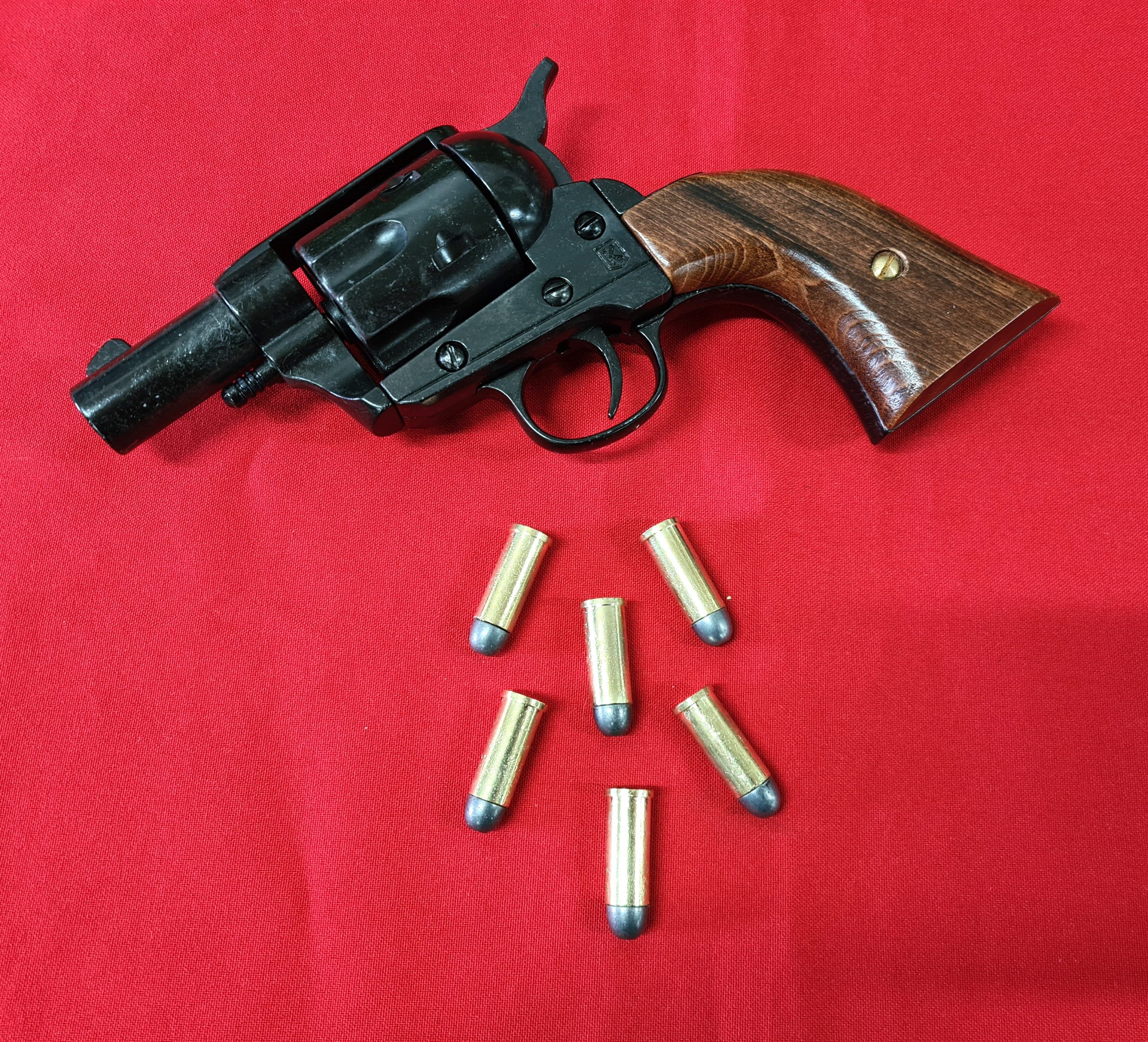 Replica Peacemaker Single Action Army 45cal Revolver with snub nose barrel. Very realistic appearance with black "blued" tone finish and wood grips with good grain pattern, 20cm in length, cap firing capability and comes in presentation box with 6 replica brass tone rounds with lead look bullet heads. Great addition to your collection of Replica Firearms.