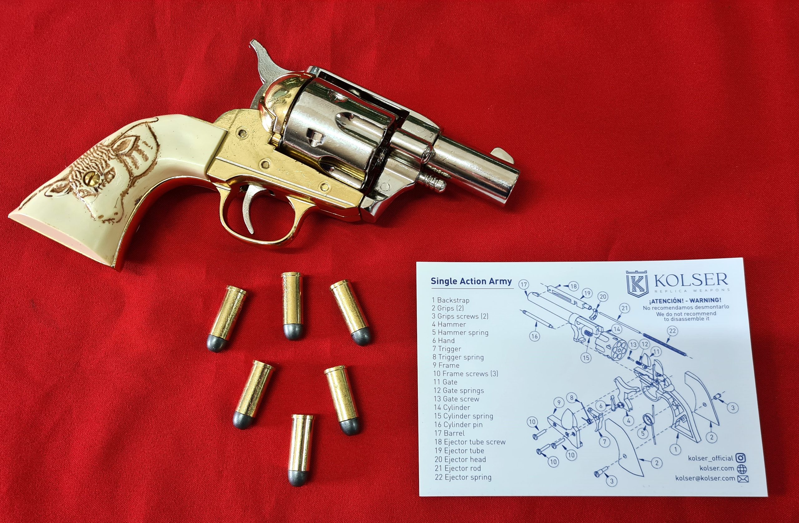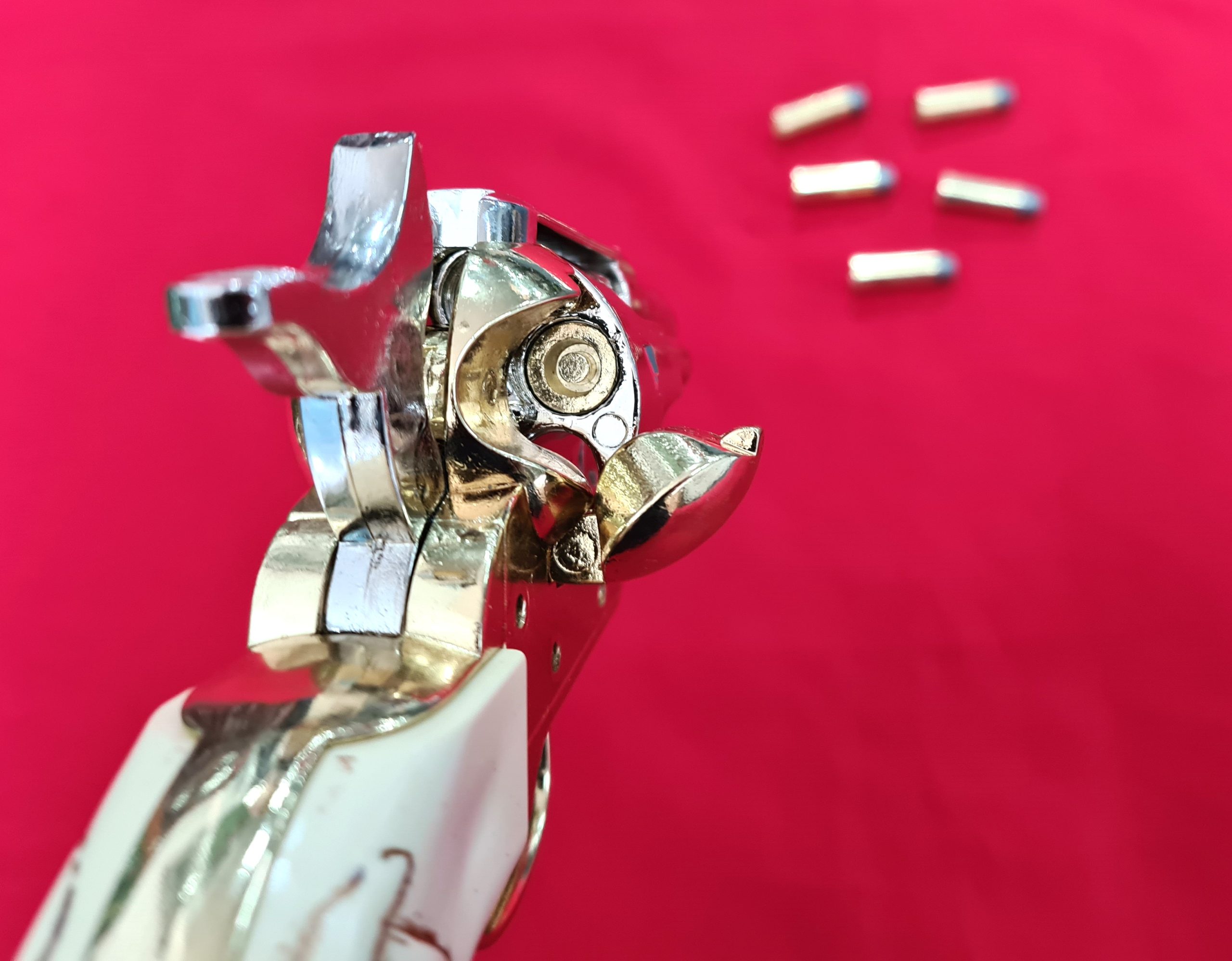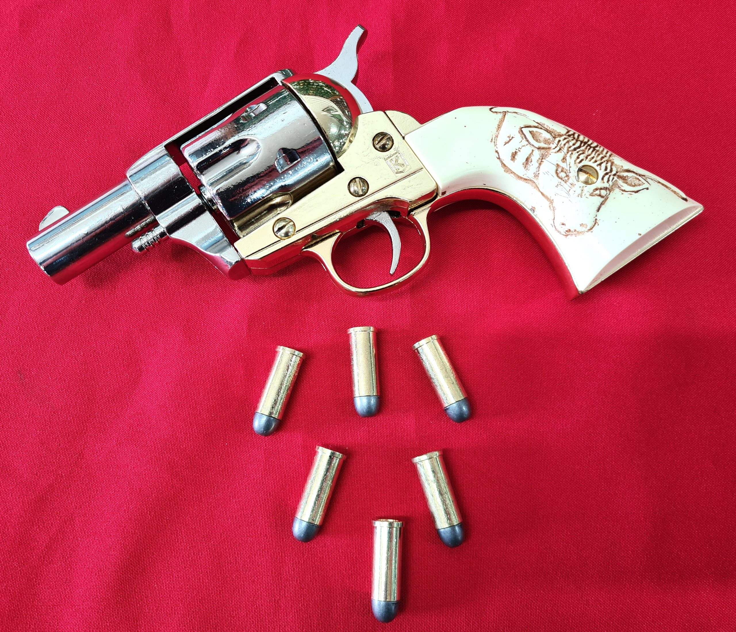Replica Peacemaker Single Action Army 45cal Revolver with snub nose barrel. Very realistic appearance with burnished steel tone finish and faux ivory raised bull handle, 20cm in length, cap firing capability and comes in presentation box with 6 replica brass tone rounds with lead look bullet heads. Great addition to your collection of Replica Firearms.