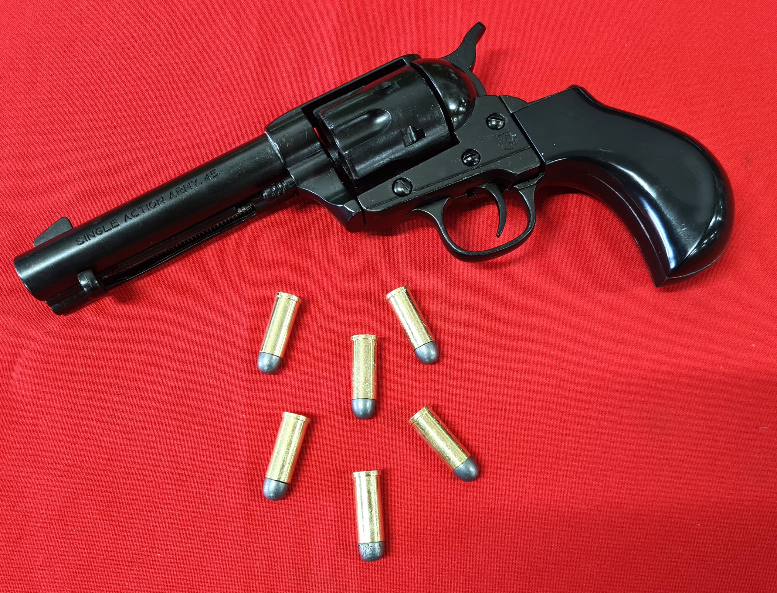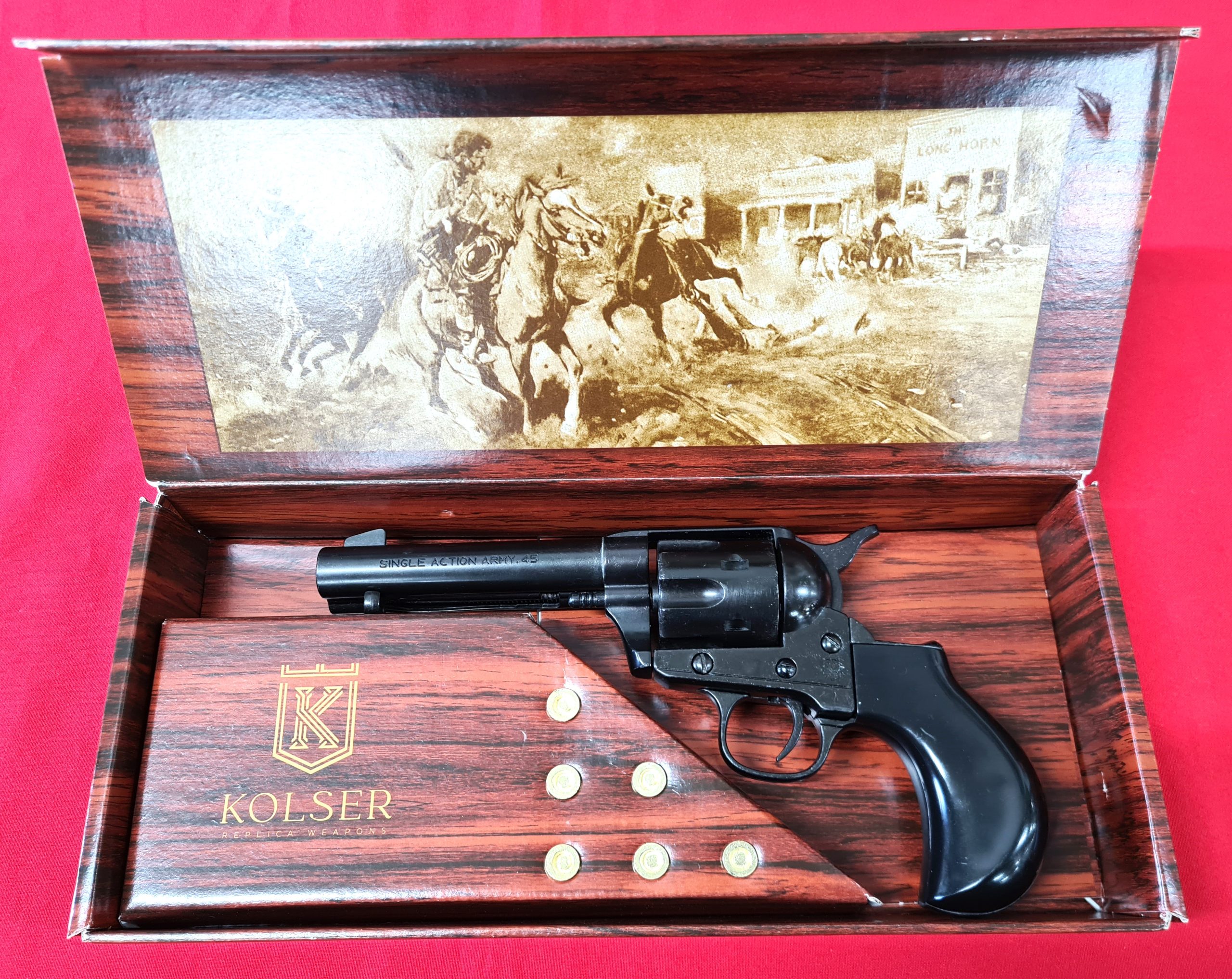 Western Thunderer Single Action Army Revolver 45 pistol with 6 cap gun bullet rounds and gift box by Kolser black with black handle. 1056 1NE