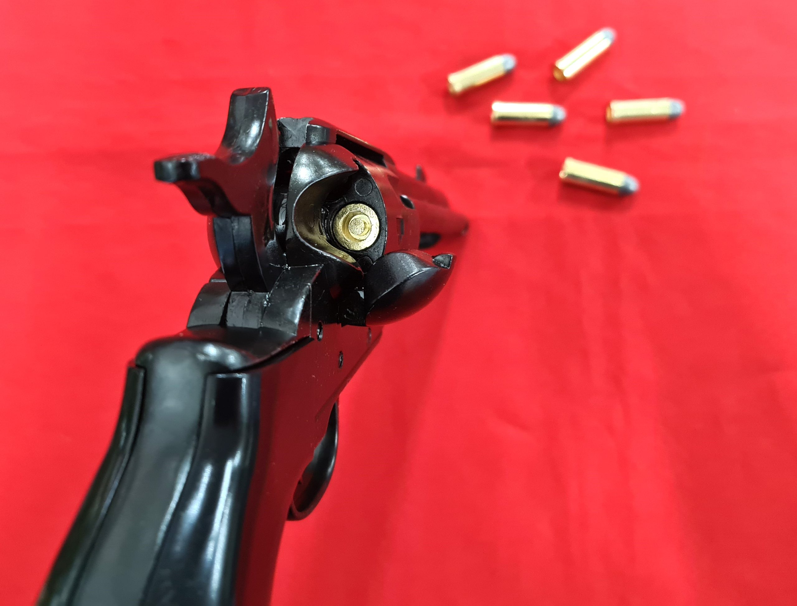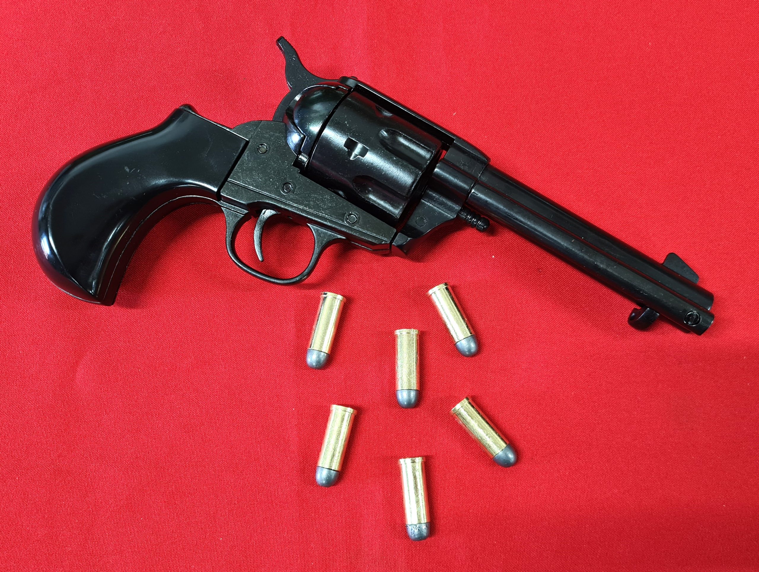 Replica Thunderer Single Action Army 45cal Revolver. Very realistic appearance with black "blued" tone finish and black grips, 24cm in length, cap firing capability and comes in presentation box with 6 replica brass tone rounds with lead look bullet heads. Great addition to your collection of Replica Firearms.