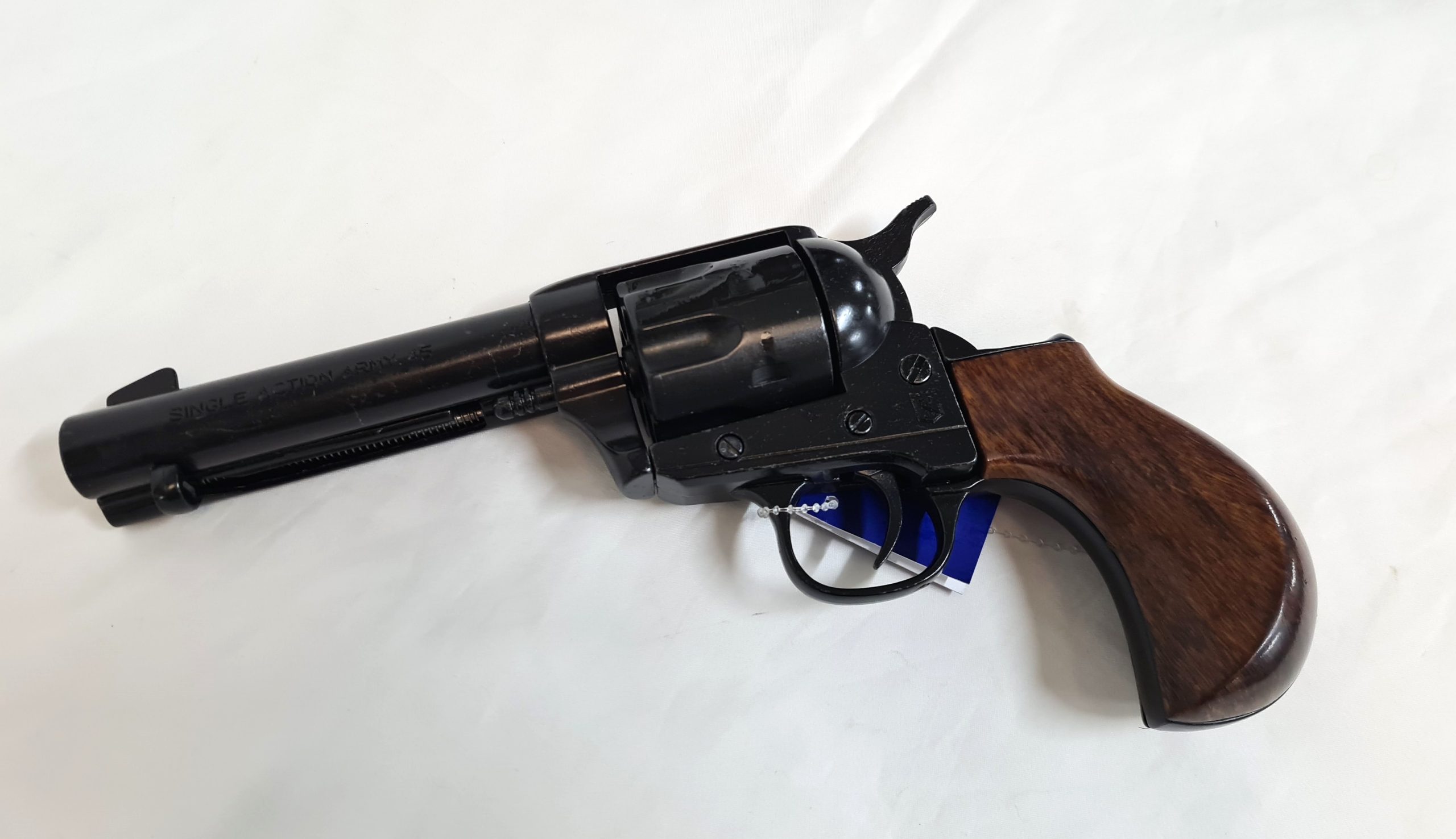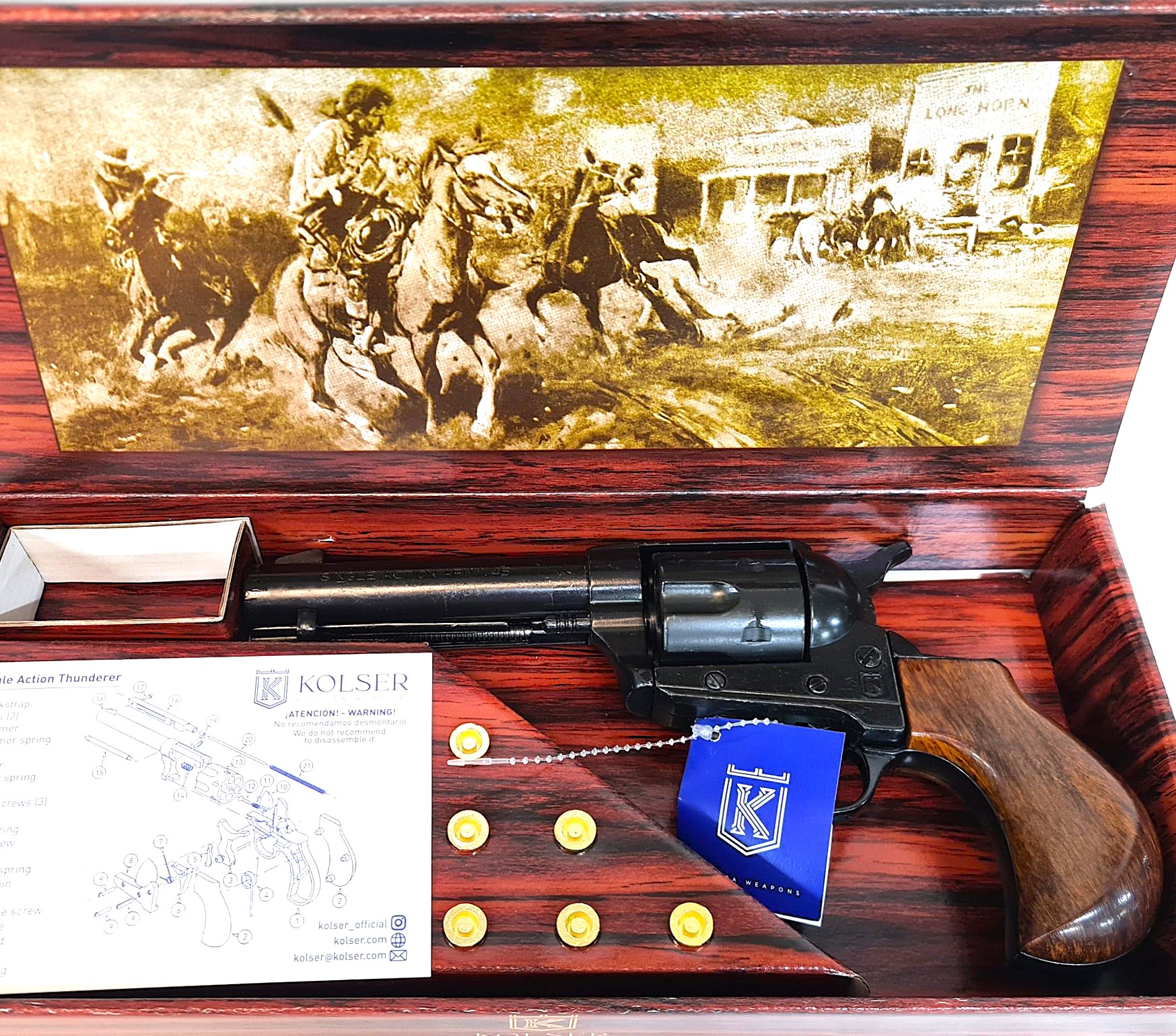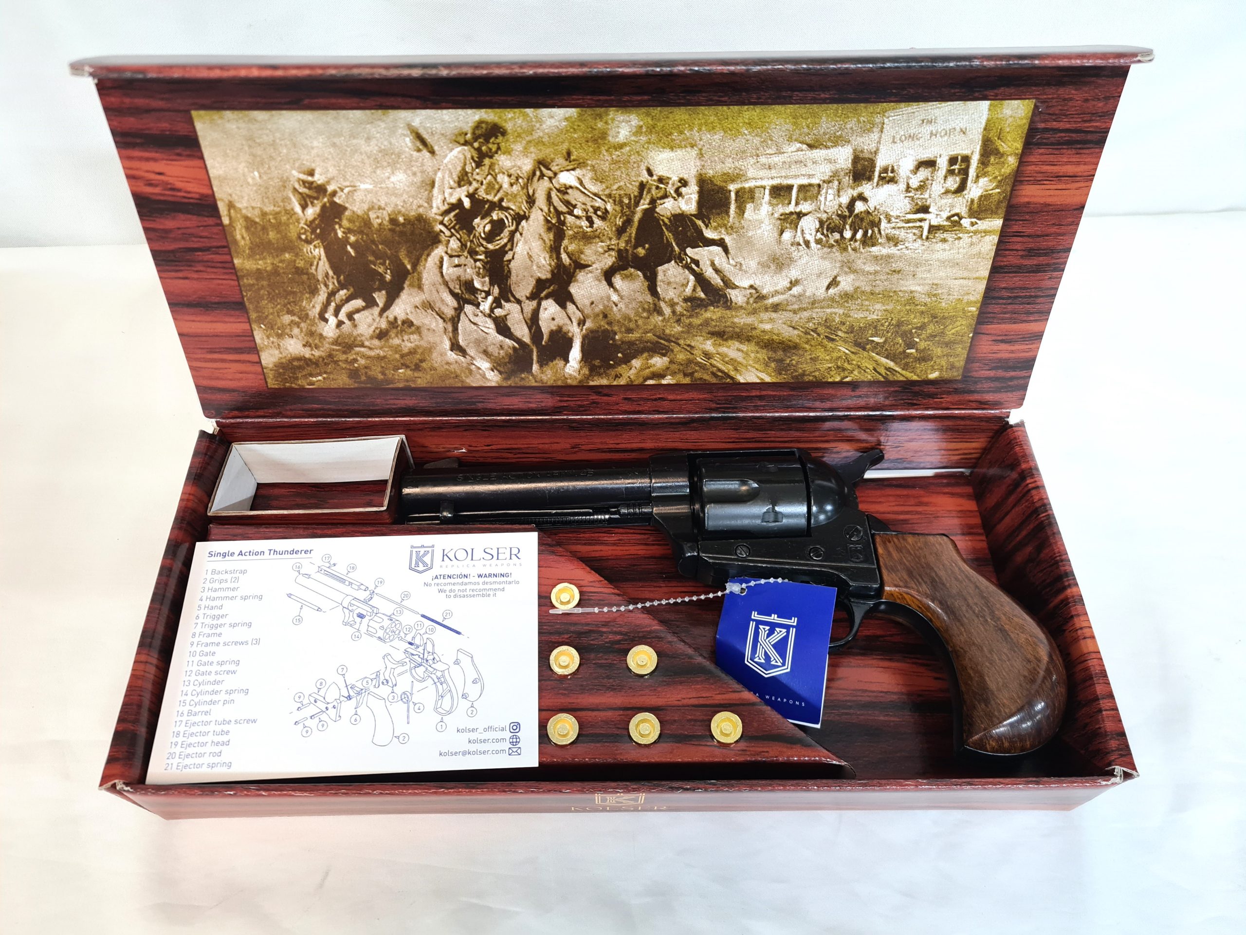 Explore the Wild West era with this Thunderer revolver replica by Kolser, an iconic single-action weapon that pays tribute to the classic Peacemaker. With its distinctive bird’s head grip and realistic mechanism, this model is a gem for collectors and history enthusiasts.