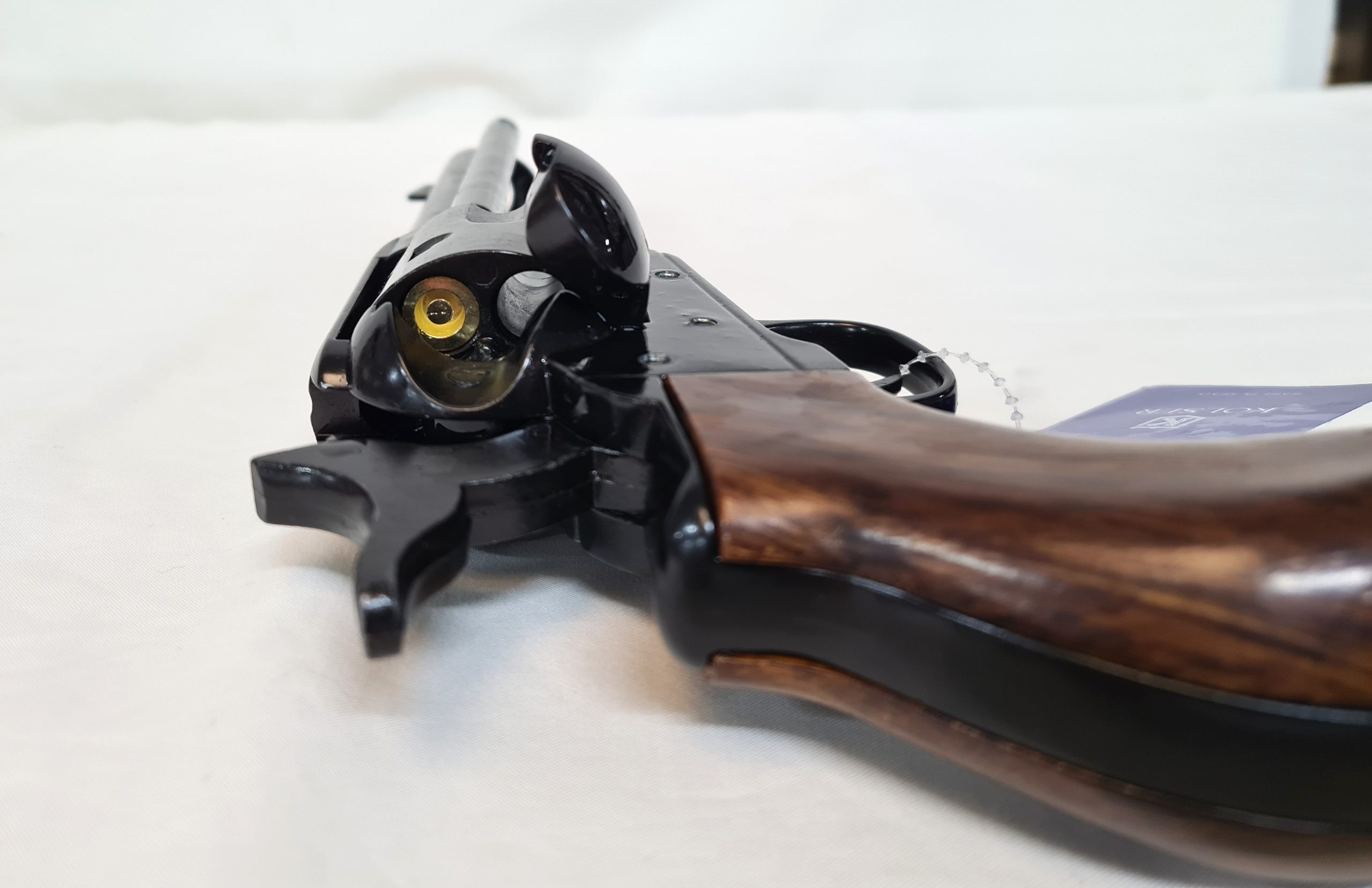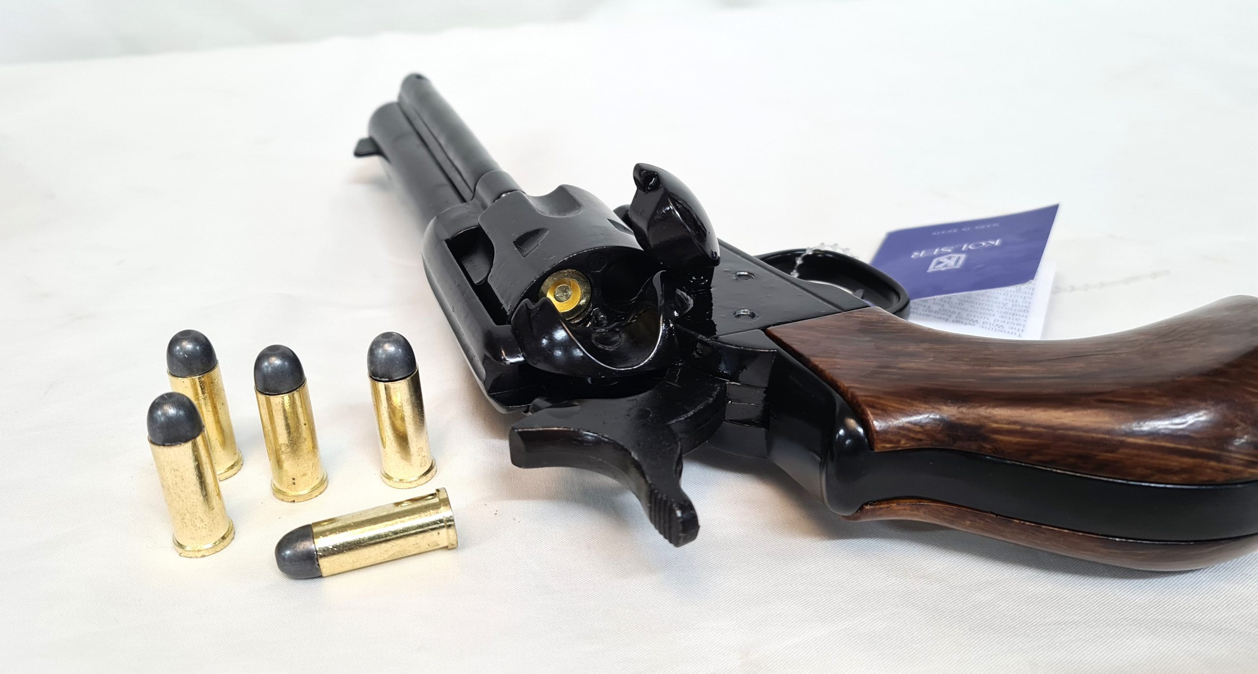 Very realistic appearance with black finish and faux wood grips, 25cm in length and comes in presentation box with 6 replica brass tone rounds with lead look bullet heads. Great addition to your collection of Replica Firearms.