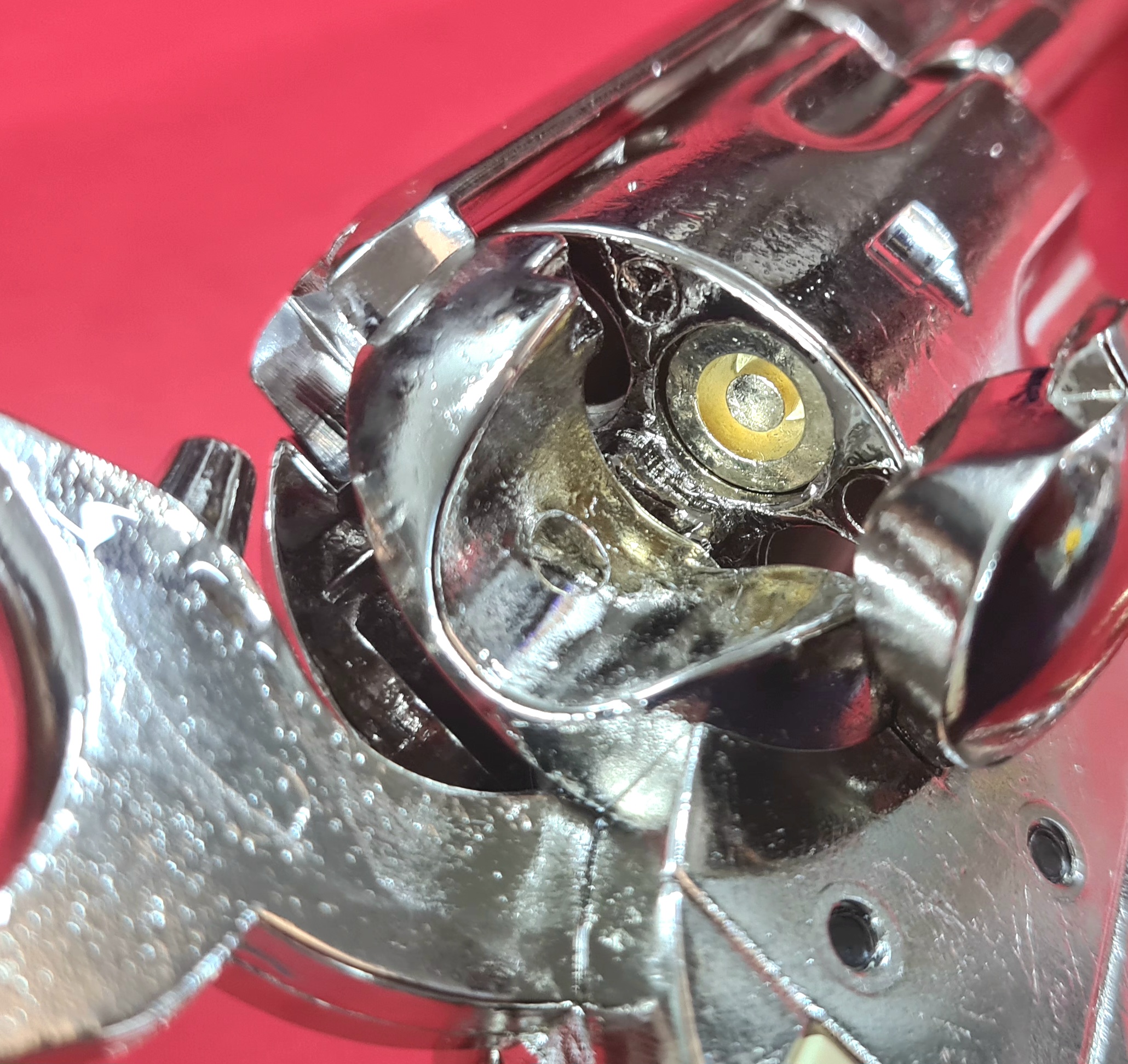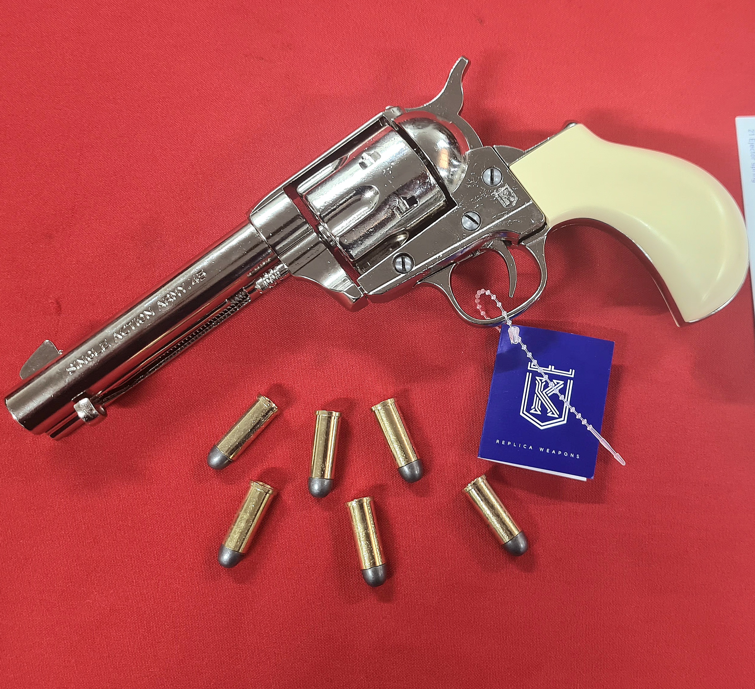 Very realistic appearance with nickel finish and faux ivory grips, 25cm in length and comes in presentation box with 6 replica brass tone rounds with lead look bullet heads. Great addition to your collection of Replica Firearms.